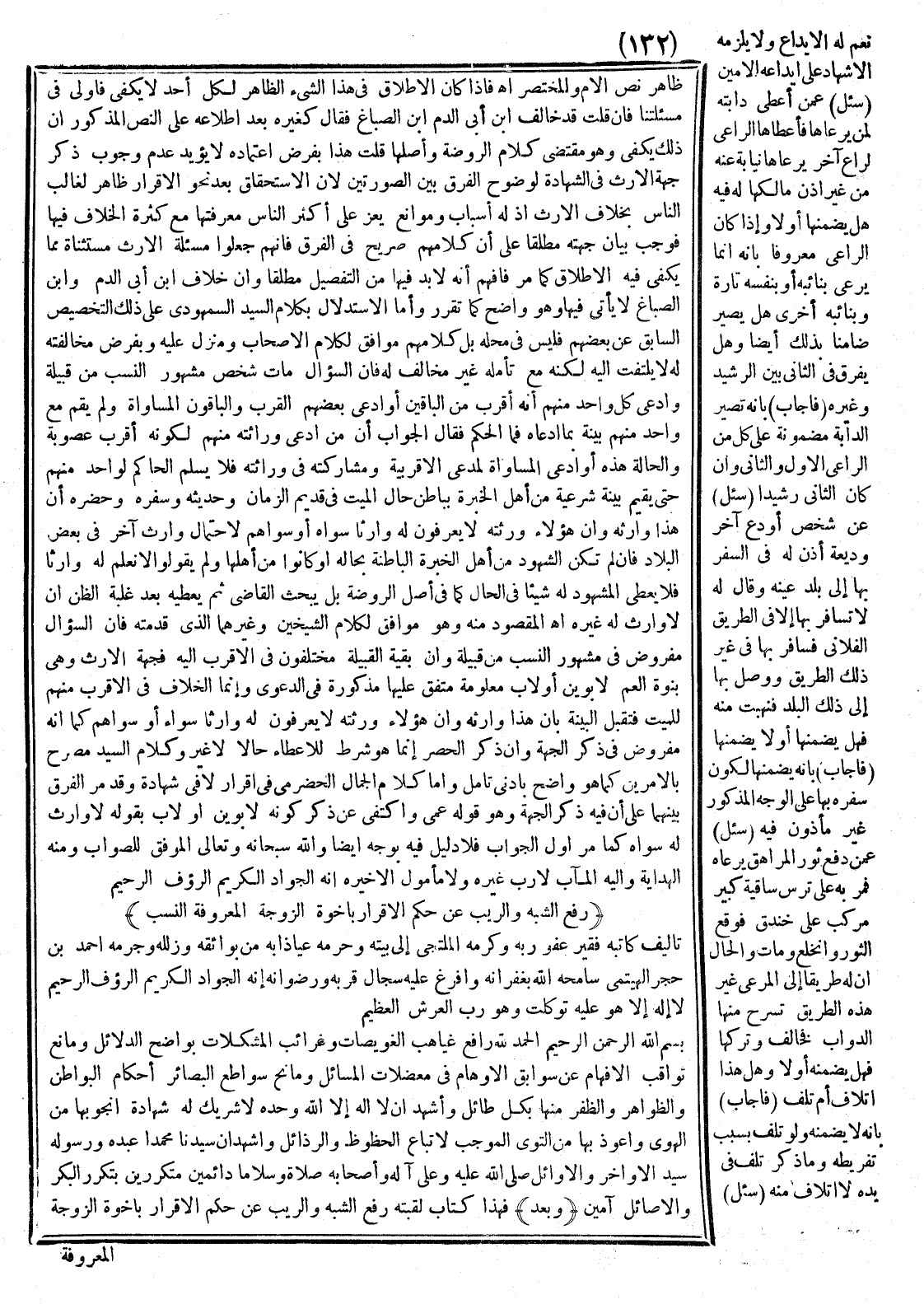 ِ تَأْلِيفُ كَاتِبِهِ فَقِيرُ عَفْوِ رَبِّهِ وَكَرَمِهِ الْمُلْتَجِئُ إلَى بَيْتِهِ وَحَرَمِهِ عِيَاذًا بِهِ مِنْ بَوَائِقِهِ وَزَلَلِهِ وَجُرْمِهِ أَحْمَدُ بْنُ حَجَرٍ الْهَيْتَمِيُّ سَامَحَهُ اللَّهُ بِغُفْرَانِهِ وَأَفْرَغَ عَلَيْهِ سِجَالَ قُرَبِهِ وَرِضْوَانِهِ إنَّهُ الْجَوَّادُ الْكَرِيمُ الرَّءُوفُ الرَّحِيمُ لَا إلَه إلَّا هُوَ عَلَيْهِ تَوَكَّلْت وَهُوَ رَبُّ الْعَرْشِ الْعَظِيمِ