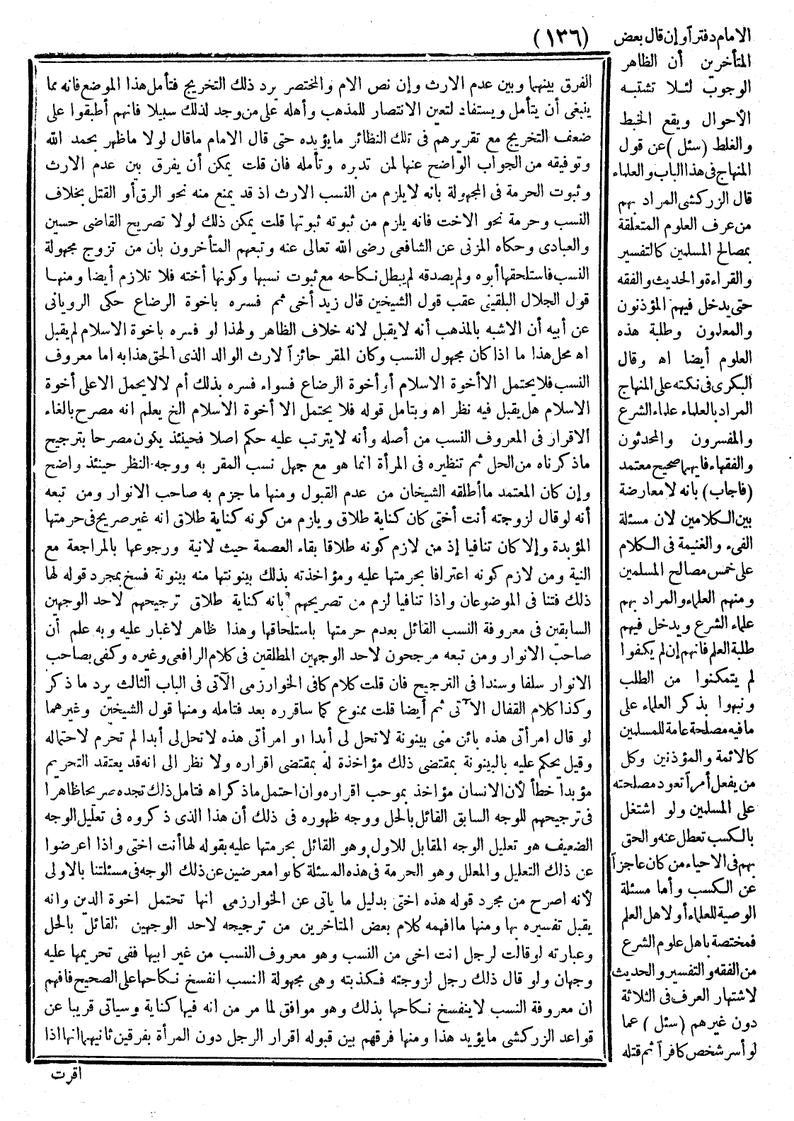 الْفَرْقُ بَيْنَهُمَا وَبَيْنَ عَدَمِ الْإِرْثِ وَأَنَّ نَصَّ الْأُمِّ وَالْمُخْتَصَرَ يَرُدُّ ذَلِكَ التَّخْرِيجَ فَتَأَمَّلْ هَذَا الْمَوْضِعَ فَإِنَّهُ مِمَّا يَنْبَغِي أَنْ يُتَأَمَّلَ وَيُسْتَفَادَ لِتَعَيُّنِ الِانْتِصَارِ لِلْمَذْهَبِ وَأَهْلِهِ عَلَى مَنْ وَجَدَ لِذَلِكَ سَبِيلًا فَإِنَّهُمْ أَطْبَقُوا عَلَى ضَعْفِ التَّخْرِيجِ مَعَ تَقْرِيرِهِمْ فِي تِلْكَ النَّظَائِرِ مَا يُؤَيِّدُهُ حَتَّى قَالَ الْإِمَامُ مَا قَالَ لَوْلَا مَا ظَهَرَ بِحَمْدِ اللَّهِ وَتَوْفِيقِهِ مِنْ الْجَوَابِ الْوَاضِحِ عَنْهَا لِمَنْ تَدَبَّرَهُ وَتَأَمَّلَهُ فَإِنْ قُلْتَ هَلْ يُمْكِنُ أَنْ يُفَرَّقَ بَيْنَ عَدَمِ الْإِرْثِ وَثُبُوتِ الْحُرْمَةِ فِي الْمَجْهُولَةِ بِأَنَّهُ لَا يَلْزَمُ مِنْ النَّسَبِ الْإِرْثُ إذْ قَدْ يَمْنَعُ مِنْهُ نَحْوُ الرِّقِّ أَوْ الْقَتْلِ بِخِلَافِ النَّسَبِ وَحُرْمَةِ نَحْوَ الْأُخْتِ فَإِنَّهُ يَلْزَمُ مِنْ ثُبُوتِهِ ثُبُوتُهَا قُلْت يُمْكِنُ ذَلِكَ لَوْلَا تَصْرِيحُ الْقَاضِي حُسَيْنٍ وَالْعَبَّادِيِّ وَحَكَاهُ الْمُزَنِيّ عَنْ الشَّافِعِيِّ - رَضِيَ اللَّهُ تَعَالَى عَنْهُ - وَتَبِعَهُمْ الْمُتَأَخِّرُونَ بِأَنَّ مَنْ تَزَوَّجَ مَجْهُولَةَ النَّسَبِ فَاسْتَلْحَقَهَا أَبُوهُ وَلَمْ يُصَدِّقْهُ لَمْ يَبْطُلْ نِكَاحُهُ مَعَ ثُبُوتِ نَسَبِهَا وَكَوْنِهَا أُخْتَهُ فَلَا تَلَازُمَ أَيْضًا وَمِنْهَا قَوْلُ الْجَلَالِ الْبُلْقِينِيُّ عَقِبَ قَوْلِ الشَّيْخَيْنِ قَالَ زَيْدٌ أَخِي مَثَلًا ثُمَّ فَسَّرَهُ بِأُخُوَّةِ الرَّضَاعِ حَكَى الرُّويَانِيُّ عَنْ أَبِيهِ أَنَّ الْأَشْبَهَ بِالْمَذْهَبِ أَنَّهُ لَا يُقْبَلُ؛ لِأَنَّهُ خِلَافُ الظَّاهِرِ وَلِهَذَا لَوْ فَسَّرَهُ بِأُخُوَّةِ الْإِسْلَامِ لَمْ يُقْبَلْ اهـ.