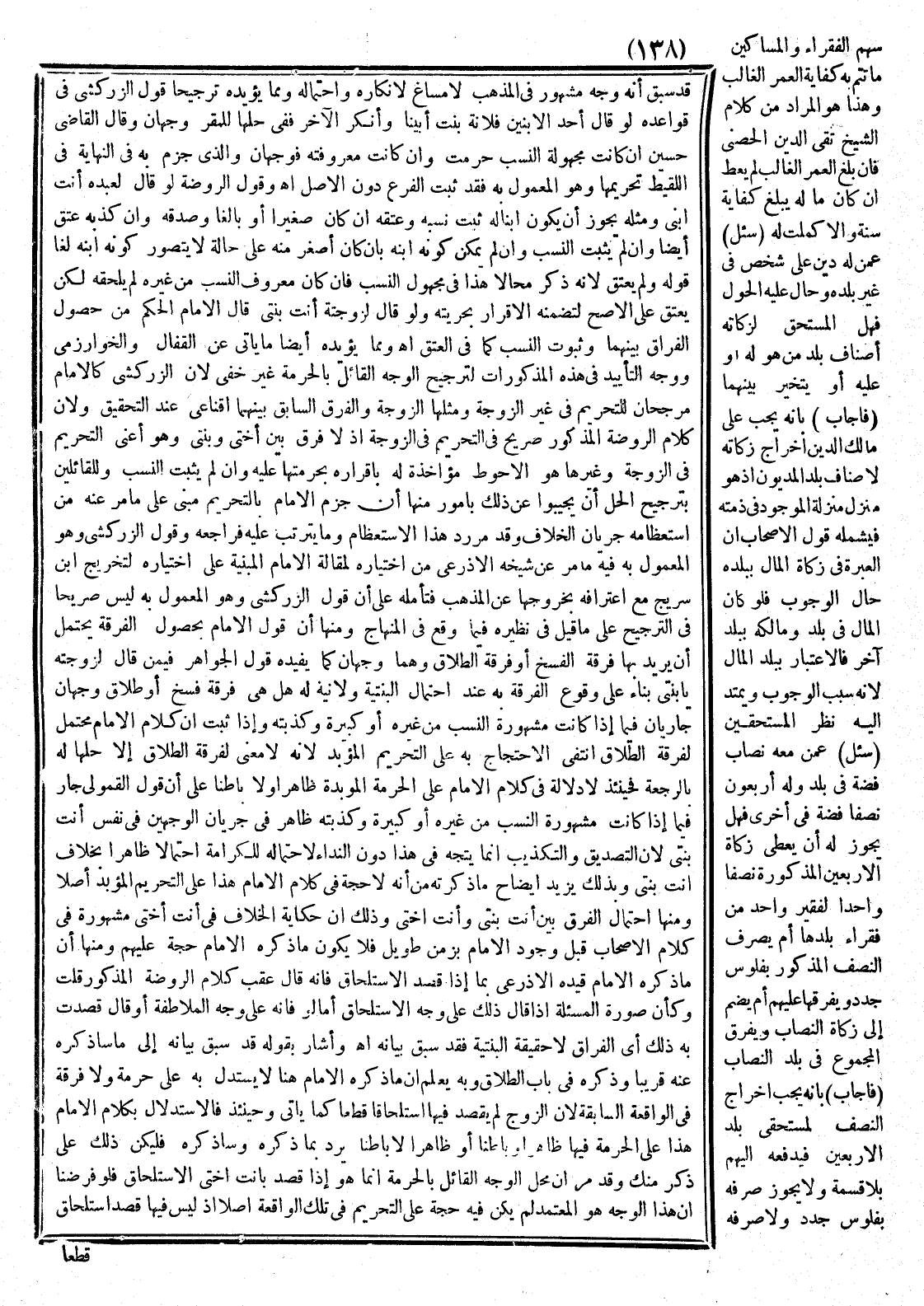 وَمِنْهَا أَنَّ قَوْلَ الْإِمَامِ بِحُصُولِ الْفُرْقَةِ يَحْتَمِلُ أَنْ يُرِيدَ بِهَا فُرْقَةَ الْفَسْخِ أَوْ فُرْقَةَ الطَّلَاقِ وَهُمَا وَجْهَانِ كَمَا يُفِيدُهُ قَوْلُ الْجَوَاهِرِ فِيمَنْ قَالَ لِزَوْجَتِهِ يَا بِنْتِي بِنَاءً عَلَى وُقُوعِ الْفُرْقَةِ بِهِ عِنْدَ احْتِمَالِ الْبِنْتِيَّةِ وَلَا نِيَّةَ لَهُ هَلْ هِيَ فُرْقَةُ فَسْخٍ أَوْ طَلَاقٍ وَجْهَانِ جَارِيَانِ فِيمَا إذَا كَانَتْ مَشْهُورَةَ النَّسَبِ مِنْ غَيْرِهِ أَوْ كَبِيرَةً وَكَذَّبَتْهُ وَإِذَا ثَبَتَ أَنَّ كَلَامَ الْإِمَام مُحْتَمِلٌ لِفُرْقَةِ الطَّلَاقِ انْتَفَى وَالِاحْتِجَاجُ بِهِ عَلَى التَّحْرِيمِ الْمُؤَبَّدِ؛ لِأَنَّهُ لَا مَعْنَى لِفُرْقَةِ الطَّلَاقِ إلَّا حِلُّهَا لَهُ بِالرَّجْعَةِ فَحِينَئِذٍ لَا دَلَالَةَ فِي كَلَامِ الْإِمَامِ عَلَى الْحُرْمَةِ الْمُؤَبَّدَةِ ظَاهِرًا وَلَا بَاطِنًا عَلَى أَنَّ قَوْلَ الْقَمُولِيِّ جَارٍ فِيمَا إذَا كَانَتْ مَشْهُورَةَ النَّسَبِ مِنْ غَيْرِهِ أَوْ كَبِيرَةً وَكَذَّبَتْهُ ظَاهِرًا فِي جَرَيَانِ الْوَجْهَيْنِ فِي نَفْسِ أَنْتِ بِنْتِي؛ لِأَنَّ التَّصْدِيقَ وَالتَّكْذِيبَ إنَّمَا يَتَّجِهُ فِي هَذَا دُونَ النِّدَاءِ لِاحْتِمَالِهِ لِلْكَرَامَةِ احْتِمَالًا ظَاهِرًا بِخِلَافِ أَنْتِ بِنْتِي وَبِذَلِكَ يَزِيدُ إيضَاح مَا ذَكَرْتُهُ مِنْ أَنَّهُ لَا حُجَّةَ فِي كَلَامِ الْإِمَامِ هَذَا عَلَى التَّحْرِيمِ الْمُؤَبَّدِ أَصْلًا وَمِنْهَا احْتِمَالُ الْفَرْقِ بَيْن أَنْتِ بِنْتِي وَأَنْتِ أُخْتِي وَذَلِكَ أَنَّ حِكَايَةَ الْخِلَافِ فِي أَنْتِ أُخْتِي مَشْهُورَةٌ فِي كَلَامِ الْأَصْحَابِ قَبْلَ وُجُودِ الْإِمَامِ بِزَمَنٍ طَوِيلٍ فَلَا يَكُونُ مَا ذَكَرَهُ الْإِمَامُ حُجَّةً عَلَيْهِمْ وَمِنْهَا أَنَّ مَا ذَكَرَهُ الْإِمَامُ قَيَّدَهُ الْأَذْرَعِيُّ بِمَا إذَا قَصَدَ الِاسْتِلْحَاقَ فَإِنَّهُ قَالَ عَقِبَ كَلَامِ الرَّوْضَةِ الْمَذْكُورِ