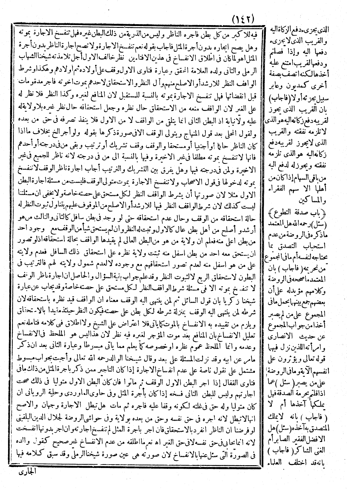 وَلَمَّا كَانَ فِي إطْلَاقِ الِانْفِسَاخِ فِي هَذَيْنِ الْإِفْتَاءَيْنِ نَظَرٌ خَالَفَ الْأَوَّلَ أَجَلُّ تَلَامِذَتِهِ شَيْخُنَا الشِّهَابُ الرَّمْلِيُّ وَالثَّانِيَ وَلَدُهُ الْعَلَّامَةُ الْمُحَقِّقُ وَعِبَارَةُ فَتَاوَى الْأَوَّلِ وَقَفَ عَلَى أَوْلَادِهِ، ثُمَّ أَوْلَادِهِمْ وَهَكَذَا وَشَرَطَ الْوَاقِفُ النَّظَرَ لِلْأَرْشَدِ أَوْ الْأَصْلَحِ مِنْهُمْ وَآلَ النَّظَرُ وَالِاسْتِحْقَاقُ لِأَحَدِهِمْ بِمَوْتِ إخْوَتِهِ فَأَجَّرَ مُدَّةً وَمَاتَ قَبْلَ انْقِضَائِهَا فَهَلْ تَنْفَسِخُ الْإِجَارَةُ بِمَوْتِهِ بِالنِّسْبَةِ لِلْمُسْتَقْبَلِ؛ لِأَنَّ الْمَنَافِعَ لِغَيْرِهِ وَكَذَا النَّظَرُ فَلَا نَظَرَ لَهُ عَلَى الْغَيْرِ؛ لِأَنَّ الْوَاقِفَ مَنَعَهُ مِنْ الِاسْتِحْقَاقِ حَالَ نَظَرِهِ وَجَعَلَ اسْتِحْقَاقَهُ حَالَ نَظَرِ غَيْرِهِ بِلَا وِلَايَةٍ لَهُ عَلَيْهِ وَلَا نِيَابَةٍ إذْ الْبَطْنُ الثَّانِي إنَّمَا يَتَلَقَّى مِنْ الْوَاقِفِ لَا مِنْ الْأَوَّلِ فَلَا يَنْفُذُ تَصَرُّفُهُ فِي حَقِّ مَنْ بَعْدَهُ.