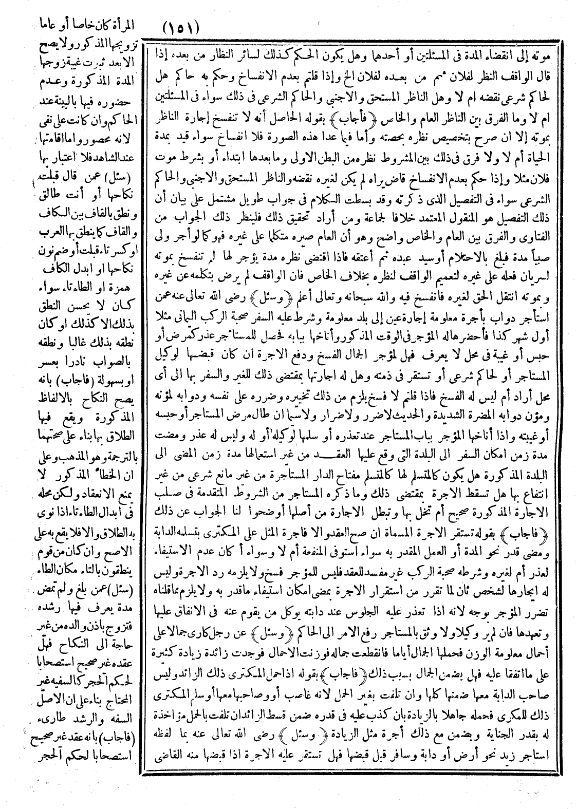 (فَأَجَابَ) بِقَوْلِهِ: الْحَاصِلُ أَنَّهُ لَا تَنْفَسِخُ إجَارَةُ النَّاظِرِ بِمَوْتِهِ إلَّا إنْ صَرَّحَ بِتَخْصِيصِ نَظَرِهِ بِحِصَّتِهِ، وَأَمَّا فِيمَا عَدَا هَذِهِ الصُّورَةَ فَلَا انْفِسَاخَ، سَوَاءٌ قَيَّدَ بِمُدَّةِ الْحَيَاةِ أَمْ لَا. وَلَا فَرْقَ فِي ذَلِكَ بَيْنَ الْمَشْرُوطِ نَظَرُهُ مِنْ الْبَطْنِ الْأُولَى وَمَا بَعْدَهَا ابْتِدَاءً أَوْ بِشَرْطِ مَوْتِ فُلَانٍ مَثَلًا، وَإِذَا حَكَمَ بِعَدَمِ الِانْفِسَاخِ قَاضٍ يَرَاهُ لَمْ يَكُنْ لِغَيْرِهِ نَقْضُهُ، وَالنَّاظِرُ الْمُسْتَحِقُّ وَالْأَجْنَبِيُّ وَالْحَاكِمُ الشَّرْعِيُّ سَوَاءٌ فِي التَّفْصِيلِ الَّذِي ذَكَرْته، وَقَدْ بَسَطْتُ الْكَلَامَ فِي جَوَابٍ طَوِيلٍ مُشْتَمِلٍ عَلَى بَيَانِ أَنَّ ذَلِكَ التَّفْصِيلَ هُوَ الْمَنْقُولُ الْمُعْتَمَدُ خِلَافًا لِجَمَاعَةٍ، وَمَنْ أَرَادَ تَحْقِيقَ ذَلِكَ فَلْيَنْظُرْ ذَلِكَ الْجَوَابَ مِنْ الْفَتَاوَى. وَالْفَرْقُ بَيْنَ الْعَامِّ وَالْخَاصِّ وَاضِحٌ وَهُوَ أَنَّ الْعَامَّ صَيَّرَهُ مُتَكَلِّمًا عَلَى غَيْرِهِ، فَهُوَ كَمَا لَوْ أَجَّرَ وَلِيٌّ صَبِيًّا مُدَّةً فَبَلَغَ بِالِاحْتِلَامِ أَوْ سَيِّدٌ عَبْدَهُ ثُمَّ أَعْتَقَهُ، فَإِذَا اقْتَضَى نَظَرُهُ مُدَّةً يُؤْجَرُ لَهَا لَمْ تَنْفَسِخْ بِمَوْتِهِ لِسَرَيَانِ فِعْلِهِ عَلَى غَيْرِهِ لِتَعْمِيمِ الْوَاقِفِ لِنَظَرِهِ بِخِلَافِ الْخَاصِّ، فَإِنَّ الْوَاقِفَ لَمْ يَرْضَ بِتَكَلُّمِهِ عَنْ غَيْرِهِ، وَبِمَوْتِهِ انْتَقَلَ الْحَقُّ لِغَيْرِهِ فَانْفَسَخَ فِيهِ، وَاَللَّهُ سُبْحَانَهُ وَتَعَالَى أَعْلَمُ.