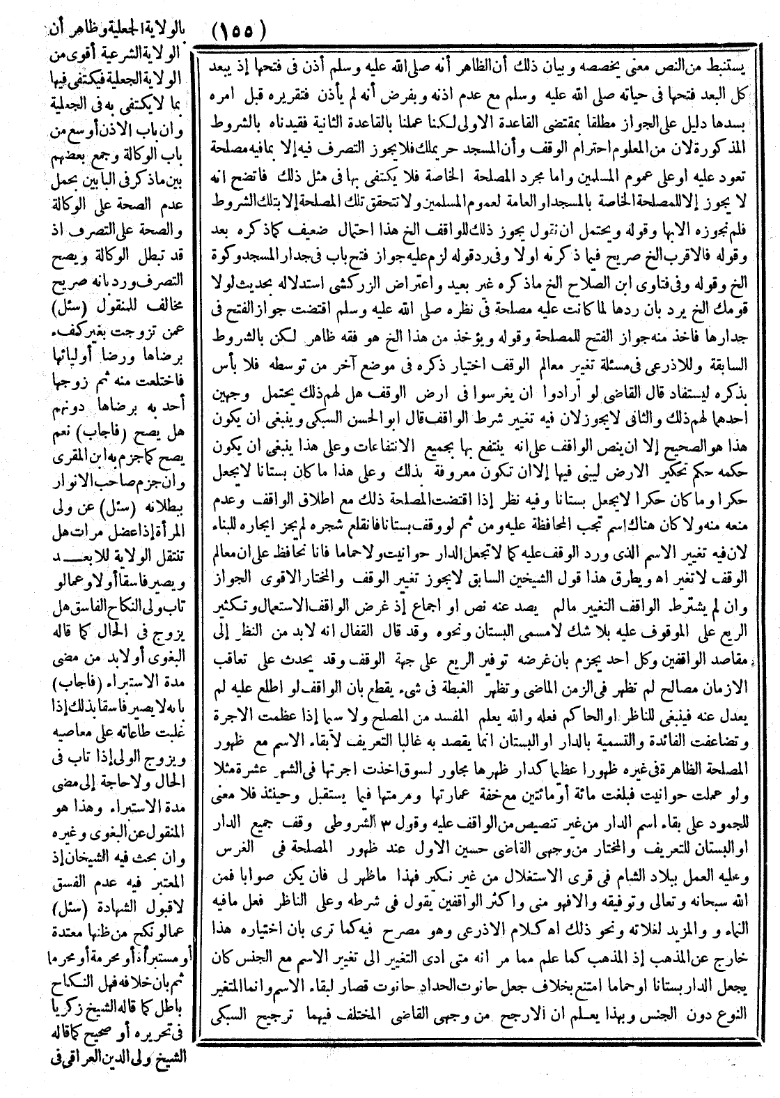 وَيَطْرُقُ هَذَا قَوْلُ الشَّيْخَيْنِ السَّابِقُ لَا يَجُوزُ تَغْيِيرُ الْوَقْفِ، وَالْمُخْتَارُ الْأَقْوَى الْجَوَازُ، وَإِنْ لَمْ يَشْتَرِطْ الْوَاقِفُ التَّغْيِيرَ مَا لَمْ يَصُدَّ عَنْهُ نَصٌّ أَوْ إجْمَاعٌ إذْ غَرَضُ الْوَاقِفِ الِاسْتِعْمَالُ وَتَكْثِيرُ الرَّيْعِ عَلَى الْمَوْقُوفِ عَلَيْهِ بِلَا شَكٍّ لَا مُسَمَّى الْبُسْتَانِ وَنَحْوِهِ، وَقَدْ قَالَ الْقَفَّالُ: إنَّهُ لَا بُدَّ مِنْ النَّظَرِ إلَى مَقَاصِدِ الْوَاقِفِينَ، وَكُلُّ أَحَدٍ يَجْزِمُ بِأَنَّ غَرَضَهُ تَوْفِيرُ الرَّيْعِ عَلَى جِهَةِ الْوَقْفِ، وَقَدْ يَحْدُثُ عَلَى تَعَاقُبِ الْأَزْمَانِ مَصَالِحُ لَمْ تَظْهَرْ فِي الزَّمَنِ الْمَاضِي وَتَظْهَرُ الْغِبْطَةُ فِي شَيْءٍ يَقْطَعُ بِأَنَّ الْوَاقِفَ لَوْ أُطْلِعَ عَلَيْهِ لَمْ يَعْدِلْ عَنْهُ فَيَنْبَغِي لِلنَّاظِرِ أَوْ الْحَاكِمِ فِعْلُهُ وَاَللَّهُ يَعْلَمُ الْمُفْسِدَ مِنْ الْمُصْلِحِ، وَلَا سِيَّمَا إذَا عَظُمَتْ الْأُجْرَةُ وَتَضَاعَفَتْ الْفَائِدَةُ، وَالتَّسْمِيَةُ بِالدَّارِ أَوْ الْبُسْتَانِ إنَّمَا يُقْصَدُ بِهِ غَالِبًا التَّعْرِيفُ لِإِبْقَاءِ الِاسْم مَعَ ظُهُورِ الْمَصْلَحَةِ الظَّاهِرَةِ فِي غَيْرِهِ ظُهُورًا عَظِيمًا، كَدَارٍ ظَهْرُهَا مُجَاوِرٌ لِسُوقٍ أُخِذَتْ أُجْرَتُهَا فِي الشَّهْر عَشَرَةً مَثَلًا، وَلَوْ عُمِلَتْ حَوَانِيتَ فَبَلَغَتْ مِائَةً أَوْ مِائَتَيْنِ مَعَ خِفَّةِ عِمَارَتِهَا وَمَرَمَّتِهَا فِيمَا يَسْتَقْبِلُ، وَحِينَئِذٍ فَلَا مَعْنًى لِلْجُمُودِ عَلَى بَقَاءِ اسْمِ الدَّارِ مِنْ غَيْرِ تَنْصِيصٍ مِنْ الْوَاقِفِ عَلَيْهِ، وَقَوْلُ الشُّرُوطِيِّ وَقْفُ جَمِيعِ الدَّارِ أَوْ الْبُسْتَانِ لِلتَّعْرِيفِ، وَالْمُخْتَارُ مِنْ وَجْهَيْ الْقَاضِي حُسَيْنٍ الْأَوَّلُ عِنْدَ ظُهُورِ الْمَصْلَحَةِ فِي الْغَرْسِ وَعَلَيْهِ الْعَمَلُ بِبِلَادِ الشَّامِ فِي قُرَى الِاسْتِغْلَالِ مِنْ غَيْرِ نَكِيرٍ، فَهَذَا مَا ظَهَرَ لِي فَإِنْ يَكُنْ صَوَابًا فَمِنْ اللَّهِ سُبْحَانَهُ وَتَعَالَى وَتَوْفِيقِهِ وَإِلَّا فَهُوَ مِنِّي، وَأَكْثَرُ الْوَاقِفِينَ يَقُولُ فِي شَرْطِهِ وَعَلَى النَّاظِرِ فِعْلُ مَا فِيهِ النَّمَاءُ وَالْمَزِيدُ لِغَلَّاتِهِ وَنَحْوَ ذَلِكَ اهـ.