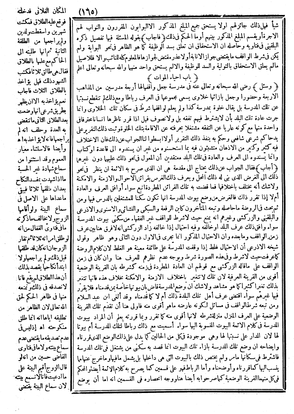 وَقَدْ أَلْغَى ابْنُ عَبْدِ السَّلَامِ وَمَنْ تَبِعَهُ شَرْطَ الْوَاقِفِ فِي مَسَائِلَ لِكَوْنِهِ عَارَضَهُ مَا هُوَ أَقْوَى مِنْهُ فَأَوْلَى هُنَا أَنْ تُقَدَّمَ تِلْكَ الْقَرِينَةُ الْوَضْعِيَّةُ عَلَى الْعُرْفِ الْمُنَزَّلِ مَنْزِلَةَ شَرْطِهِ؛ لِأَنَّهَا أَقْوَى مِنْهُ كَمَا تَقَرَّرَ وَبِمَا قَرَّرْته يُعْلَمُ أَنَّ الْمُرَادَ بِبُيُوتِ الْمَدْرَسَةِ فِي كَلَامِ الْأَئِمَّةِ الْبُيُوتُ الْمَنْسُوبَةُ إلَيْهَا، سَوَاءٌ أَسُمِّيَتْ مَعَ ذَلِكَ رِبَاطًا لِتِلْكَ الْمَدْرَسَةِ أَمْ بُيُوتًا لَهَا؛ لِأَنَّ الْمَدَارَ عَلَى نِسْبَتِهَا لَهَا وَهِيَ مَوْجُودَةٌ فِي كُلٍّ مِنْ الْحَالَيْنِ كَمَا يَدُلُّ عَلَى ذَلِكَ الْوَضْعُ الَّذِي قَرَّرْنَاهُ، وَإِيضَاحُهُ أَنَّ وَضْعَ تِلْكَ الْمَدْرَسَةِ بِإِزَاءِ تِلْكَ الْبُيُوتِ إنَّمَا قُصِدَ بِهِ سُكْنَى مَنْ يَشْتَغِلُ فِي تِلْكَ الْمَدْرَسَةِ فَاشْتُرِطَ فِي سَكَنِهَا مَا مَرَّ وَلَمْ يَخْتَصَّ ذَلِكَ بِالْبُيُوتِ الَّتِي هِيَ دَاخِلُهَا، بَلْ يَشْمَلُ مَا فِيهَا وَمَا خَرَجَ عَنْهَا مِمَّا يُنْسَبُ إلَيْهَا كَمَا قَرَّرْنَاهُ وَأَوْضَحْنَاهُ، وَأَمَّا الرِّبَاطُ فَهُوَ عَلَى قِسْمَيْنِ كَمَا يُصَرِّحُ بِهِ كَلَامُ الْأَئِمَّةِ أَيْضًا، وَالْمُحَكَّمُ فِي كُلٍّ مِنْهُمَا الْقَرِينَةُ الْوَضْعِيَّةُ كَمَا صَرَّحُوا بِهِ أَيْضًا هُنَا، وَوَجْهُ انْحِصَارِهِ فِي الْقِسْمَيْنِ أَنَّهُ إمَّا أَنْ يُوضَعَ