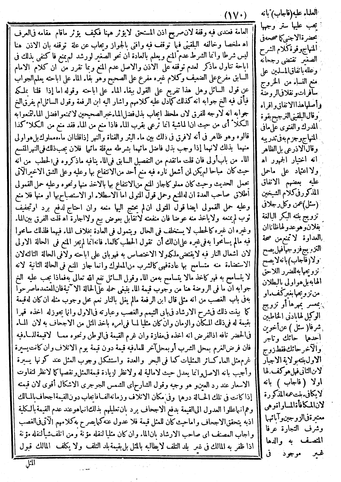 مُلَخَّصًا وَخَالَفَهُ الْبُلْقِينِيُّ فِيمَا تَوَقَّفَ فِيهِ وَأَفْتَى بِالْجَوَازِ وَيُجَابُ عَنْ عِلَّةِ تَوَقُّفِهِ بِأَنَّ الْإِذْنَ هُنَا لَيْسَ شَرْطًا، وَإِنَّمَا الشَّرْطُ عَدَمُ الْمَنْعِ وَيُعْلَمُ بِالْعَادَةِ أَنَّ نَحْوَ الصَّغِيرِ لَوْ رَشَدَ لَمْ يُمْنَعْ، فَاكْتُفِيَ بِذَلِكَ فِي إبَاحَةِ تَنَاوُلِ مَا ذُكِرَ لِعَدَمِ تَوَقُّفِهِ عَلَى الْإِذْنِ، وَالْأَصْلُ عَدَمُ الْمَنْعِ وَبِمَا تَقَرَّرَ مِنْ أَنَّ كَلَامَ الْإِمَامِ السَّابِقِ مُفَرَّعٌ عَلَى الصَّحِيحِ وَهُوَ بَقَاءُ الْمَاءِ عَلَى إبَاحَتِهِ يُعْلَمُ الْجَوَابُ عَنْ قَوْلِ السَّائِلِ وَهَلْ هَذَا تَفْرِيعٌ عَلَى الْقَوْلِ بِبَقَاءِ الْمَاءِ عَلَى إبَاحَتِهِ وَقَوْلُهُ، أَمَّا إذَا قُلْنَا بِمِلْكِهِ فَيَأْتِي فِيهِ إلَخْ جَوَابُهُ أَنَّهُ كَذَلِكَ كَمَا دَلَّ عَلَيْهِ كَلَامُهُمْ وَأَشَارَ إلَيْهِ ابْنُ الرِّفْعَةِ وَقَوْلُ السَّائِلِ: أَمْ يُفَرَّقُ إلَخْ جَوَابُهُ أَنَّهُ لَا وَجْهَ لِلْفَرْقِ؛ لِأَنَّ مَلْحَظَ إيجَابِ بَذْلِ فَضْلِ الْمَاءِ خَبَرُ الصَّحِيحَيْنِ «لَا تَمْنَعُوا فَضْلَ الْمَاءِ لِتَمْنَعُوا بِهِ الْكَلَأَ» أَيْ: مِنْ حَيْثُ إنَّ الْمَاشِيَةَ إنَّمَا تَرْعَى بِقُرْبِ الْمَاءِ، فَإِذَا مَنَعَ مِنْ الْمَاءِ فَقَدْ مَنَعَ مِنْ الْكَلَإِ كَذَا قَالُوهُ وَهُوَ ظَاهِرٌ فِي أَنَّهُ لَا فَرْقَ فِي ذَلِكَ بَيْنَ مَاءِ الْبِئْرِ وَالْقَنَاةِ وَالنَّهْرِ إذَا قُلْنَا إنَّ مَاءَهُ مَمْلُوكٌ