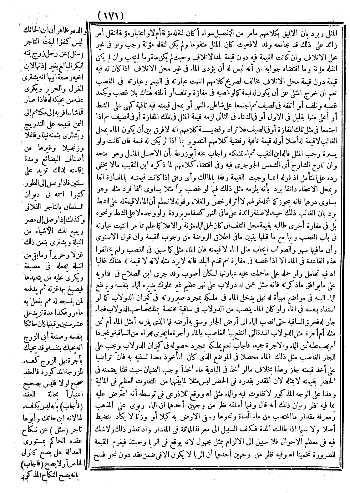 (فَأَجَابَ) : نَعَمْ يَمْلِكُهُ بِمُجَرَّدِ حُصُولِهِ فِي كِيزَانِ الدُّولَابِ، وَيَجِبُ عَلَى الْجَارِ الْغَاصِبِ مِثْلُ ذَلِكَ الْمَاءِ مُحَصَّلًا فِي الْمَوْضِعِ الَّذِي كَانَ الْمَأْخُوذُ مُعَدَّ السُّقْيَةِ بِهِ، فَإِنْ تَرَاضَيَا عَلَى أَخْذِ قِيمَتِهِ جَازَ، وَهَذَا بِخِلَافِ مَا لَوْ أَخَذَ فِي الْبَادِيَةِ مَاءً أَخْذًا يُوجِبُ الضَّمَانَ حَيْثُ قُلْنَا يَضْمَنُهُ فِي الْحَضَرِ بِقِيمَتِهِ لَا بِمِثْلِهِ؛ لِأَنَّ الْمُقَدَّرَ بِقَدْرِهِ فِي الْحَضَرِ لَيْسَ مِثْلًا لِمَا بَيْنَهُمَا مِنْ التَّفَاوُتِ الْعَظِيمِ فِي الْمَالِيَّةِ، وَهَذَا عَلَى الْوَجْهِ الْمَذْكُورِ لَا تَفَاوُتَ فِيهِ وَالْمَاءُ مِثْلِيٌّ اهـ.