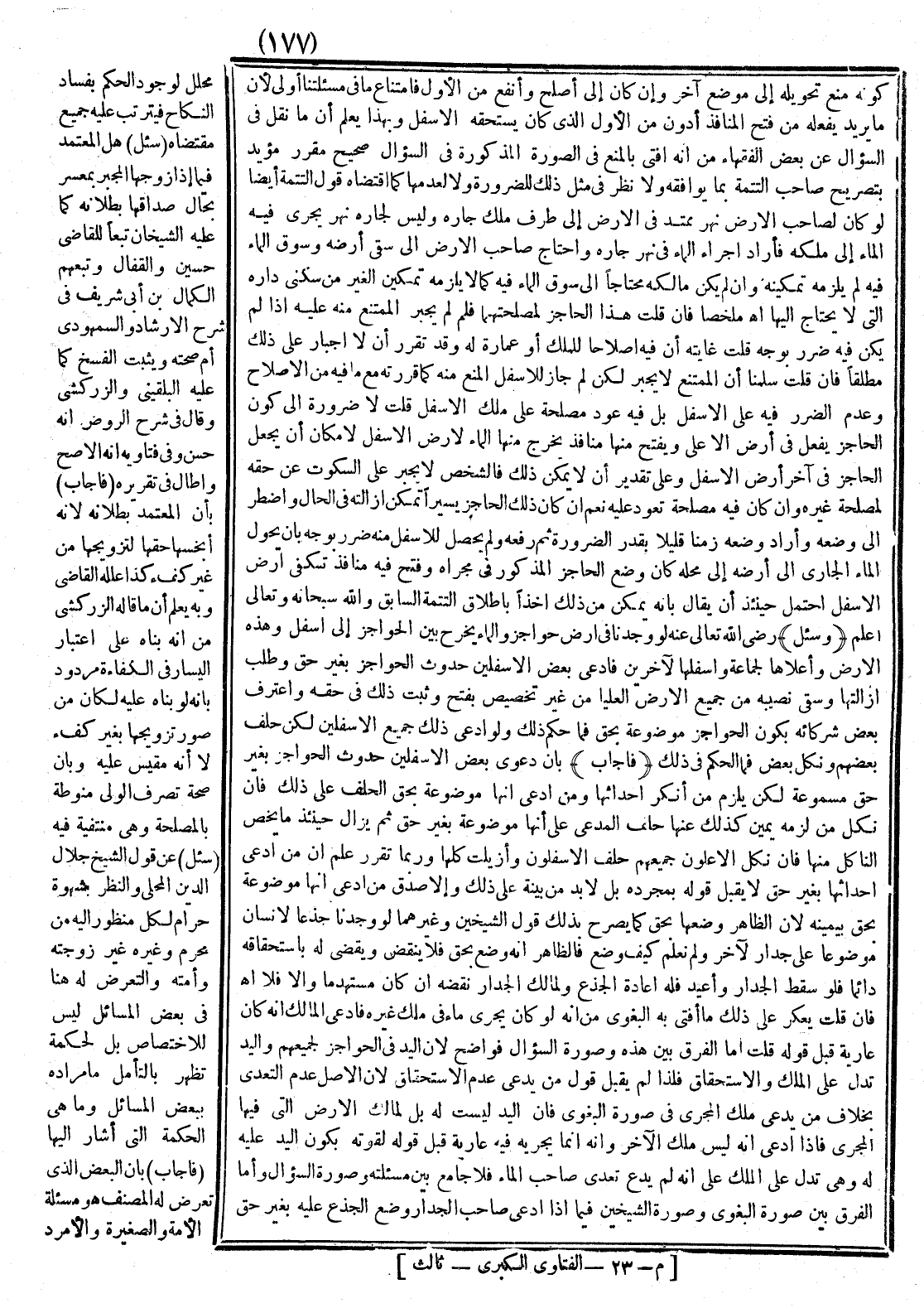 (فَأَجَابَ) بِأَنَّ دَعْوَى بَعْضِ الْأَسْفَلِينَ حُدُوثَ الْحَوَاجِزِ بِغَيْرِ حَقٍّ مَسْمُوعَةٌ، لَكِنْ يَلْزَمُ مَنْ أَنْكَرَ إحْدَاثُهَا وَمَنْ ادَّعَى أَنَّهَا مَوْضُوعَةٌ بِحَقِّ الْحَلِفِ عَلَى ذَلِكَ فَإِنْ نَكَلَ مَنْ لَزِمَهُ يَمِينٌ كَذَلِكَ عَنْهَا حَلَفَ الْمُدَّعِي عَلَى أَنَّهَا مَوْضُوعَةٌ بِغَيْرِ حَقٍّ، ثُمَّ يُزَالُ حِينَئِذٍ مَا يَخُصُّ النَّاكِلَ مِنْهَا فَإِنْ نَكَلَ الْأَعْلَوْنَ جَمِيعُهُمْ حَلَفَ الْأَسْفَلُونَ وَأُزِيلَتْ كُلُّهَا، وَبِمَا تَقَرَّرَ عُلِمَ أَنَّ مَنْ ادَّعَى إحْدَاثَهَا بِغَيْرِ حَقٍّ لَا يُقْبَلُ قَوْلُهُ بِمُجَرَّدِهِ، بَلْ لَا بُدَّ مِنْ بَيِّنَةٍ عَلَى ذَلِكَ وَإِلَّا صُدِّقَ مَنْ ادَّعَى أَنَّهَا مَوْضُوعَةٌ بِحَقٍّ بِيَمِينِهِ؛ لِأَنَّ الظَّاهِرَ وَضْعُهَا بِحَقٍّ كَمَا يُصَرِّحُ بِذَلِكَ قَوْلُ الشَّيْخَيْنِ وَغَيْرِهِمَا لَوْ وَجَدْنَا جِذْعًا لِإِنْسَانٍ مَوْضُوعًا عَلَى جِدَارٍ لِآخَرَ وَلَمْ نَعْلَمْ كَيْفَ وُضِعَ فَالظَّاهِرُ أَنَّهُ وُضِعَ بِحَقٍّ فَلَا يُنْقَضُ وَيُقْضَى لَهُ بِاسْتِحْقَاقِهِ دَائِمًا فَلَوْ سَقَطَ الْجِدَارُ وَأُعِيدَ فَلَهُ إعَادَةُ الْجِذْعِ وَلِمَالِك الْجِدَارِ نَقْضُهُ إنْ كَانَ مُتَهَدِّمًا وَإِلَّا فَلَا اهـ. فَإِنْ قُلْت: يُعَكِّرُ عَلَى ذَلِكَ مَا أَفْتَى بِهِ الْبَغَوِيّ مِنْ أَنَّهُ لَوْ كَانَ يَجْرِي مَاءٌ فِي مِلْكِ غَيْرِهِ فَادْعِي الْمَالِكُ أَنَّهُ كَانَ عَارِيَّةً قُبِلَ قَوْلُهُ، قُلْت: أَمَّا الْفَرْقُ بَيْنَ هَذِهِ وَصُورَةِ السُّؤَالِ فَوَاضِحٌ؛ لِأَنَّ الْيَدَ فِي الْحَوَاجِزِ لِجَمِيعِهِمْ وَالْيَدُ تَدُلُّ عَلَى الْمِلْكِ وَالِاسْتِحْقَاقِ؛ فَلِذَا لَمْ يُقْبَلْ قَوْلُ مَنْ يَدَّعِي عَدَمَ الِاسْتِحْقَاقِ؛ لِأَنَّ الْأَصْلَ عَدَمُ التَّعَدِّي بِخِلَافِ مَنْ يَدَّعِي مِلْكَ الْمَجْرَى فِي صُورَةِ الْبَغَوِيِّ، فَإِنَّ الْيَدَ لَيْسَتْ لَهُ بَلْ لِمَالِك الْأَرْضِ الَّتِي فِيهَا الْمَجْرَى، فَإِذَا ادَّعَى أَنَّهُ لَيْسَ مِلْكَ الْآخَرِ وَأَنَّهُ إنَّمَا يُجْرِيه فِيهِ عَارِيَّةً قُبِلَ قَوْلُهُ لِقُوَّتِهِ بِكَوْنِ الْيَدِ عَلَيْهِ لَهُ