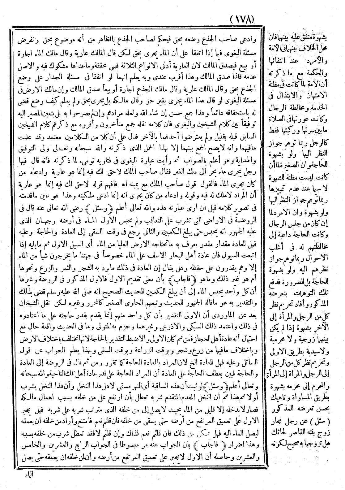 (فَأَجَابَ) بِأَنَّ مَعْنَى تَقْدِيمِ الْأَوَّلِ، فَالْأَوَّلُ الْمَذْكُورُ فِي الرَّوْضَةِ وَغَيْرِهَا أَنَّ كُلَّ وَاحِدٍ يَحْبِسُ الْمَاءَ إلَى أَنْ يَبْلُغَ الْكَعْبَيْنِ لِلْحَدِيثِ الصَّحِيحِ أَنَّهُ - صَلَّى اللَّهُ عَلَيْهِ وَسَلَّمَ - قَضَى بِذَلِكَ، وَالتَّقْدِيرُ بِهِ هُوَ مَا قَالَهُ الْجُمْهُورُ لِلْحَدِيثِ وَتَبِعَهُمْ الْحَاوِي الصَّغِيرُ كَالْمُحَرَّرِ وَغَيْرِهِ، لَكِنْ نَقَلَ الشَّيْخَانِ بَعْدُ عَنْ الْمَاوَرْدِيُّ أَنَّ الْأَوْلَى التَّقْدِيرُ بِأَنَّ كُلَّ وَاحِدٍ مِنْهُمْ إنَّمَا يُقَدِّمُ بِقَدْرِ حَاجَتِهِ عَلَى مَا اعْتَادُوهُ فِي ذَلِكَ، وَاعْتَمَدَ ذَلِكَ السُّبْكِيّ وَالْأَذْرَعِيُّ وَغَيْرُهُمَا وَجَزَمَ بِهِ الْمُتَوَلِّي، وَمَا فِي الْحَدِيثِ وَاقِعَةُ حَالٍ مَعَ احْتِمَالِ أَنَّهُ عَادَةُ أَهْلِ الْحِجَازِ فَمِنْ ثَمَّ كَانَ الْأَوْلَى وَإِلَّا ضُبِطَ التَّقْدِيرُ بِالْحَاجَةِ؛ لِأَنَّهَا تَخْتَلِفُ بِاخْتِلَافِ الْأَرْضِ وَبِاخْتِلَافِ مَا فِيهَا مِنْ زَرْعٍ وَشَجَرٍ وَبِوَقْتِ الزِّرَاعَةِ وَبِوَقْتِ السَّقْيِ وَبِهَذَا يُعْلَمُ الْجَوَابُ عَنْ قَوْلِ السَّائِلِ وَعَلَيْهِ فَهَلْ لِلْعَادَةِ إلَخْ؛ لِأَنَّ الْمُرَادَ بِالْعَادَةِ الْحَاجَةُ كَمَا تَقَرَّرَ وَمِنْ ثَمَّ قَالَ فِي الرَّوْضَةِ إلَى الْعَادَةِ وَالْحَاجَةِ فَبَيَّنَ بِعَطْفِ الْحَاجَةِ عَلَى الْعَادَةِ أَنَّ الْمُرَادَ الْحَاجَةَ عَلَى قَدْرِ عَادَةِ أَهْلِ تِلْكَ النَّاحِيَةِ، وَاَللَّهُ سُبْحَانَهُ وَتَعَالَى أَعْلَمُ.