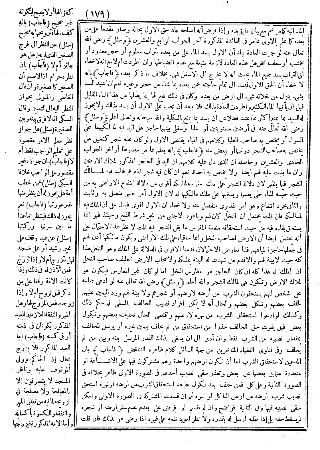 (وَسُئِلَ - رَضِيَ اللَّهُ تَعَالَى عَنْهُ -) لَوْ جَرَتْ الْعَادَةُ بِبَلَدٍ أَنَّ الْأَوَّلَ يَسُدُّ الْمَاءَ عَلَى مَنْ بَعْدَهُ بِتُرَابٍ مَعْلُومٍ أَوْ حَجَرٍ مَعْدُودٍ أَوْ بِخَشَبٍ أَوْ سَعَفِ نَخْلٍ هَلْ هَذِهِ الْعَادَةُ لَازِمَةٌ مُتَّبَعَةٌ مَعَ عَدَمِ انْضِبَاطِهَا، وَإِنْ اطَّرَدَتْ أَمْ لَا؟ مَعَ أَنَّهُ لَا خَفَاءَ أَنَّ التُّرَابَ يَسُدُّ جَمِيعَ الْمَاءِ بِحَيْثُ إنَّهُ لَا يَخْرُجُ إلَى الْأَسْفَلِ شَيْءٌ بِخِلَافِ مَا ذَكَرَ بَعْدَهُ؟