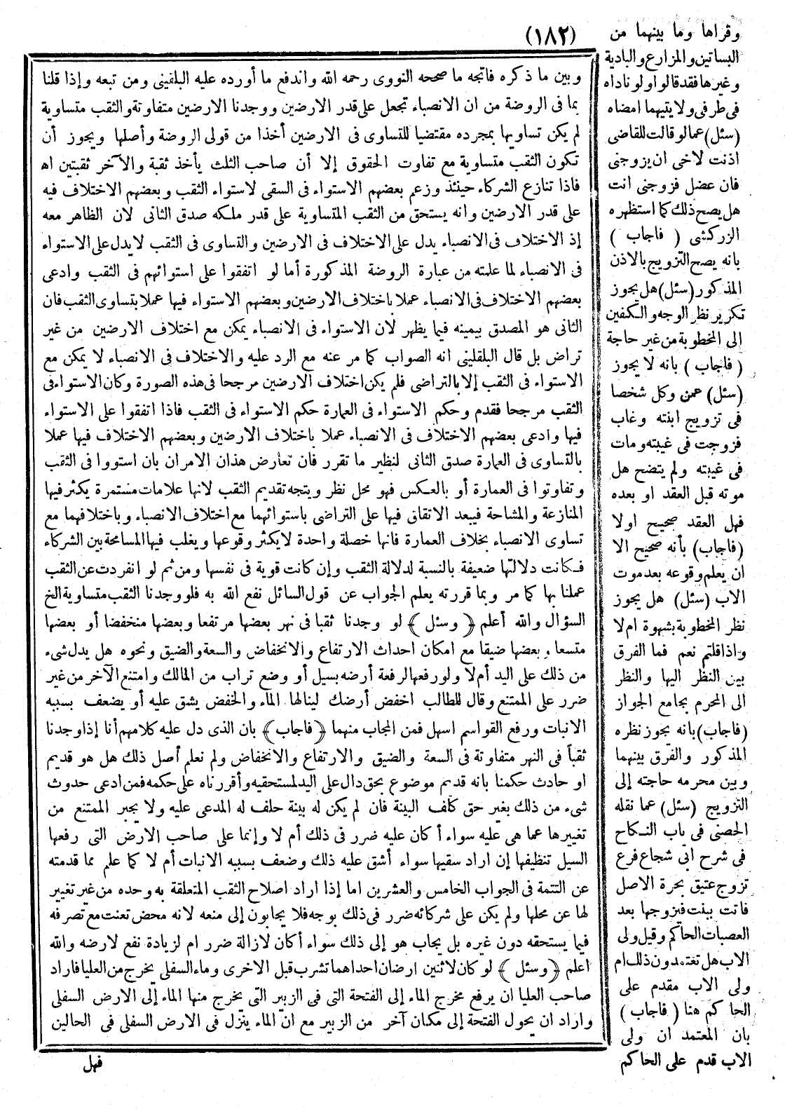 وَبَيْنَ مَا ذَكَرَهُ فَاتَّجَهَ مَا صَحَّحَهُ النَّوَوِيُّ - رَحِمَهُ اللَّهُ - وَانْدَفَعَ مَا أَوْرَدَهُ عَلَيْهِ الْبُلْقِينِيُّ وَمَنْ تَبِعَهُ، وَإِذَا قُلْنَا بِمَا فِي الرَّوْضَةِ مِنْ أَنَّ الْأَنْصِبَاءَ تُجْعَلُ عَلَى قَدْرِ الْأَرَضِينَ وَوَجَدْنَا الْأَرَضِينَ مُتَفَاوِتَةً وَالثُّقَبَ مُتَسَاوِيَةً لَمْ يَكُنْ تُسَاوِيهَا بِمُجَرَّدِهِ مُقْتَضِيًا لِلتَّسَاوِي فِي الْأَرَضِينَ أَخْذًا مِنْ قَوْلَيْ الرَّوْضَةِ وَأَصْلِهَا وَيَجُوزُ أَنْ تَكُونَ الثُّقَبُ مُتَسَاوِيَةً مَعَ تَفَاوُتِ الْحُقُوقِ إلَّا أَنَّ صَاحِبَ الثُّلُثِ يَأْخُذُ ثُقْبَةً وَالْآخَرُ ثُقْبَتَيْنِ اهـ.