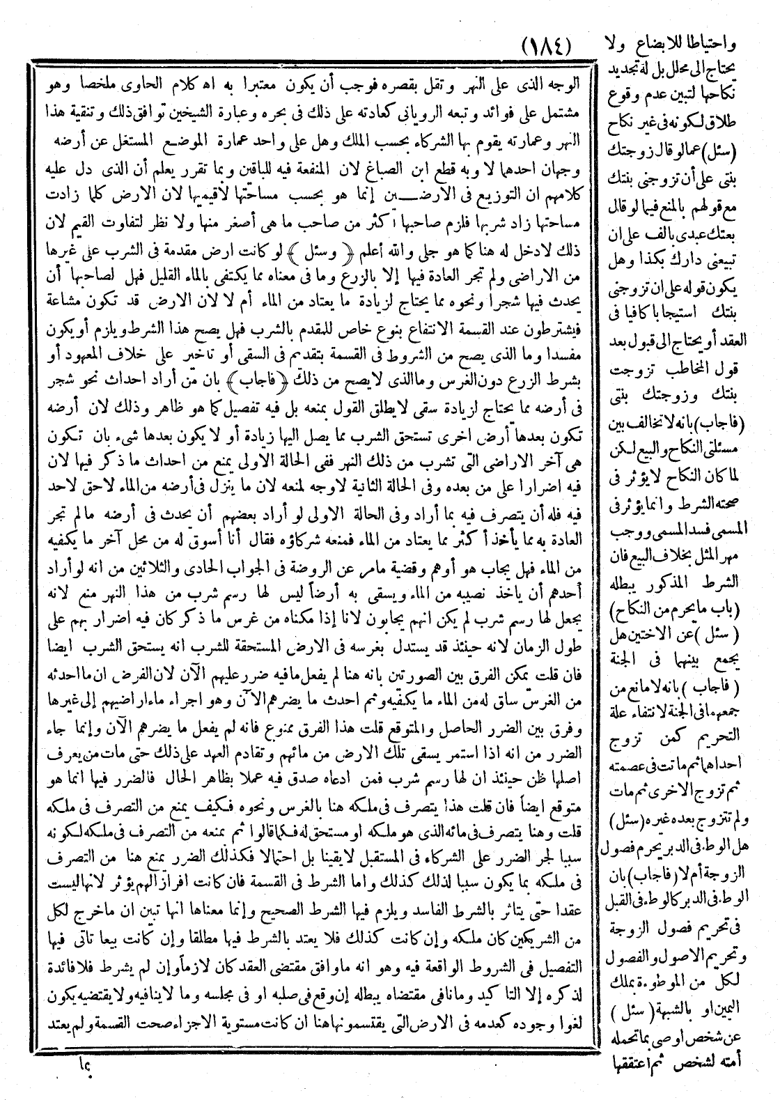 (فَأَجَابَ) بِأَنَّ مَنْ أَرَادَ إحْدَاثَ نَحْوِ شَجَرٍ فِي أَرْضِهِ مِمَّا يَحْتَاجُ لِزِيَادَةِ سَقْيٍ لَا يُطْلَقُ الْقَوْلُ بِمَنْعِهِ، بَلْ فِيهِ تَفْصِيلٌ كَمَا هُوَ ظَاهِرٌ.