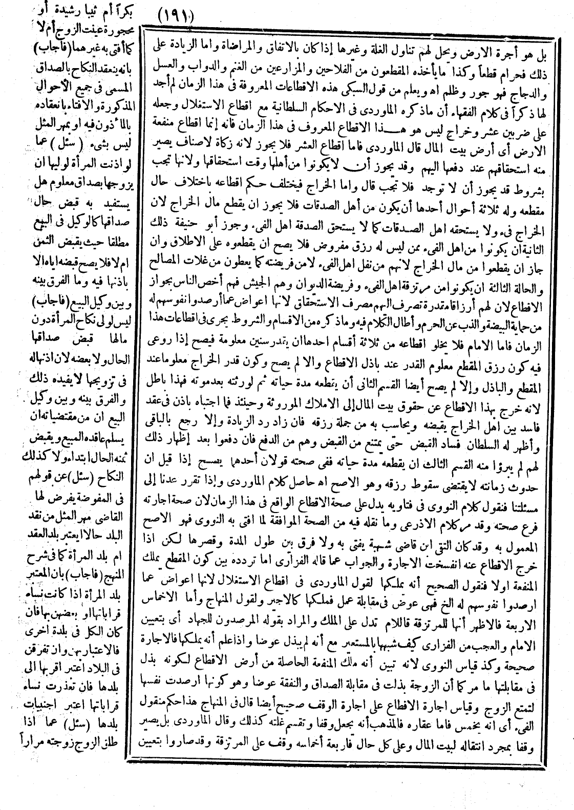 وَيُعْلَمُ مِنْ قَوْلِ السُّبْكِيّ: هَذِهِ الْإِقْطَاعَاتُ الْمَعْرُوفَةُ فِي هَذَا الزَّمَانِ لَمْ أَجِدْ لَهَا ذِكْرًا فِي كَلَامِ الْفُقَهَاءِ أَنَّ مَا ذَكَرَهُ الْمَاوَرْدِيُّ فِي الْأَحْكَامِ السُّلْطَانِيَّةِ مِنْ إقْطَاعِ الِاسْتِغْلَالِ وَجَعْلِهِ عَلَى ضَرْبَيْنِ: عُشْرٍ، وَخَرَاجٍ لَيْسَ هُوَ هَذَا الْإِقْطَاعَ الْمَعْرُوفَ فِي هَذَا الزَّمَانِ، فَإِنَّهُ إنَّمَا هُوَ إقْطَاعُ مَنْفَعَةِ الْأَرْضِ أَيْ: أَرْضِ بَيْتِ الْمَالِ قَالَ الْمَاوَرْدِيُّ: فَأَمَّا إقْطَاعُ الْعُشْرِ فَلَا يَجُوزُ؛ لِأَنَّهُ زَكَاةٌ لِأَصْنَافٍ يَصِيرُ مِنْهُ اسْتِحْقَاقُهُمْ عِنْدَ دَفْعِهَا إلَيْهِمْ، وَقَدْ يَجُوزُ أَنْ لَا يَكُونُوا مِنْ أَهْلِهَا وَقْتَ اسْتِحْقَاقِهَا؛ وَلِأَنَّهَا تَجِبُ بِشُرُوطٍ قَدْ يَجُوزُ أَنْ لَا تُوجَدَ فَلَا تَجِبُ قَالَ: وَأَمَّا الْخَرَاجُ فَيَخْتَلِفُ حُكْمُ إقْطَاعِهِ بِاخْتِلَافِ حَالِ مُقْطَعِهِ، وَلَهُ ثَلَاثَةُ أَحْوَالٍ: أَحَدُهَا: أَنْ يَكُونَ مِنْ أَهْلِ الْفَيْءِ.
