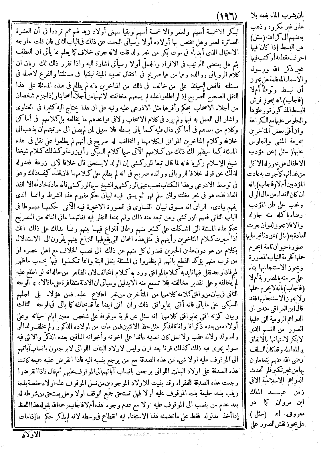 وَبَيَانُ كَوْنِهِ أَفْتَى بِمَا يُوَافِقُ كَلَامَهُمَا أَنَّهُ سُئِلَ عَنْ قَرْيَةٍ مَوْقُوفَةٍ عَلَى شَخْصٍ مُعَيَّن أَيَّامَ حَيَّاته وَعَلَى أَوْلَادِهِ مِنْ بَعْدِهِ ذُكْرَانًا وَإِنَاثًا لِلذَّكَرِ مِثْلُ حَظِّ الْأُنْثَيَيْنِ، فَمَنْ مَاتَ مِنْ أَوْلَادِهِ الذُّكُورِ وَلَمْ يُخَلِّفْ وَلَدًا أَوْ وَلَدَ وَلَدٍ وَلَا لَهُ عَقِبٌ وَلَا نَسْلٌ كَانَ نَصِيبه عَائِدًا عَلَى إخْوَتِهِ وَأَخَوَاته الْبَاقِينَ بَعْده الذَّكَرُ وَالْأُنْثَى فِيهِ سَوَاء يَجْرِي فِيهِ ذَلِكَ كَذَلِكَ قَرْنًا بَعْد قَرْنٍ، وَلَيْسَ لِأَوْلَادِ الْبَنَات اللَّوَاتِي لَا يَرْجِعُونَ لِأَنْسَابِ آبَائِهِمْ إلَى الْمَوْقُوف عَلَيْهِ أَوَّلًا شَيْء مِنْ هَذِهِ الصَّدَقَةِ مَعَ مَنْ يُرْجَعُ بِنَسَبِهِ إلَيْهِ.