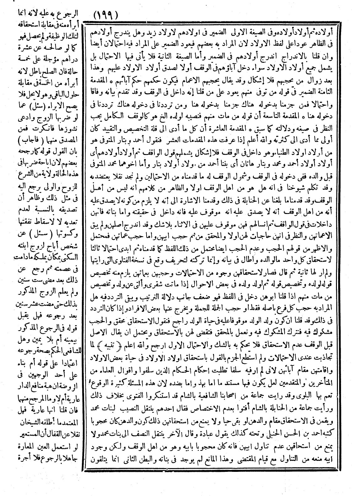 وَقَدْ تَقَدَّمَ بَيَانُهُ وِفَاقًا وَاحْتِمَالًا فَمَنْ جَزَمْنَا بِدُخُولِهِ هُنَاكَ جَزَمْنَا بِدُخُولِهِ هُنَا وَمَنْ تَرَدَّدْنَا فِي دُخُوله هُنَاكَ تَرَدَّدْنَا فِي دُخُوله هُنَا. الْمُقَدِّمَةِ التَّاسِعَةِ: أَنَّ قَوْله مَنْ مَاتَ مِنْهُمْ فَنَصِيبُهُ لِوَلَدِهِ إلَخْ هُوَ كَالْوَقْفِ الْكَامِل يَجِبُ النَّظَرُ فِي صِيَغِهِ وَدَلَالَته كَمَا سَبَقَ. الْمُقَدَّمَةِ الْعَاشِرَةِ: أَنَّ كُلَّ مَا أَدَّى إلَى قِلَّة التَّخْصِيص وَالتَّقْيِيد كَانَ أَوْلَى مِمَّا أَدَّى إلَى كَثْرَتِهِ وَاَللَّهُ أَعْلَمُ. إذَا عَرَفْت هَذِهِ الْمُقَدَّمَاتِ الْعَشْرَ فَنَقُولُ: أَحْمَدُ وَبَتَّار الْمُتَوَفَّى هُوَ مِنْ أَوْلَادِ أَوْلَادِ الطَّنْبَاءِ، وَهُوَ دَاخِل فِي الْوَقْف فَلَا إشْكَال يَشْمَلهُمْ قَوْل الْوَاقِفِ ثُمَّ أَوْلَاد أَوْلَادِهِمْ أَيْ أَوْلَاد أَوْلَادِ أَحْمَدَ وَمُحَمَّدٍ وَبَتَّار هَاتَانِ أَيْ بِنْتَا أَحْمَد مِنْ أَوْلَاد أَوْلَاد بَتَّار، وَأَمَّا أَخُوهُمَا مُحَمَّدٌ الْمُتَوَفَّى قَبْلَ وَالِده فَفِي دُخُولِهِ فِي الْوَقْفِ وَشُمُولِ الْوَقْفِ لَهُ مَا قَدَّمْنَاهُ مِنْ الِاحْتِمَالَيْنِ وَلَمْ نَجِد نَقْلًا يُعْتَضَد بِهِ.