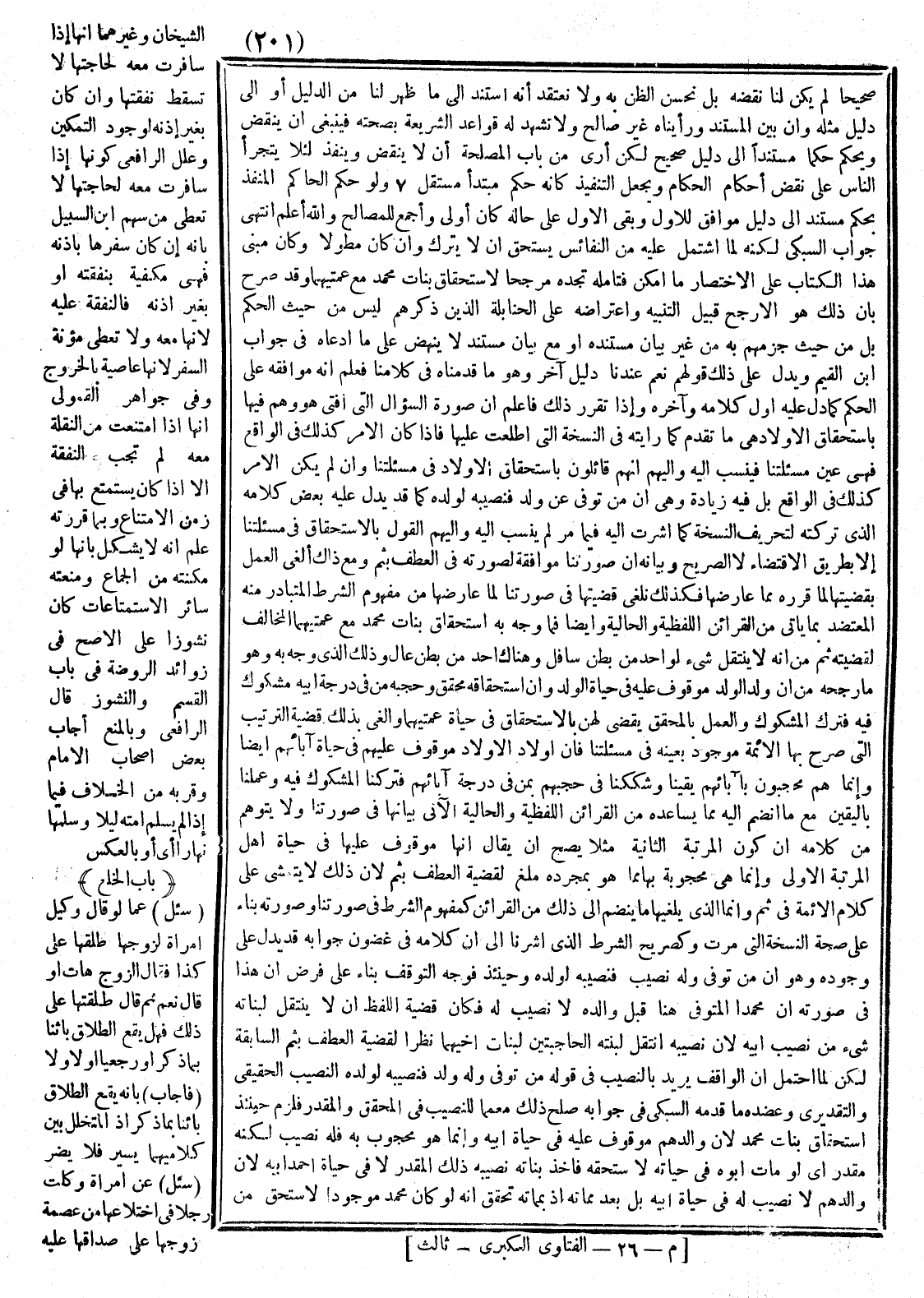 جَوَاب السُّبْكِيّ لَكِنَّهُ لَمَّا اشْتَمَلَ عَلَيْهِ مِنْ النَّفَائِسِ يَسْتَحِقُّ أَنْ لَا يُتْرَكَ وَإِنْ كَانَ مُطَوَّلًا وَكَانَ مَبْنَى هَذَا الْكِتَابِ عَلَى الِاخْتِصَارِ مَا أَمْكَنَ فَتَأَمَّلْهُ تَجِدْهُ مُرَجِّحًا لِاسْتِحْقَاقِ بَنَاتِ مُحَمَّدٍ مَعَ عَمَّتَيْهِمَا وَقَدْ صَرَّحَ بِأَنَّ ذَلِكَ هُوَ الْأَرْجَحُ قُبَيْل التَّنْبِيه وَاعْتِرَاضُهُ عَلَى الْحَنَابِلَةِ الَّذِينَ ذَكَرهمْ لَيْسَ مِنْ حَيْثُ الْحُكْمِ بَلْ مِنْ حَيْثُ جَزْمُهُمْ بِهِ مِنْ غَيْرِ بَيَانِ مُسْتَنَدِهِ أَوْ مَعَ بَيَانِ مُسْتَنَدٍ لَا يَنْهَضُ عَلَى مَا ادَّعَاهُ فِي جَوَابِ ابْن الْقَيِّمِ وَيَدُلُّ عَلَى ذَلِكَ قَوْلُهُ نَعَمْ عِنْدنَا دَلِيلٌ آخَر وَهُوَ مَا قَدَّمْنَاهُ فِي كَلَامنَا فَعُلِمَ أَنَّهُ مُوَافَقَةٌ عَلَى الْحُكْمِ كَمَا دَلَّ عَلَيْهِ أَوَّلُ كَلَامِهِ وَآخِرِهِ وَإِذَا تَقَرَّرَ ذَلِكَ فَاعْلَمْ أَنَّ صُورَةَ السُّؤَالِ الَّتِي أَفْتَى هُوَ وَهُمْ فِيهَا بِاسْتِحْقَاقِ الْأَوْلَادِ هِيَ مَا تَقَدَّمَ كَمَا رَأَيْتُهُ فِي النُّسْخَةِ الَّتِي اطَّلَعْتُ عَلَيْهَا فَإِذَا كَانَ الْأَمْرُ كَذَلِكَ فِي الْوَاقِع فَهِيَ عَيْنُ مَسْأَلَتنَا فَيُنْسَبُ إلَيْهِ وَإِلَيْهِمْ أَنَّهُمْ قَائِلُونَ بِاسْتِحْقَاقِ الْأَوْلَادِ فِي مَسْأَلَتِنَا وَإِنْ لَمْ يَكُنْ الْأَمْرُ كَذَلِكَ فِي الْوَاقِع بَلْ فِيهِ زِيَادَة وَهِيَ أَنَّ مَنْ تُوُفِّيَ عَنْ وَلَد فَنَصِيبُهُ لِوَلَدِهِ كَمَا قَدْ يَدُلّ عَلَيْهِ بَعْضُ كَلَامِهِ الَّذِي تَرَكْتُهُ لِتَحْرِيفِ النُّسْخَة كَمَا أَشَرْت إلَيْهِ فِيمَا مَرَّ لَمْ يُنْسَبْ إلَيْهِ وَإِلَيْهِمْ الْقَوْل بِالِاسْتِحْقَاقِ فِي مَسْأَلَتنَا إلَّا بِطَرِيقِ الِاقْتِضَاء لَا الصَّرِيح وَبَيَانه أَنَّ صُورَتَنَا مُوَافِقَةٌ لِصُورَتِهِ فِي الْعَطْف بِثُمَّ وَمَعَ ذَلِكَ أُلْغِي الْعَمَل بِقَضِيَّتِهَا لِمَا قَرَّرَهُ مِمَّا عَارَضَهَا فَكَذَلِكَ نُلْغِي قَضِيَّتهَا فِي صُورَتِنَا لِمَا عَارَضَهَا مِنْ مَفْهُومِ الشَّرْطِ الْمُتَبَادِرِ مِنْهُ الْمُعْتَضَدِ بِمَا يَأْتِي مِنْ الْقَرَائِنِ اللَّفْظِيَّةِ وَالْحَالِيَّةِ.