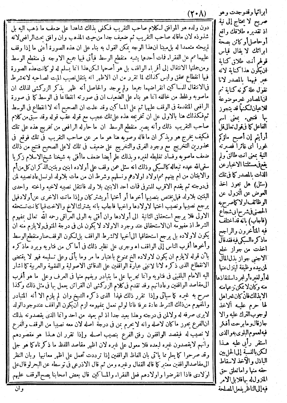 وَالْحَاصِلُ أَنَّهُ ظَهَرَ بِذِكْرِ الزَّرْكَشِيّ لِذَلِكَ أَنَّ مَا صَوَّبَهُ وَغَلَّطَ مَنْ خَالَفَهُ إنَّمَا هُوَ بِنَاءً عَلَى الضَّعِيفِ أَنَّ فِي صُورَتِهِ انْقِطَاعًا فِي الْوَسَطِ كَمَا فِي صُورَةِ الرَّافِعِيِّ الْمُتَقَدِّمَةِ فِي الْوَقْفِ عَلَيْهِمَا ثُمَّ عَلَى الْمَسَاكِينِ، وَقَدْ عَلِمْتَ أَنَّ الصَّحِيحَ أَنَّهُ لَا انْقِطَاعَ فِي الْوَسَطِ ثَمَّ فَكَذَلِكَ هُنَا بِالْأُولَى عَلَى أَنَّ تَخْرِيجَهُ هَذِهِ عَلَى تِلْكَ عَجِيبٌ مَعَ قَوْلِهِ عَقِبَ قَوْلِهِ: وَقَدْ سَبَقَ مِنْ كَلَام صَاحِبِ التَّقْرِيبِ ذَلِكَ وَأَنَّهُ يَصِيرُ مُنْقَطِعَ الْوَسَطِ أَنَّ مَا حَاوَلَهُ الرَّافِعِيُّ مِنْ تَخْرِيجِ هَذِهِ عَلَى تِلْكَ فَكَيْفَ يُخَرِّجُ هُوَ وَيَذْكُر أَنَّ مَا قَالَهُ وَصَوَّبَهُ هُنَا هُوَ مَا مَرَّ عَنْ صَاحِبِ التَّقْرِيبِ فِي تِلْكَ؟ ، فَوَقَعَ فِي مَحْذُورَيْنِ: التَّخْرِيجِ مَعَ وُجُودِ الْفَرْقِ وَالتَّخْرِيجِ عَلَى ضَعِيفٍ فِي تِلْكَ لَا عَلَى الصَّحِيحِ فَنَتَجَ مِنْ ذَلِكَ ضَعْفُ مَا صَوَّبَهُ وَفَسَادُ تَغْلِيطِهِ لِغَيْرِهِ وَبِذَلِكَ عُلِمَ أَيْضًا ضَعْفُ مَا أَفْتَى بِهِ شَيْخُنَا شَيْخُ الْإِسْلَامِ زَكَرِيَّا سَقَى اللَّه عَهْدَهُ تَبَعًا لَهُ كَالسُّبْكِيِّ، وَذَلِكَ أَنَّهُ سُئِلَ عَمَّنْ وَقَفَ عَلَى أَوْلَادِهِ ابْنَيْنِ وَبِنْتَيْنِ الذُّكْرَانِ كُلٌّ مِنْ أُمٍّ وَالِابْنَتَانِ مِنْ أُمٍّ بَيْنهمْ ثُمَّ أَوْلَادِ أَوْلَادِهِمْ وَنَسْلِهِمْ وَشَرَط أَنَّ مَنْ مَاتَ بِلَا وَلَدٍ أَوْ نَسْلٍ عَادَ نَصِيبُهُ لِمَنْ فِي دَرَجَتِهِ ثُمَّ يُقَدَّمُ الْأَقْرَبُ لِلْمُتَوَفَّى فَمَاتَ أَحَدُ الِابْنَيْنِ بِلَا وَلَدٍ فَانْتَقَلَ نَصِيبُهُ لِأَخِيهِ وَأُخْتِهِ وَإِحْدَى الْبِنْتَيْنِ بِلَا وَلَدٍ فَهَلْ يَخْتَصُّ بِنَصِيبِهَا أَخُوهَا أَوْ أُخْتهَا أَوْ يَشْتَرِكَانِ؟ وَإِذَا مَاتَتْ الْأُخْرَى عَنْ أَوْلَادٍ فَهَلْ يَرْجِع نَصِيبُهَا وَنَصِيبُ أُخْتِهَا لِأَوْلَادِهَا وَأَخِيهَا؟