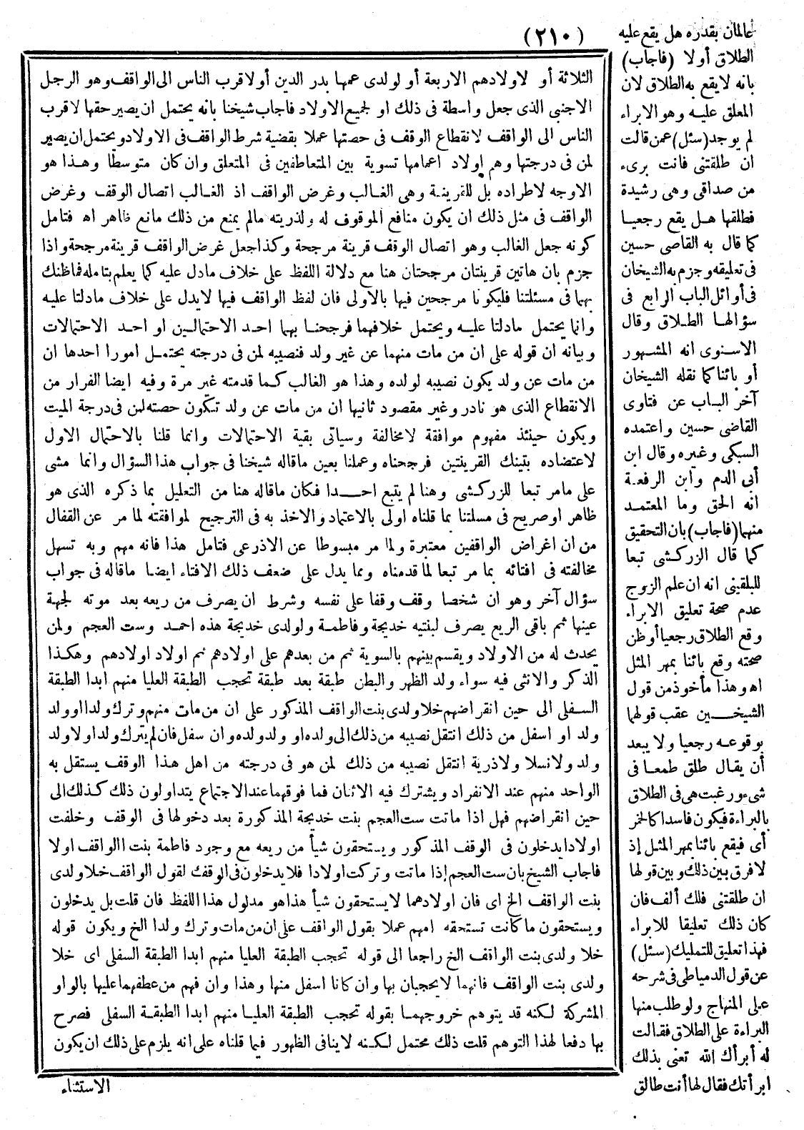 فَأَجَابَ الشَّيْخُ بِأَنَّ سِتَّ الْعَجَمِ إذَا مَاتَتْ وَتَرَكَتْ أَوْلَادًا فَلَا يَدْخُلُونَ فِي الْوَقْفِ لِقَوْلِ الْوَاقِفِ خَلَا وَلَدَيْ بِنْت الْوَاقِفِ إلَخْ أَيْ: فَإِنَّ أَوْلَادَهُمَا لَا يَسْتَحِقُّونَ شَيْئًا هَذَا هُوَ مَدْلُولُ هَذَا اللَّفْظِ، فَإِنْ قُلْت: بَلْ يَدْخُلُونَ وَيَسْتَحِقُّونَ مَا كَانَتْ تَسْتَحِقّهُ أُمّهمْ عَمَلًا بِقَوْلِ الْوَاقِفِ عَلَى أَنَّ مَنْ مَاتَ وَتَرَك وَلَدًا إلَخْ وَيَكُونُ قَوْلُهُ: خَلَا وَلَدَيْ بِنْت الْوَاقِفِ إلَخْ رَاجِعًا إلَى قَوْلِهِ: تَحْجُبُ الطَّبَقَةُ الْعُلْيَا مِنْهُمْ أَبَدًا الطَّبَقَةَ السُّفْلَى أَيْ: خَلَا وَلَدَيْ بِنْت الْوَاقِفِ فَإِنَّهُمَا لَا يُحْجَبَانِ بِهَا وَإِنْ كَانَا أَسْفَلَ مِنْهَا، وَهَذَا، وَإِنْ فُهِمَ مِنْ عَطْفِهِمَا عَلَيْهَا بِالْوَاوِ الْمُشْرِكَةِ لَكِنَّهُ قَدْ يُتَوَهَّمُ خُرُوجُهُمَا بِقَوْلِهِ: تَحْجُبُ الطَّبَقَةُ الْعُلْيَا مِنْهُمْ أَبَدًا الطَّبَقَةَ السُّفْلَى فَصَرَّحَ بِهَا دَفْعًا لِهَذَا التَّوَهُّمِ قُلْت: ذَلِكَ يُحْتَمَلُ لَكِنَّهُ لَا يُنَافِي الظُّهُورَ فِيمَا قُلْنَا عَلَى أَنَّهُ يَلْزَمُ عَلَى ذَلِكَ أَنْ يَكُونَ