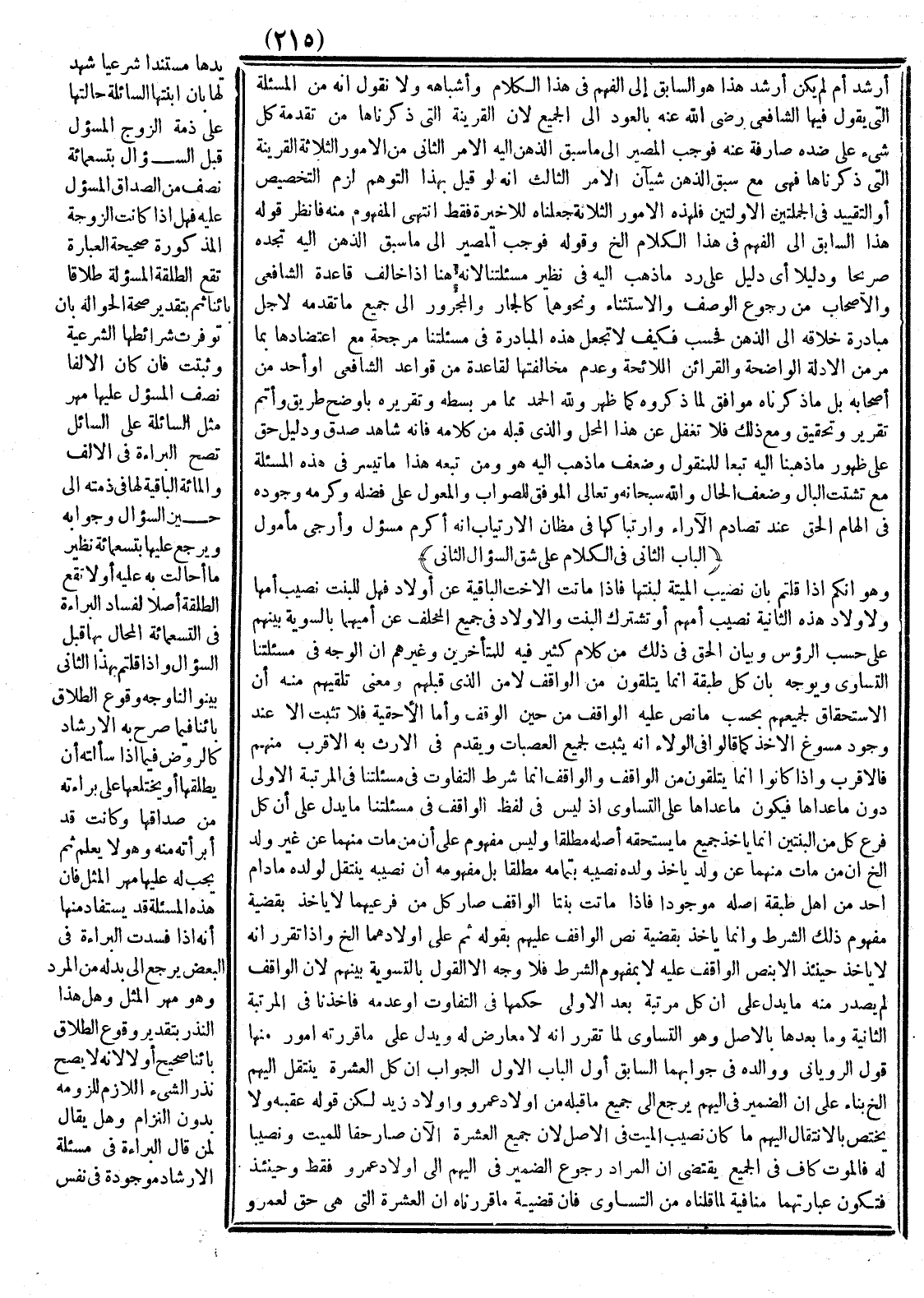 (الْبَابُ الثَّانِي فِي الْكَلَامِ عَلَى شِقِّ السُّؤَالِ الثَّانِي) وَهُوَ أَنَّكُمْ إذَا قُلْتُمْ بِأَنَّ نَصِيبَ الْمَيِّتَةِ لَبِنْتهَا فَإِذَا مَاتَتْ الْأُخْتُ الْبَاقِيَةُ عَنْ أَوْلَادٍ فَهَلْ لِلْبِنْتِ نَصِيبُ أُمِّهَا وَلِأَوْلَادِ هَذِهِ الثَّانِيَةِ نَصِيبُ أُمِّهِمْ أَوْ تَشْتَرِكُ الْبِنْتُ وَالْأَوْلَادُ فِي جَمِيعِ الْمُخَلَّفِ عَنْ أُمَّيْهِمَا بِالسَّوِيَّةِ بَيْنَهُمْ عَلَى حَسَبِ الرُّءُوسِ؟ وَبَيَانُ الْحَقِّ فِي ذَلِكَ مِنْ كَلَامٍ كَثِيرٍ فِيهِ لِلْمُتَأَخِّرِينَ وَغَيْرِهِمْ أَنَّ الْوَجْهَ فِي مَسْأَلَتنَا التَّسَاوِي وَيُوَجَّهُ بِأَنَّ كُلَّ طَبَقَةٍ إنَّمَا يَتَلَقَّوْنَ مِنْ الْوَاقِفِ لَا مِنْ الَّذِي قَبْلَهُمْ.