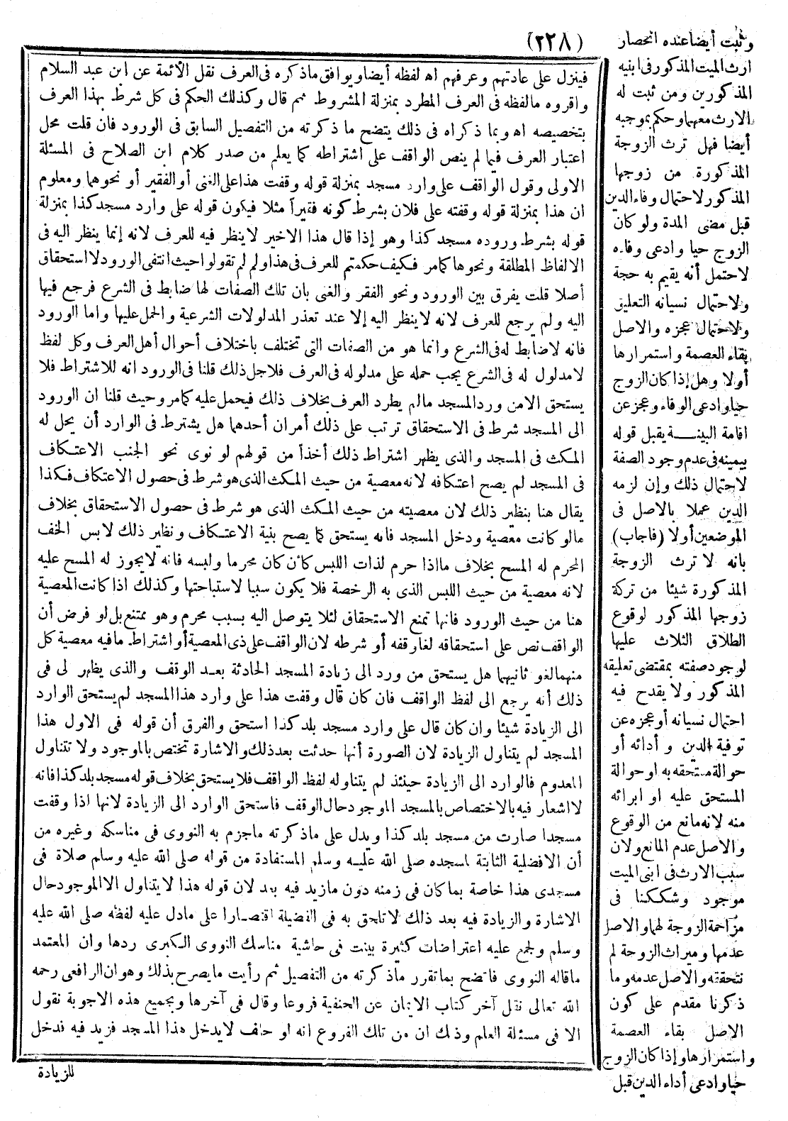 ثَانِيهِمَا هَلْ يَسْتَحِقُّ مَنْ وَرَدَ إلَى زِيَادَةِ الْمَسْجِدِ الْحَادِثَةِ بَعْد الْوَقْفِ الَّذِي يَظْهَرُ لِي فِي ذَلِكَ أَنَّهُ يَرْجِعُ إلَى لَفْظِ الْوَاقِفِ؟ ، فَإِنْ كَانَ قَالَ: وَقَفْت هَذَا عَلَى وَارِدِ هَذَا الْمَسْجِدِ لَمْ يَسْتَحِقَّ الْوَارِدُ إلَى الزِّيَادَةِ شَيْئًا، وَإِنْ كَانَ قَالَ: عَلَى وَارِدِ مَسْجِدِ بَلَدِ كَذَا اسْتَحَقَّ، وَالْفَرْقُ أَنَّ قَوْلَهُ فِي الْأَوَّلِ هَذَا الْمَسْجِد لَمْ يَتَنَاوَل الزِّيَادَةَ؛ لِأَنَّ الصُّورَةَ أَنَّهَا حَدَثَتْ بَعْدَ ذَلِكَ، وَالْإِشَارَةُ تَخْتَصُّ بِالْمَوْجُودِ وَلَا يَتَنَاوَلُ الْمَعْدُومَ، فَالْوَارِدُ إلَى الزِّيَادَة حِينَئِذٍ لَمْ يَتَنَاوَلهُ لَفْظُ الْوَاقِفِ فَلَا يَسْتَحِقُّ بِخِلَافِ قَوْلِهِ: مَسْجِد بَلَدِ كَذَا فَإِنَّهُ لَا إشْعَارَ فِيهِ بِالِاخْتِصَاصِ بِالْمَسْجِدِ الْمَوْجُودِ حَالَ الْوَقْفِ فَاسْتَحَقَّ الْوَارِدُ إلَى الزِّيَادَةِ؛ لِأَنَّهَا إذَا وَقَفَتْ مَسْجِدًا صَارَتْ مِنْ مَسْجِدِ بَلَدِ كَذَا وَيَدُلُّ عَلَى مَا ذَكَرْته وَمَا جَزَمَ بِهِ النَّوَوِيُّ فِي مَنَاسِكِهِ وَغَيْرِهِ مِنْ أَنَّ الْأَفْضَلِيَّةَ الثَّابِتَةَ لِمَسْجِدِهِ - صَلَّى اللَّهُ عَلَيْهِ وَسَلَّمَ - الْمُسْتَفَادَة مِنْ قَوْلِهِ: - صَلَّى اللَّهُ عَلَيْهِ وَسَلَّمَ - «صَلَاةٌ فِي مَسْجِدِي هَذَا» خَاصَّةٌ بِمَا كَانَ فِي زَمَنِهِ دُون مَا زِيدَ فِيهِ بَعْدُ؛ لِأَنَّ قَوْلَهُ هَذَا لَا يَتَنَاوَلُ إلَّا الْمَوْجُودَ حَالَ الْإِشَارَةِ، وَالزِّيَادَةُ فِيهِ بَعْدَ ذَلِكَ لَا تَلْحَقُ بِهِ فِي الْفَضِيلَةِ اقْتِصَارًا عَلَى مَا دَلَّ عَلَيْهِ لَفْظُهُ - صَلَّى اللَّهُ عَلَيْهِ وَسَلَّمَ - وَلِجَمْعٍ عَلَيْهِ اعْتِرَاضَاتٌ كَثِيرَةٌ بُيِّنَتْ فِي حَاشِيَةِ مَنَاسِك النَّوَوِيِّ الْكُبْرَى رَدَّهَا، وَأَنَّ الْمُعْتَمَدَ مَا قَالَهُ النَّوَوِيُّ فَاتَّضَحَ بِمَا تَقَرَّرَ مَا ذَكَرْته مِنْ التَّفْصِيلِ ثُمَّ رَأَيْت مَا يُصَرِّحُ بِذَلِكَ، وَهُوَ أَنَّ الرَّافِعِيَّ - رَحِمَهُ اللَّهُ تَعَالَى - نَقَلَ آخِرَ كِتَابِ الْأَيْمَانِ عَنْ الْحَنِيفَةِ فُرُوعًا وَقَالَ فِي آخِرِهَا: وَبِجَمِيعِ هَذِهِ الْأَجْوِبَةِ نَقُولُ: إلَّا فِي مَسْأَلَةِ الْعِلْمِ، وَذَلِكَ أَنَّ مِنْ تِلْكَ الْفُرُوعِ أَنَّهُ لَوْ حَلَفَ لَا يَدْخُلُ هَذَا الْمَسْجِدَ فَزِيدَ فِيهِ فَدَخَلَ