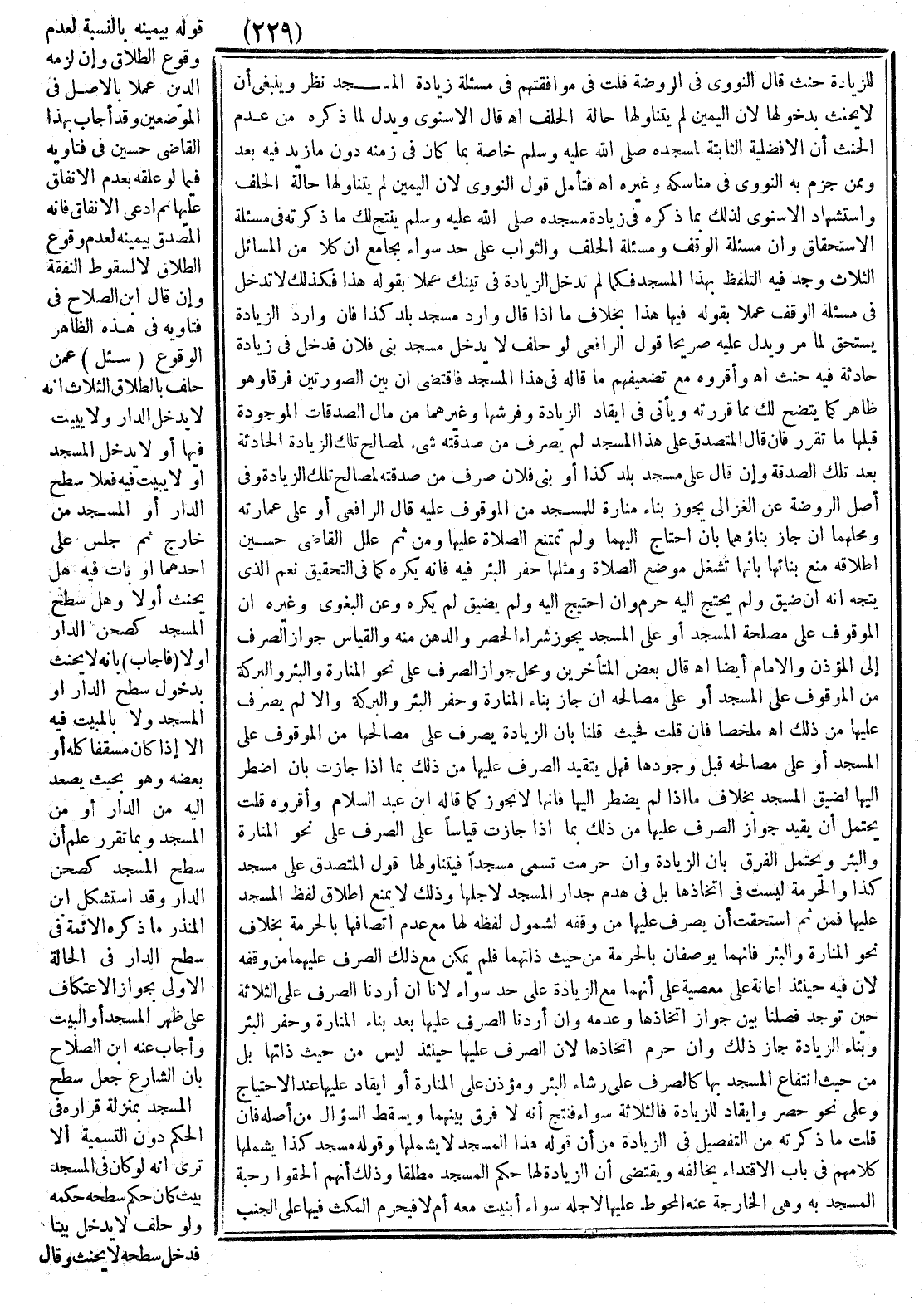 وَأَقَرُّوهُ مَعَ تَضْعِيفِهِمْ مَا قَالَهُ فِي هَذَا الْمَسْجِدِ فَاقْتَضَى أَنَّ بَيْنَ الصُّورَتَيْنِ فَرْقًا، وَهُوَ ظَاهِرٌ كَمَا يَتَّضِحُ لَك مِمَّا قَرَّرْتُهُ وَيَأْتِي فِي إيقَادِ الزِّيَادَةِ وَفَرْشِهَا وَغَيْرِهِمَا مِنْ مَالِ الصَّدَقَاتِ الْمَوْجُودَةِ قَبْلَهَا مَا تَقَرَّرَ فَإِنَّ الْمُتَصَدِّقَ عَلَى هَذَا الْمَسْجِدِ لَمْ يُصْرَفْ مِنْ صَدَقَتِهِ شَيْءٌ لِمَصَالِحِ تِلْكَ الزِّيَادَةِ الْحَادِثَةِ بَعْدَ تِلْكَ الصَّدَقَةِ، وَإِنْ قَالَ: عَلَى مَسْجِدِ بَلَدِ كَذَا أَوْ بَنِي فُلَانٍ صُرِفَ مِنْ صَدَقَتِهِ لِمَصَالِحِ تِلْكَ الزِّيَادَةِ وَفِي أَصْلِ الرَّوْضَةِ عَنْ الْغَزَالِيِّ يَجُوزُ بِنَاءُ مَنَارَةٍ لِلْمَسْجِدِ مِنْ الْمَوْقُوفِ عَلَيْهِ قَالَ الرَّافِعِيُّ: أَوْ عَلَى عِمَارَتِهِ وَمَحَلُّهُمَا إنْ جَازَ بِنَاؤُهُمَا بِأَنْ احْتَاجَ إلَيْهِمَا وَلَمْ تَمْتَنِعْ الصَّلَاةُ عَلَيْهَا وَمِنْ ثَمَّ عَلَّلَ الْقَاضِي حُسَيْنٌ إطْلَاقَهُ مَنْعَ بِنَائِهَا بِأَنَّهَا تَشْغَلُ مَوْضِعَ الصَّلَاةِ وَمِثْلُهَا حَفْرُ الْبِئْرِ فِيهِ فَإِنَّهُ يُكْرَهُ كَمَا فِي التَّحْقِيقِ، نَعَمْ الَّذِي يُتَّجَهُ أَنَّهُ إنْ ضَيَّقَ وَلَمْ يُحْتَجْ إلَيْهِ حَرُمَ، وَإِنْ اُحْتِيجَ إلَيْهِ وَلَمْ يُضَيِّقْ لَمْ يُكْرَهْ وَعَنْ الْبَغَوِيِّ وَغَيْرِهِ أَنَّ الْمَوْقُوفَ عَلَى مَصْلَحَةِ الْمَسْجِدِ أَوْ عَلَى الْمَسْجِدِ يَجُوزُ شِرَاءُ الْحُصْرِ وَالدُّهْنِ مِنْهُ، وَالْقِيَاسُ جَوَازُ الصَّرْفِ إلَى الْمُؤَذِّنِ وَالْإِمَامِ أَيْضًا اهـ.