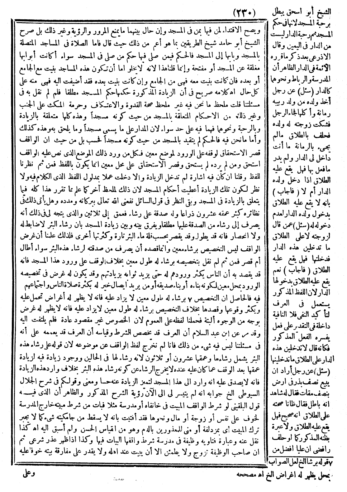 وَاَلَّذِي يُتَّجَهُ لِي فِي ذَلِكَ أَنَّهُ يُصْرَفُ إلَى رِشَاهُ مِنْ الصَّدَقَةِ عَلَيْهَا مُطْلَقًا وَيُفَرَّقُ بَيْنَهُ وَبَيْنَ زِيَادَةِ الْمَسْجِدِ بِأَنَّ رِشَاءَ الْبِئْرِ لَا ضَابِطَ لَهُ وَلَا انْحِصَار فَإِنَّهُ قَدْ يَطُولُ وَقَدْ يَقْصُرُ بِحَسْبِ قِلَّةِ مَاءِ الْبِئْرِ تَارَةً وَكَثْرَتِهَا أُخْرَى فَلِذَلِكَ عَلِمْنَا أَنَّ غَرَضَ الْوَاقِفِ لَيْسَ التَّخْصِيصَ بِرِشَاءٍ مُعَيَّنٍ، وَإِنَّمَا قَصْده أَنْ يُصْرَفَ مِنْ صَدَقَتِهِ لِرِشَاءِ هَذِهِ الْبِئْرِ، سَوَاءٌ أَطَالَ أَمْ قَصُرَ فَمِنْ ثَمَّ لَمْ نَقُلْ بِتَخْصِيصِهِ بِرِشَاءٍ لَهُ طُولٌ مُعَيَّنٌ بِخِلَافِ الْوَقْفِ عَلَى وُرُودِ هَذَا الْمَسْجِدِ فَإِنَّهُ قَدْ يَقْصِدُ بِهِ أَنَّ النَّاسَ يَكْثُر وِرْدُهُمْ لَهُ حَتَّى يَزِيدَ ثَوَابُهُ بِزِيَادَتِهِمْ وَقَدْ يَكُونُ لَهُ غَرَضٌ فِي تَخْصِيصِهِ الْوَرْدِ بِمَحَلٍّ مُعَيَّنٍ لِكَوْنِهِ بِنَاءَهُ أَوْ بِنَاءَ صَدِيقِهِ أَوْ مَنْ يُرِيدُ إيصَالَ خَيْرٍ لَهُ بِكَثْرَةِ صَلَاةِ النَّاسِ وَاجْتِمَاعِهِمْ فِيهِ، فَالْحَاصِلُ أَنَّ التَّخْصِيصَ بِرِشَاءٍ لَهُ طُولٌ مُعَيَّنٌ لَا يُزَادُ عَلَيْهِ فَإِنَّهُ لَا يَظْهَرُ لَهُ أَغْرَاضٌ تُحْمَلُ عَلَيْهِ وَيَكْثُرُ وُقُوعُهَا وَقَصْدُهَا بِخِلَافِ التَّخْصِيصِ بِرِشَاءٍ لَهُ طُولٌ مُعَيَّنٌ لَا يُزَادُ عَلَيْهِ فَإِنَّهُ لَا يَظْهَرُ لَهُ غَرَضٌ بِوَجْهٍ مِنْ الْوُجُوهِ أَلْبَتَّةَ فَحَمَلْنَا لَفْظَهُ عَلَى الْعُمُومِ؛ لِأَنَّ الْخُصُوصَ غَيْرُ مَقْصُودٍ عَادَةً فَلَمْ يُلْتَفَتْ إلَيْهِ وَقَدْ مَرَّ عَنْ ابْنِ عَبْدِ السَّلَامِ أَنَّ الْعُرْفَ قَدْ يُخَصِّصُ الشَّرْطَ وَقِيَاسُهُ أَنَّ الْعُرْفَ قَدْ يُعَمِّمُهُ عَلَى أَنَّهُ فِي مَسْأَلَتِنَا لَيْسَ فِيهِ شَيْءٌ مِنْ ذَلِكَ فَإِنَّا لَمْ نُخْرِجْ لَفْظَ الْوَاقِفِ عَنْ مَوْضُوعِهِ؛ لِأَنَّ قَوْلَهُ: عَلَى رِشَاءِ هَذَا الْبِئْرِ يَشْمَلُ رِشَاءَهَا وَعُمْقَهَا عِشْرُونَ أَوْ ثَلَاثُونَ؛ لِأَنَّهُ رِشَاءٌ لَهَا فِي الْحَمْلَيْنِ وَوُجُودُ زِيَادَةٍ فِيهِ لِزِيَادَةِ عُمْقِهَا بَعْدَ الْوَقْفِ عَمَّا كَانَ عَلَيْهِ عَنْهُ لَا يُخْرِجُ الرِّشَاءَ عَنْ كَوْنِهِ رِشَاءَ هَذِهِ الْبِئْرِ بِخِلَافِ وَارِدِ الزِّيَادَةِ فَإِنَّهُ لَا يَصْدُقُ عَلَيْهِ أَنَّهُ وَارِدٌ إلَى هَذَا الْمَسْجِدِ لِتَمَيُّزِ الزِّيَادَةِ عَنْهُ حِسًّا وَمَعْنًى وَقَوْلُكُمْ فِي شَرْحِ الْجَلَالِ السُّيُوطِيِّ إلَخْ جَوَابُهُ أَنَّهُ لَمْ يَتَيَسَّرْ لِي الْآنَ رُؤْيَةُ الشَّرْحِ الْمَذْكُورِ، وَالظَّاهِرُ أَنَّ الَّذِي فِيهِ قَوْل الْبُلْقِينِيُّ لَوْ شَرَطَ الْوَاقِفُ الْمَبِيتَ فِي خَانِقَاه أَوْ مَدْرَسَةٍ مَثَلًا فَبَاتَ مَنْ شَرَطَ مَبِيتَهُ خَارِجَ الْمَدْرَسَةِ لِخَوْفٍ عَلَى نَفْسٍ أَوْ زَوْجَةٍ أَوْ مَالٍ وَنَحْوِهَا فَقَدْ أَفْتَيْتُ بِأَنَّهُ لَا يَسْقُطُ مِنْ جَامِكِيَّتِهِ شَيْءٌ كَمَا لَا يُجْبَرُ تَرْكُ الْمَبِيتِ أَيْ: بِمُزْدَلِفَةَ أَوْ مِنًى لِلْمَعْذُورِينَ بِالدَّمِ وَهُوَ مِنْ الْقِيَاسِ الْحَسَنِ وَلَمْ أُسْبَقْ إلَيْهِ اهـ.