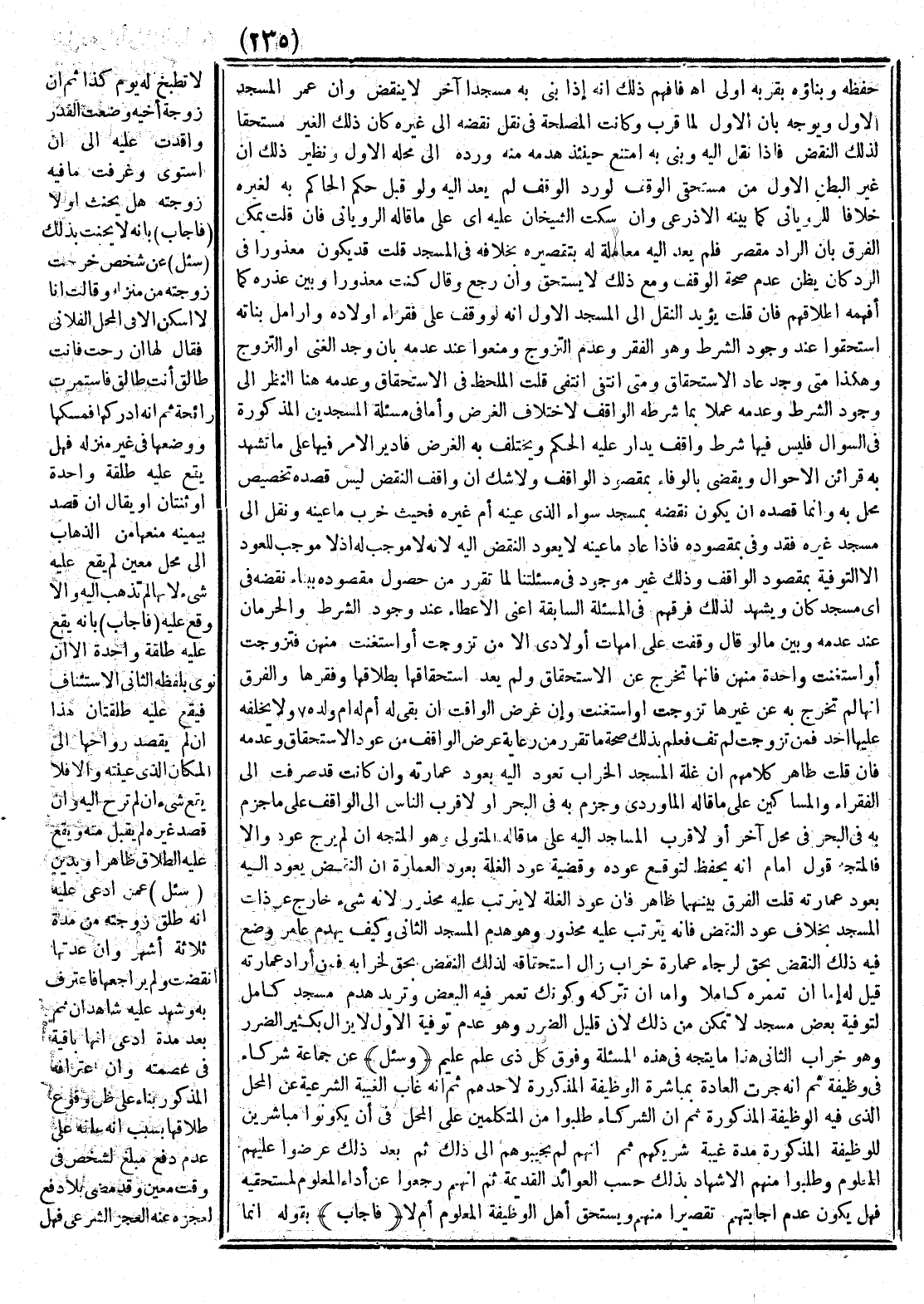 وَأَمَّا فِي مَسْأَلَةِ الْمَسْجِدَيْنِ الْمَذْكُورَةِ فِي السُّؤَالِ فَلَيْسَ فِيهَا شَرْطُ وَاقِفٍ يُدَارُ عَلَيْهِ الْحُكْمُ وَيَخْتَلِفُ بِهِ الْغَرَضُ فَأُدِيرَ الْأَمْرُ فِيهَا عَلَى مَا تَشْهَدُ بِهِ قَرَائِنُ الْأَحْوَالِ وَيُقْضَى بِالْوَفَاءِ بِمَقْصُودِ الْوَاقِفِ وَلَا شَكَّ أَنَّ وَاقِفَ النَّقْضِ لَيْسَ قَصْدُهُ تَخْصِيصَ مَحَلٍّ بِهِ، وَإِنَّمَا قَصْدُهُ أَنْ يَكُونَ نَقْضُهُ بِمَسْجِدٍ، سَوَاءٌ الَّذِي عَيَّنَهُ أَمْ غَيْرُهُ فَحَيْثُ خَرِبَ مَا عَيَّنَهُ وَنُقِلَ إلَى مَسْجِدٍ غَيْرِهِ فَقَدْ وَفَّى بِمَقْصُودِهِ فَإِذَا عَادَ مَا عَيَّنَهُ لَا يَعُودُ النَّقْضُ إلَيْهِ؛ لِأَنَّهُ لَا مُوجِبَ لَهُ إذْ لَا مُوجِبَ لِلْعَوْدِ إلَّا التَّوْفِيَةُ بِمَقْصُودِ الْوَاقِفِ، وَذَلِكَ غَيْرُ مَوْجُودٍ فِي مَسْأَلَتِنَا لِمَا تَقَرَّرَ مِنْ حُصُولِ مَقْصُودِهِ بِبِنَاءِ نَقْضِهِ فِي أَيِّ مَسْجِدٍ كَانَ وَيَشْهَدُ لِذَلِكَ فَرْقُهُمْ فِي الْمَسْأَلَةِ السَّابِقَةِ أَعْنِي الْإِعْطَاءَ عِنْدَ وُجُودِ الشَّرْطِ وَالْحِرْمَانَ عِنْدَ عَدَمِهِ وَبَيْنَ مَا لَوْ قَالَ: وَقَفْتُ عَلَى أُمَّهَاتِ أَوْلَادِي إلَّا مَنْ تَزَوَّجَتْ أَوْ اسْتَغْنَتْ مِنْهُنَّ فَتَزَوَّجَتْ أَوْ اسْتَغْنَتْ وَاحِدَةٌ مِنْهُنَّ فَإِنَّهَا تَخْرُجُ عَنْ الِاسْتِحْقَاقِ وَلَمْ يَعُدْ اسْتِحْقَاقُهَا بِطَلَاقِهَا وَفَقْرِهَا، وَالْفَرْقُ أَنَّهَا لَمْ تَخْرُجْ بِهِ عَنْ غَيْرِهَا تَزَوَّجَتْ أَوْ اسْتَغْنَتْ وَأَنَّ غَرَضَ الْوَاقِفِ إنْ بَقِيَ لَهُ أُمُّ وَلَدِهِ وَلَا يَخْلُفُهُ عَلَيْهَا أَحَدٌ فَمَنْ تَزَوَّجَتْ لَمْ تَفِ فَعُلِمَ بِذَلِكَ صِحَّةُ مَا تَقَرَّرَ مِنْ رِعَايَةِ غَرَضِ الْوَاقِفِ مِنْ عَوْدِ الِاسْتِحْقَاقِ وَعَدَمِهِ.