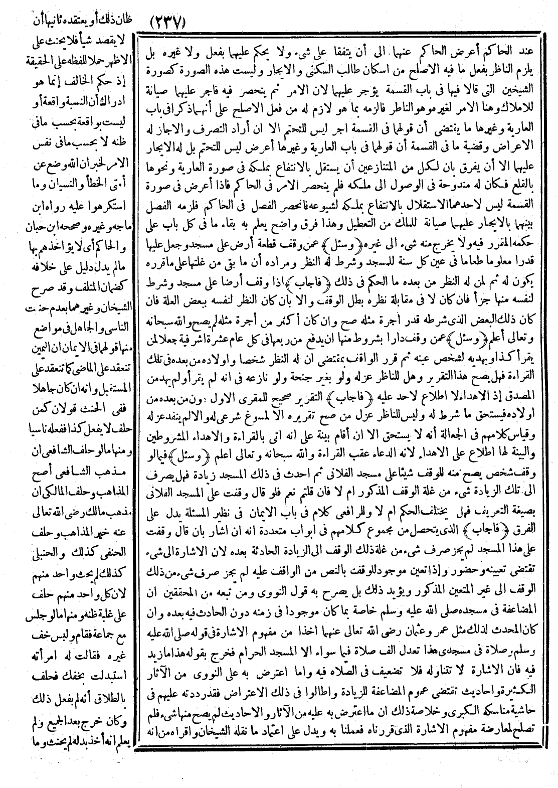 (فَأَجَابَ) الَّذِي يَتَحَصَّلُ مِنْ مَجْمُوعِ كَلَامِهِمْ فِي أَبْوَابٍ مُتَعَدِّدَةٍ أَنَّهُ إنْ أَشَارَ بِأَنْ قَالَ: وَقَفْتُ عَلَى هَذَا الْمَسْجِدِ لَمْ يَجُزْ صَرْفُ شَيْءٍ مِنْ غَلَّةِ ذَلِكَ الْوَقْفِ إلَى الزِّيَادَةِ الْحَادِثَةِ بَعْدَهُ؛ لِأَنَّ الْإِشَارَةَ إلَى شَيْءٍ تَقْتَضِي تَعَيُّنَهُ وَحُضُورَهُ وَإِذَا تَعَيَّنَ مَوْجُودٌ لِلْوَقْفِ بِالنَّصِّ مِنْ الْوَاقِفِ عَلَيْهِ لَمْ يَجُزْ صَرْفُ شَيْءٍ مِنْ ذَلِكَ الْوَقْفِ إلَى غَيْرِ الْمُتَعَيِّنِ الْمَذْكُورِ وَيُؤَيِّدُ ذَلِكَ بَلْ يُصَرِّحُ بِهِ قَوْلُ النَّوَوِيِّ، وَمَنْ تَبِعَهُ مِنْ الْمُحَقِّقِينَ إنَّ الْمُضَاعَفَةَ فِي مَسْجِدِهِ - صَلَّى اللَّهُ عَلَيْهِ وَسَلَّمَ - خَاصَّةٌ بِمَا كَانَ مَوْجُودًا فِي زَمَنِهِ دُونَ الْحَادِثِ فِيهِ بَعْدَهُ، وَإِنْ كَانَ الْمُحْدِثُ لِذَلِكَ مِثْلَ عُمَرَ وَعُثْمَانَ - رَضِيَ اللَّهُ تَعَالَى عَنْهُمَا - أَخْذًا مِنْ مَفْهُومِ الْإِشَارَةِ فِي قَوْلِهِ: - صَلَّى اللَّهُ عَلَيْهِ وَسَلَّمَ - «وَصَلَاةٌ فِي مَسْجِدِي هَذَا تَعْدِلُ أَلْفَ صَلَاةٍ فِيمَا سِوَاهُ إلَّا الْمَسْجِدَ الْحَرَامَ» فَخَرَجَ بِقَوْلِهِ: هَذَا مَا زِيدَ فِيهِ فَإِنَّ الْإِشَارَةَ لَا تَتَنَاوَلُهُ فَلَا تَضْعِيفَ فِي الصَّلَاةِ فِيهِ.