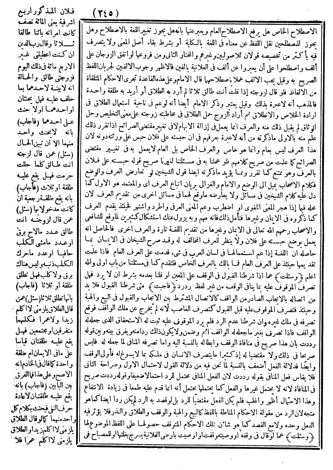 وَقِيلَ: يُعْتَبَرُ وَذَكَرَ الْإِمَامُ أَيْضًا أَنَّهُ لَوْ عَمَّ فِي نَاحِيَةٍ اسْتِعْمَالُ الطَّلَاقِ فِي إرَادَةِ الْخَلَاصِ وَالِانْطِلَاقِ ثُمَّ أَرَادَ الزَّوْجُ حَمْلَ الطَّلَاقِ فِي مُخَاطَبَتِهِ زَوْجَتَهُ عَلَى مَعْنَى التَّخْلِيصِ وَحَلِّ الْوَثَاقِ لَمْ يُقْبَلْ ذَلِكَ مِنْهُ وَالْعُرْفُ إنَّمَا يَعْمَلُ فِي إزَالَةِ الْإِبْهَامِ لَا فِي تَغْيِيرِ مُقْتَضَى الصَّرَائِحِ، إذَا تَقَرَّرَ ذَلِكَ عُلِمَ مِنْهُ بِالْأَوْلَى مَا ذَكَرْته مِنْ أَنَّهُ لَا عِبْرَةَ بِعُرْفِهِمْ فِي أَنَّ حَبَسْته عَلَى فُلَانٍ حُبِسَ عَلَى وَرَثَتِهِ دُونَهُ؛ لِأَنَّ هَذَا الْعُرْفَ لَيْسَ بِعَامٍّ، وَإِنَّمَا هُوَ خَاصٌّ وَالْعُرْفُ الْخَاصُّ بَلْ الْعَامُّ لَا يُعْمَلُ بِهِ فِي تَغْيِيرِ مُقْتَضَى الصَّرَائِحِ كَمَا عَلِمْت مِنْ صَرِيحِ كَلَامِهِمْ فَلَوْ عَمِلْنَا بِهِ فِي مَسْأَلَتِنَا لَغَيَّرْنَا صَرِيحَ قَوْلِهِ: حَبَسْته عَلَى فُلَانٍ بِالْعُرْفِ وَهُوَ مُمْتَنِعٌ كَمَا تَقَرَّرَ وَمِمَّا يُؤَيِّدُ مَا ذَكَرْته أَيْضًا قَوْلُ الشَّيْخَيْنِ لَوْ تَعَارَضَ الْعُرْفُ وَالْوَضْعُ، فَكَلَامُ الْأَصْحَابِ يَمِيلُ إلَى الْوَضْعِ، وَالْإِمَامُ وَالْغَزَالِيُّ يَرَيَانِ اتِّبَاعَ الْعُرْفِ أَيْ: وَالْمُعْتَمَدُ هُوَ الْأَوَّلُ كَمَا دَلَّ عَلَيْهِ كَلَامُ الشَّيْخَيْنِ فِي مَسَائِلَ وَلَا يُعَارِضُهُ مَا وَقَعَ لَهُمَا فِي مَسَائِلَ أُخْرَى مِنْ تَقْدِيمِ الْعُرْفِ؛ لِأَنَّ مَحَلَّهُ فِيمَا إذَا هُجِرَ الْمَعْنَى اللُّغَوِيُّ أَوْ اضْطَرَبَ وَعَمَّ الْمَعْنَى الْعُرْفِيُّ وَاطَّرَدَ وَاشْتُهِرَ، فَحِينَئِذٍ يُقَدَّمُ الْعُرْفُ كَمَا ذَكَرُوهُ فِي الْأَيْمَانِ وَغَيْرِهَا فَتَأَمَّلْ ذَلِكَ فَإِنَّهُ مُهِمٌّ، وَبِهِ يَزُولُ عَنْك اسْتِشْكَالُ كَثِيرِينَ لِمَا وَقَعَ لِلشَّافِعِيِّ وَالْأَصْحَابِ رَحِمَهُمْ اللَّهُ تَعَالَى فِي الْأَيْمَان وَغَيْرِهَا مِنْ تَقْدِيمِ اللُّغَةِ تَارَةً وَالْعُرْفِ أُخْرَى، فَالْحَاصِلُ أَنَّهُ يُعْمَلُ بِوَضْعِ حَبَسْته عَلَى فُلَانٍ وَلَا يُنْظَرُ لِلْعُرْفِ الْمُخَالِفِ لَهُ، وَقَدْ صَرَّحَ الشَّيْخَانِ فِي الْأَيْمَانِ بِمَا حَاصِلُهُ أَنَّ اللُّغَةَ إذَا عَمَّ اسْتِعْمَالُهَا فِي لِسَانِ الْعَرَبِ فِي شَيْءٍ قُدِّمَتْ عَلَى الْعُرْفِ الْعَامِّ، فَإِذَا عَلِمْت تَقْدِيمَهَا حِينَئِذٍ عَلَى الْعُرْفِ الْعَامِّ فَمَا بَالُك بِالْعُرْفِ الْخَاصِّ فَلْتُقَدَّمْ كَمَا فِي مَسْأَلَتِنَا مِنْ بَابِ أَوْلَى، وَاَللَّهُ أَعْلَمُ.