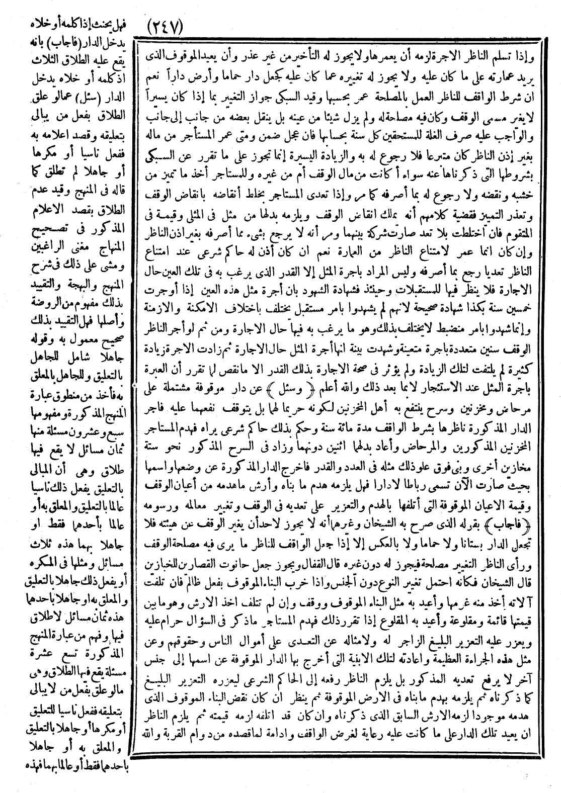 (وَسُئِلَ) عَنْ دَارٍ مَوْقُوفَةٍ مُشْتَمِلَةٍ عَلَى مِرْحَاضٍ وَمَخْزَنَيْنِ وَسَرْحٍ يَنْتَفِعُ بِهِ أَهْلُ الْمَخْزَنَيْنِ لِكَوْنِهِ حَرِيمًا لَهُمَا بَلْ يَتَوَقَّفُ نَفْعُهُمَا عَلَيْهِ فَأَجَّرَ الدَّارَ الْمَذْكُورَةَ نَاظِرُهَا بِشَرْطِ الْوَاقِفِ مُدَّةَ مِائَةِ سَنَةٍ وَحَكَمَ بِذَلِكَ حَاكِمٌ شَرْعِيٌّ يَرَاهُ فَهَدَمَ الْمُسْتَأْجِرُ الْمَخْزَنَيْنِ الْمَذْكُورَيْنِ وَالْمِرْحَاضَ وَأَعَادَ بَدَلَهُمَا اثْنَيْنِ دُونَهُمَا وَزَادَ فِي السَّرْحِ الْمَذْكُورِ نَحْوَ سِتَّةِ مَخَازِينَ أُخْرَى وَبَنَى فَوْقَ عُلُوِّ ذَلِكَ مِثْلَهُ فِي الْعَدَدِ وَالْقَدْرِ فَأَخْرَجَ الدَّارَ الْمَذْكُورَةَ عَنْ وَضْعِهَا وَاسْمِهَا بِحَيْثُ صَارَتْ الْآنَ تُسَمَّى رِبَاطًا لَا دَارًا فَهَلْ يَلْزَمُهُ هَدْمُ مَا بَنَاهُ وَأَرْشُ مَا هَدَمَهُ مِنْ أَعْيَانِ الْوَقْفِ وَقِيمَةُ الْأَعْيَانِ الْمَوْقُوفَةِ الَّتِي أَتْلَفَهَا بِالْهَدْمِ وَالتَّعْزِيرُ عَلَى تَعَدِّيهِ فِي الْوَقْفِ وَتَغْيِيرِ مَعَالِمِهِ وَرُسُومِهِ؟