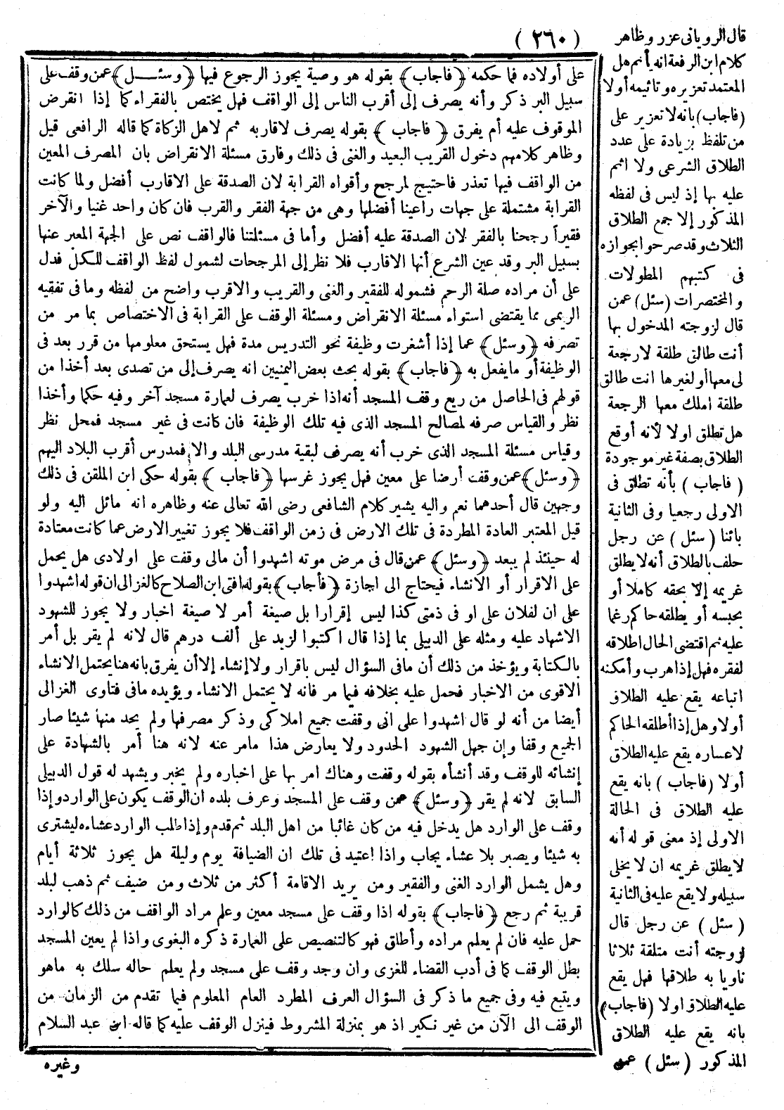 (فَأَجَابَ) بِقَوْلِهِ إذَا وَقَفَ عَلَى مَسْجِدٍ مُعَيَّنٍ وَعُلِمَ مُرَادُ الْوَاقِفِ مِنْ ذَلِكَ كَالْوَارِدِ حُمِلَ عَلَيْهِ فَإِنْ لَمْ يُعْلَمْ مُرَادُهُ وَأُطْلِقَ فَهُوَ كَالتَّنْصِيصِ عَلَى الْعِمَارَةِ ذَكَرَهُ الْبَغَوِيّ وَإِذَا لَمْ يُعَيِّنْ الْمَسْجِدَ بَطَلَ الْوَقْفُ كَمَا فِي أَدَبِ الْقَضَاءِ لِلْغَزِّيِّ وَإِنْ وُجِدَ وَقْفٌ عَلَى مَسْجِدٍ وَلَمْ يُعْلَمْ حَالُهُ سَلَكَ ذَكِرهمْ مَا هُوَ عَلَيْهِ وَيَتْبَعُ فِيهِ وَفِي جَمِيعِ مَا ذُكِرَ فِي السُّؤَالِ الْعُرْفَ الْمُطَّرِدَ الْعَامَّ الْمَعْلُومَ فِيمَا تَقَدَّمَ مِنْ الزَّمَانِ مِنْ الْوَقْفِ إلَى الْآن مِنْ غَيْرِ نَكِيرٍ إذْ هُوَ بِمَنْزِلَةِ الْمَشْرُوطِ فَيَنْزِلُ الْوَقْفُ عَلَيْهِ كَمَا قَالَهُ ابْنُ عَبْدِ السَّلَامِ