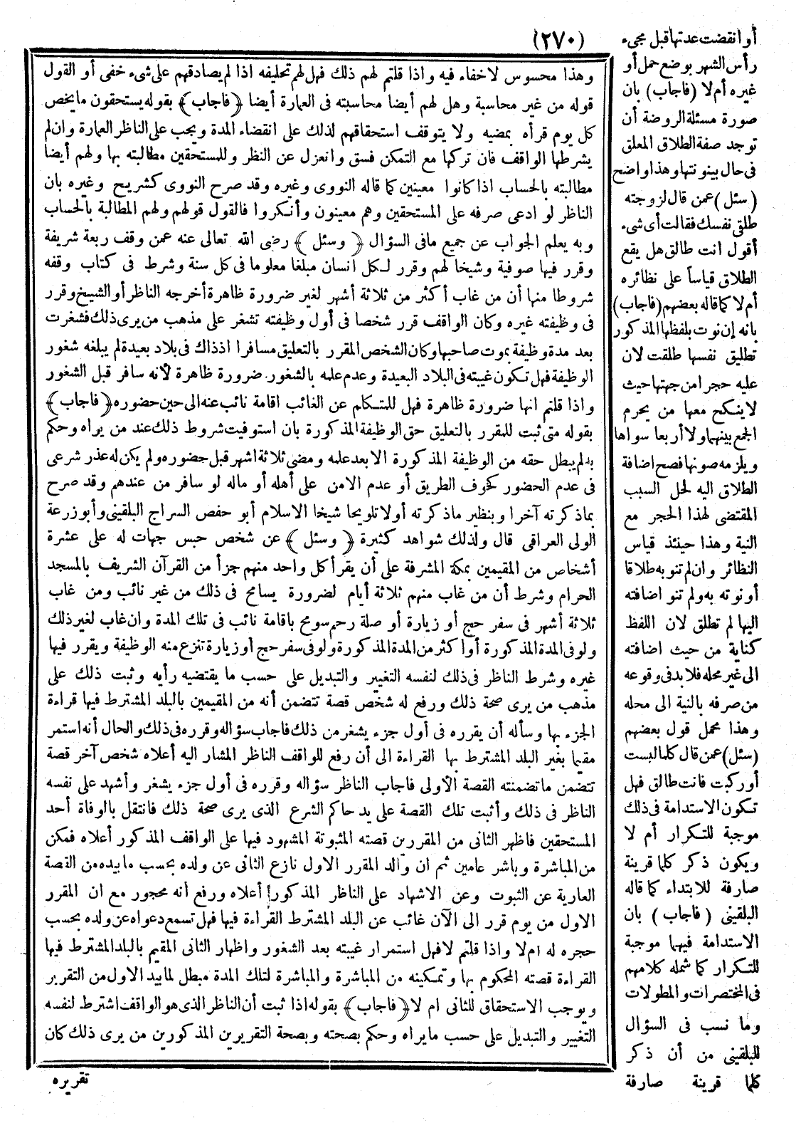 (فَأَجَابَ) بِقَوْلِهِ مَتَى ثَبَتَ لِلْمُقَرَّرِ بِالتَّعْلِيقِ حَقُّ الْوَظِيفَةِ الْمَذْكُورَةِ بِأَنْ اُسْتُوْفِيَتْ شُرُوطُ ذَلِكَ عِنْدَ مَنْ يَرَاهُ وَحَكَمَ بِهِ لَمْ يَبْطُلْ حَقُّهُ مِنْ الْوَظِيفَةِ الْمَذْكُورَةِ إلَّا بَعْد عَمَلِهِ وَمُضِيِّ ثَلَاثَةِ أَشْهُرٍ قَبْلَ حُضُورِهِ وَلَمْ يَكُنْ لَهُ عُذْرٌ شَرْعِيٌّ فِي عَدَمِ الْحُضُورِ كَخَوْفِ الطَّرِيقِ أَوْ عَدَمِ الْأَمْنِ عَلَى أَهْلِهِ أَوْ مَالِهِ لَوْ سَافَرَ مِنْ عِنْدِهِمْ وَقَدْ صَرَّحَ بِمَا ذَكَرْته آخِرًا أَوْ بِنَظِيرِ مَا ذَكَرْته أَوَّلًا تَلْوِيحًا شَيْخَا الْإِسْلَامِ أَبُو حَفْصِ السِّرَاجُ الْبُلْقِينِيُّ وَأَبُو زُرْعَةَ الْوَلِيُّ الْعِرَاقِيُّ قَالَ وَلِذَلِكَ شَوَاهِدُ كَثِيرَةٌ.