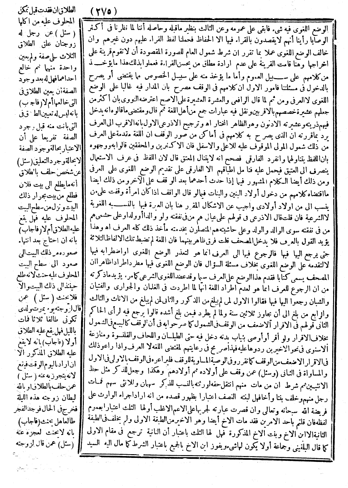 وَمِنْ ذَلِكَ أَيْضًا الْكَلَامُ الْمَشْهُورُ فِيمَا إذَا حَدَّثَ أَحَدُهُمَا بَعْد الْوَقْفِ عَلَى الْآخَرِ وَمِنْ ذَلِكَ أَيْضًا مَا اقْتَضَاهُ كَلَامُهُمْ مِنْ دُخُولِ أَوْلَادِ الْبَنِينَ وَالْبَنَاتِ فِيمَا لَوْ قَالَ الْوَاقِفُ إذَا كَانَ امْرَأَةً وَقَفْت عَلَى مَنْ يُنْسَبُ إلَيَّ مِنْ أَوْلَادِ أَوْلَادِي وَأُجِيبَ عَنْ الْإِشْكَال الْمُقَرَّرِ هُنَا بِأَنَّ الْعِبْرَةَ فِيهَا بِالنِّسْبَةِ اللُّغَوِيَّةِ لَا الشَّرْعِيَّةِ فَإِنْ قُلْت قَالَ الْأَذْرَعِيُّ فِي قَوْلِهِمْ عَلَى عِيَالِي هُمْ مَنْ فِي نَفَقَتِهِ وَلَوْ وَالِدًا أَوْ وَلَدًا وَعَلَى حَشَمِي هُمْ مَنْ فِي نَفَقَتِهِ سِوَى الْوَالِدِ وَالْوَلَدِ وَعَلَى حَاشِيَتِهِ هُمْ الْمُتَّصِلُونَ بِخِدْمَتِهِ مَأْخَذُ ذَلِكَ كُلِّهِ الْعُرْفُ اهـ. وَهَذَا يُؤَيِّدُ الْقَوْلَ بِالْعُرْفِ فَلَا يَدْخُلُ الْمُصْحَفُ قُلْت فَرْقٌ ظَاهِرٌ بَيْنهمَا فَإِنَّ اللُّغَةَ لَمْ تَضْبِط تِلْكَ الْأَلْفَاظَ الثَّلَاثَةَ حَتَّى يَرْجِعَ إلَيْهِمَا فِيهَا فَالرُّجُوعُ فِيهَا إلَى الْعُرْفِ إنَّمَا هُوَ لِتَعَذُّرِ الْوَضْعِ اللُّغَوِيِّ أَوْ اضْطِرَابِهِ فِيهَا لَا لِتَقَدُّمِهِ عَلَى الْوَضْعِ اللُّغَوِيِّ بِخِلَافِ مَسْأَلَةِ السُّؤَالِ فَإِنَّ الْوَضْعَ اللُّغَوِيَّ فِيهَا مُطَّرِدٌ اطِّرَادًا ظَاهِرًا أَنَّ الْمُصْحَفَ يُسَمَّى كِتَابًا فَقُدِّمَ هَذَا الْوَضْعُ عَلَى الْعُرْفِ سِيَّمَا.