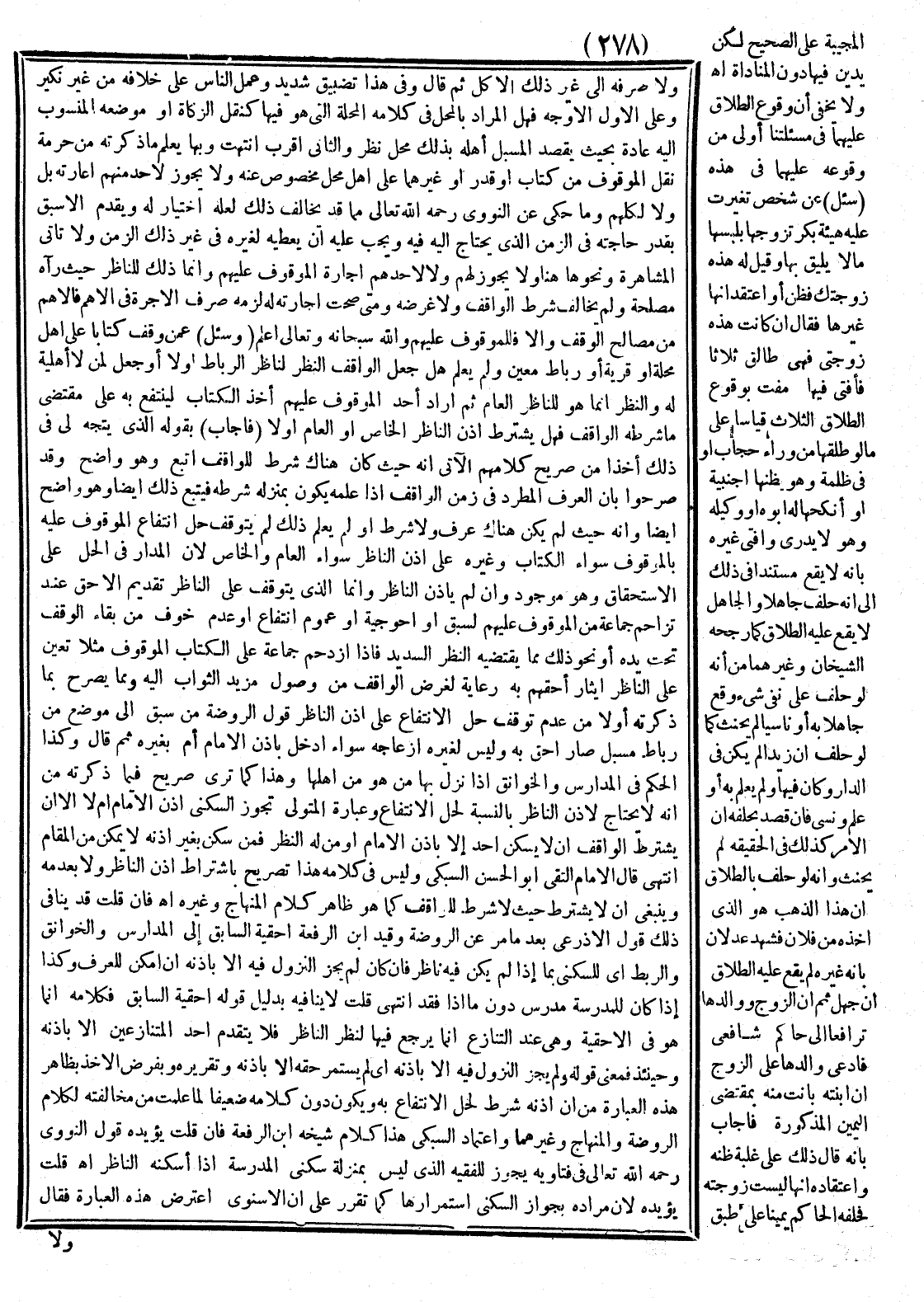 (فَأَجَابَ) بِقَوْلِهِ الَّذِي يَتَّجِهُ لِي فِي ذَلِكَ أَخْذًا مِنْ صَرِيحِ كَلَامِهِمْ الْآتِي أَنَّهُ حَيْثُ كَانَ هُنَاكَ شَرْطٌ لِلْوَاقِفِ اُتُّبِعَ وَهُوَ وَاضِحٌ وَقَدْ صَرَّحُوا بِأَنَّ الْعُرْفَ الْمُطَّرِدَ فِي زَمَنِ الْوَاقِفِ إذَا عَلِمَهُ يَكُونُ بِمَنْزِلَةِ شَرْطِهِ فَيُتَّبَعُ ذَلِكَ أَيْضًا وَهُوَ وَاضِحٌ أَيْضًا وَإِنَّهُ حَيْثُ لَمْ يَكُنْ هُنَاكَ عُرْفٌ وَلَا شَرْطٌ أَوْ لَمْ يُعْلَمْ ذَلِكَ لَمْ يَتَوَقَّفْ حِلُّ انْتِفَاعِ الْمَوْقُوفِ عَلَيْهِ بِالْمَوْقُوفِ سَوَاءٌ الْكِتَابُ وَغَيْرُهُ عَلَى إذْنِ النَّاظِرِ سَوَاءٌ الْعَامُّ وَالْخَاصُّ لِأَنَّ الْمَدَارَ فِي الْحِلِّ عَلَى الِاسْتِحْقَاقِ وَهُوَ مَوْجُودٌ وَإِنْ لَمْ يَأْذَنْ النَّاظِرُ وَإِنَّمَا الَّذِي يَتَوَقَّفُ عَلَى النَّاظِرِ تَقْدِيمُ الْأَحَقِّ عِنْد تَزَاحُمِ جَمَاعَةٍ مِنْ الْمَوْقُوفِ عَلَيْهِمْ لِسَبْقٍ أَوْ أَحْوَجِيَّةٍ أَوْ عُمُومِ انْتِفَاعٍ أَوْ عَدَمِ خَوْفٍ مِنْ بَقَاءِ الْوَقْفِ تَحْت يَدِهِ أَوْ نَحْو ذَلِكَ مِمَّا يَقْتَضِيه النَّظَرُ السَّدِيدُ فَإِذَا ازْدَحَمَ جَمَاعَةٌ عَلَى الْكِتَابِ الْمَوْقُوفِ مَثَلًا تَعَيَّنَ عَلَى النَّاظِرِ إيثَارُ أَحَقَّهُمْ بِهِ رِعَايَةً لِغَرَضِ الْوَاقِفِ مِنْ وُصُولِ مَزِيدِ الثَّوَابِ إلَيْهِ وَمِمَّا يُصَرِّحُ بِمَا ذَكَرْته أَوَّلًا مِنْ عَدَمِ تَوَقُّفِ حَلِّ الِانْتِفَاعِ عَلَى إذْنِ النَّاظِرِ.