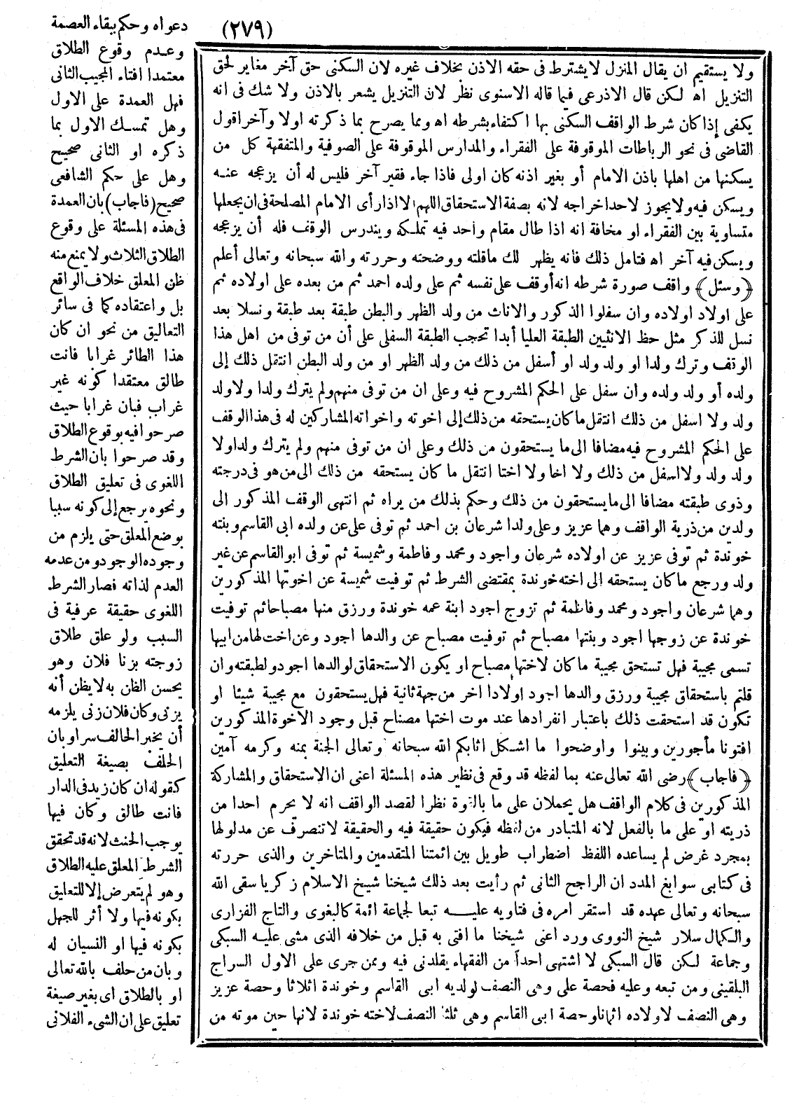 (فَأَجَابَ) - رَضِيَ اللَّهُ تَعَالَى عَنْهُ - بِمَا لَفْظُهُ قَدْ وَقَعَ فِي نَظِيرِ هَذِهِ الْمَسْأَلَةِ أَعْنِي أَنَّ الِاسْتِحْقَاقَ وَالْمُشَارَكَةَ الْمَذْكُورَيْنِ فِي كَلَامِ الْوَاقِفِ هَلْ يُحْمَلَانِ عَلَى مَا بِالْقُوَّةِ نَظَرًا لِقَصْدِ الْوَاقِفِ لَا يَحْرِمُ أَحَدًا مِنْ ذُرِّيَّتِهِ أَوْ عَلَى مَا بِالْفِعْلِ لِأَنَّهُ الْمُتَبَادَرُ مِنْ لَفْظِهِ فَيَكُونُ حَقِيقَةً فِيهِ وَالْحَقِيقَةُ لَا تَنْصَرِفُ عَنْ مَدْلُولِهَا بِمُجَرَّدِ غَرَضٍ لَمْ يُسَاعِدُهُ اللَّفْظُ اضْطِرَابٌ طَوِيلٌ بَيْن أَئِمَّتِنَا الْمُتَقَدِّمِينَ وَالْمُتَأَخِّرِينَ وَاَلَّذِي حَرَّرْته فِي كِتَابِي سَوَابِغُ الْمَدَدِ أَنَّ الرَّاجِحَ الثَّانِي ثُمَّ رَأَيْت بَعْد ذَلِكَ شَيْخَنَا شَيْخَ الْإِسْلَامِ زَكَرِيَّا سَقَى اللَّهُ سُبْحَانَهُ وَتَعَالَى عَهْدَهُ وَقَدْ اسْتَقَرَّ أَمْرُهُ فِي فَتَاوِيهِ عَلَيْهِ تَبَعًا لِجَمَاعَةٍ أَئِمَّةٍ كَالْبَغَوِيِّ وَالتَّاجِ وَالْفَزَارِيِّ وَالْكَمَالِ سَلَّارٍ شَيْخِ النَّوَوِيِّ وَرَدَّ أَعْنِي شَيْخُنَا مَا أَفْتَى بِهِ قَبْلُ مِنْ خِلَافِهِ الَّذِي مَشَى عَلَيْهِ السُّبْكِيّ وَجَمَاعَةٌ لَكِنْ قَالَ السُّبْكِيّ لَا أَشْتَهِي أَحَدًا مِنْ الْفُقَهَاءِ يُقَلِّدُنِي فِيهِ وَمِمَّنْ جَرَى عَلَى الْأَوَّلِ السِّرَاجُ الْبُلْقِينِيُّ وَمَنْ تَبِعَهُ وَعَلَيْهِ فَحِصَّةُ عَلِيٍّ وَهِيَ النِّصْفُ لِوَلَدَيْهِ أَبِي الْقَاسِمِ وخُونْدَةَ أَثْلَاثًا وَحِصَّةُ عَزِيزٍ وَهِيَ النِّصْفُ لِأَوْلَادِهِ أَثْمَانًا وَحِصَّةُ أَبِي الْقَاسِم وَهِيَ ثُلُثَا النِّصْفِ لِأُخْتِهِ خُونْدَةَ لِأَنَّهَا حِين مَوْتِهِ مِنْ
