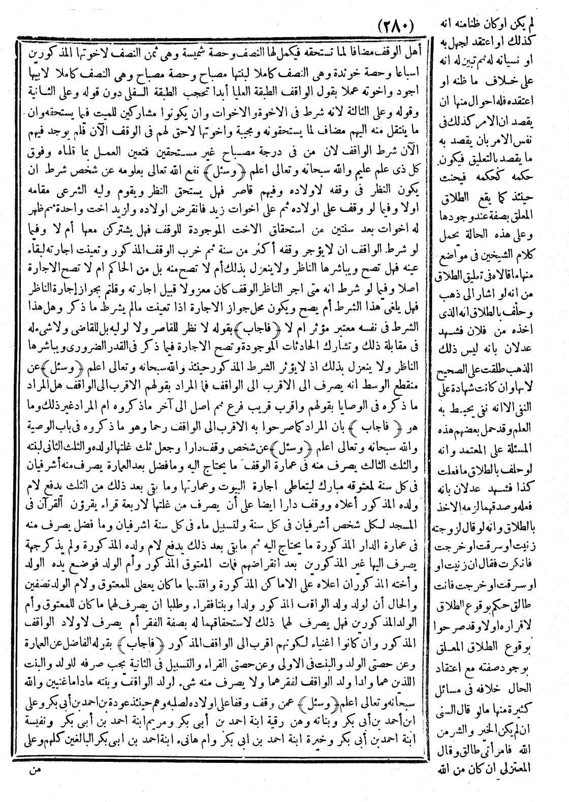 أَهْلِ الْوَقْفِ مُضَافًا لِمَا تَسْتَحِقُّهُ فَيُكَمَّلُ لَهَا النِّصْفُ وَحِصَّةُ شُمَيْسَةَ وَهِيَ ثُمْنُ النِّصْفِ لِإِخْوَتِهَا الْمَذْكُورِينَ أَسْبَاعًا وَحِصَّةُ خُونْدَةَ وَهِيَ النِّصْفُ كَامِلًا لَبِنْتِهَا مِصْبَاحَ وَحِصَّةُ مِصْبَاحَ وَهِيَ النِّصْفُ كَامِلًا لِأَبِيهَا أَجْوَدَ وَإِخْوَته عَمَلًا بِقَوْلِ الْوَاقِفِ الطَّبَقَةُ الْعُلْيَا أَبَدًا تَحْجُبُ الطَّبَقَةَ السُّفْلَى دُون قَوْلِهِ وَعَلَى الثَّانِيَةِ وَقَوْلُهُ وَعَلَى الثَّالِثَةِ لِأَنَّهُ شَرْطٌ فِي الْإِخْوَة وَالْأَخَوَاتِ وَأَنْ يَكُونُوا مُشَارِكِينَ لِلْمَيِّتِ فِيمَا يَسْتَحِقُّهُ وَأَنَّ مَا يَنْتَقِلُ مِنْهُ إلَيْهِمْ مُضَافٌ لِمَا يَسْتَحِقُّونَهُ وَمُجِيبَةُ وَإِخْوَتُهَا لَا حَقَّ لَهُمْ فِي الْوَقْفِ الْآن فَلَمْ يُوجَد فِيهِمْ الْآن شَرْطُ الْوَاقِفِ لِأَنَّ مَنْ فِي دَرَجَةِ مِصْبَاحَ غَيْرَ مُسْتَحِقِّينَ فَتَعَيَّنَ الْعَمَلُ بِمَا قُلْنَاهُ وَفَوْقَ كُلِّ ذِي عِلْمٍ عَلِيمٌ، وَاَللَّهُ سُبْحَانَهُ وَتَعَالَى أَعْلَمُ.