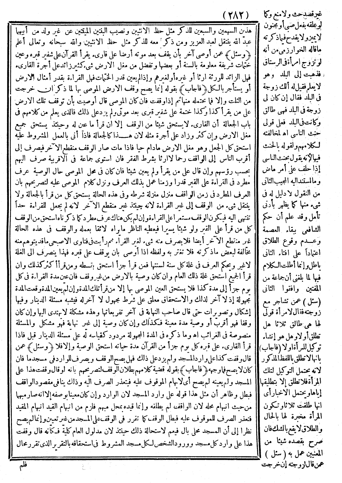 (فَأَجَابَ) بِقَوْلِهِ إنَّمَا يَصِحُّ وَقْفُ الْأَرْضِ الْمُوصَى بِهَا لِمَا ذُكِرَ إنْ خَرَجَتْ مِنْ الثُّلُثِ وَإِلَّا فَمَا يَحْتَمِلُهُ مِنْهَا ثُمَّ إذَا وُقِفَتْ فَإِنْ كَانَ الْمُوصِي قَالَ: أَوْصَيْتُ بِأَنْ تُوَقَّفَ تِلْكَ الْأَرْضُ عَلَى مَنْ يَقْرَأُ كَذَا وَكَذَا خَتْمَةً عَلَى شَفِيرِ قَبْرِي بَعْدَ مَوْتِي وَلَمْ يَزِدْ عَلَى ذَلِكَ فَاَلَّذِي يُعْلَمُ مِنْ كَلَامِهِمْ فِي بَابِ الْجَعَالَةِ أَنَّ الْقَارِئَ لَا يَسْتَحِقُّ شَيْئًا مِنْ الْوَقْفِ إلَّا إنْ قَرَأَ مَا عُيِّنَ لَهُ وَحِينَئِذٍ يَسْتَحِقُّ جَمِيعَ مُغَلِّ الْأَرْضِ وَإِنَّ كَثُرَ وَزَادَ عَلَى أُجْرَةِ مِثْلِهِ لِأَنَّ هَذَا كَالْجَعَالَةِ فَإِذَا أَتَى بِالْعَمَلِ الْمَشْرُوطِ عَلَيْهِ اسْتَحَقَّ كُلَّ الْجُعْلِ وَهُوَ مُغَلُّ الْأَرْضِ مَا دَامَ حَيًّا فَإِذَا مَاتَ صَارَ الْوَقْفُ مُنْقَطِعَ الْآخِرِ فَيُصْرَفُ إلَى أَقْرَبِ النَّاسِ إلَى الْوَاقِفِ رَحِمًا لَا إرْثًا بِشَرْطِ الْفَقْرِ فَإِنْ اسْتَوَى جَمَاعَةٌ فِي الْأَقْرَبِيَّةِ صُرِفَ إلَيْهِمْ بِحَسَبِ رُءُوسِهِمْ.