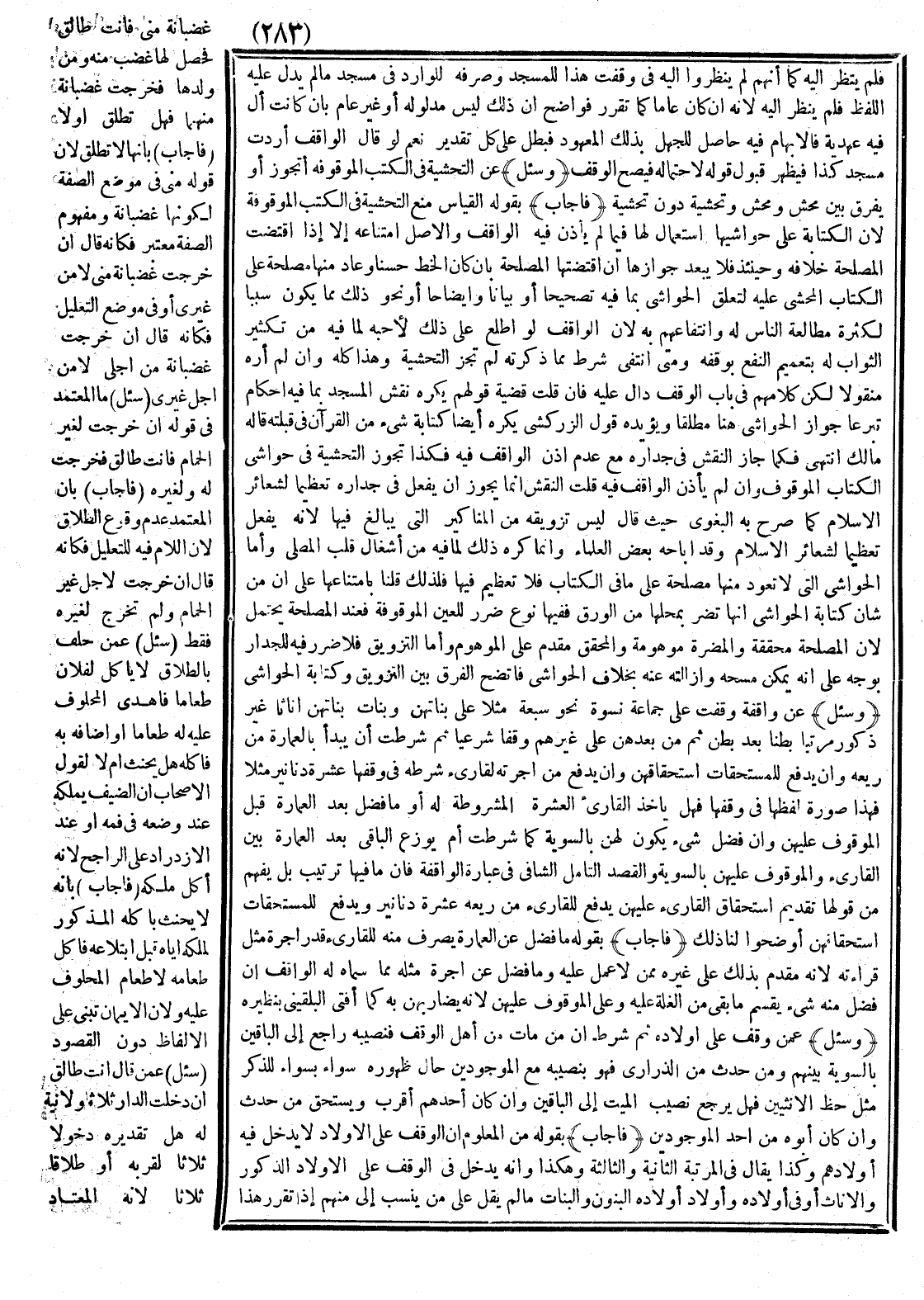 خِلَافُهُ وَحِينَئِذٍ فَلَا يَبْعُدُ جَوَازُهَا إنْ اقْتَضَتْهَا الْمَصْلَحَةُ بِأَنْ كَانَ الْخَطُّ حَسَنًا، وَعَادَ مِنْهَا مَصْلَحَةٌ عَلَى الْكِتَابِ الْمُحَشِّي عَلَيْهِ لِتَعَلُّقِ الْحَوَاشِي بِمَا فِيهِ تَصْحِيحًا أَوْ بَيَانًا وَإِيضَاحًا أَوْ نَحْوَ ذَلِكَ مِمَّا يَكُونُ سَبَبًا لِكَثْرَةِ مُطَالَعَةِ النَّاسِ لَهُ وَانْتِفَاعِهِمْ بِهِ لِأَنَّ الْوَاقِفَ لَوْ اطَّلَعَ عَلَى ذَلِكَ لَأَحَبَّهُ لِمَا فِيهِ مِنْ تَكْثِيرِ الثَّوَابِ لَهُ بِتَعْمِيمِ النَّفْعِ بِوَقْفِهِ وَمَتَى انْتَفَى شَرْطٌ مِمَّا ذَكَرْتُهُ لَمْ تَجُزْ التَّحْشِيَةُ، وَهَذَا كُلُّهُ وَإِنْ لَمْ أَرَهُ مَنْقُولًا لَكِنْ كَلَامُهُمْ فِي بَابِ الْوَقْفِ دَالٌّ عَلَيْهِ، فَإِنْ قُلْتَ قَضِيَّةُ قَوْلِهِمْ: يُكْرَهُ نَقْشُ الْمَسْجِدِ كَمَا فِيهِ أَحْكَامٌ تَبَرُّعًا: جَوَازُ الْحَوَاشِي هُنَا مُطْلَقًا وَيُؤَيِّدُهُ قَوْلُ الزَّرْكَشِيّ: يُكْرَهُ أَيْضًا كِتَابَةَ شَيْءٍ مِنْ الْقُرْآنِ فِي قِبْلَتِهِ، قَالَهُ مَالِكٌ اهـ فَكَمَا جَازَ النَّقْشُ فِي جِدَارِهِ مَعَ عَدَمِ إذْنِ الْوَاقِفِ فِيهِ فَكَذَا تَجُوزُ التَّحْشِيَةُ فِي حَوَاشِي الْكِتَابِ الْمَوْقُوفِ وَإِنْ لَمْ يَأْذَنْ الْوَاقِفُ فِيهِ. قُلْتُ: النَّقْشُ إنَّمَا يَجُوزُ أَنْ يُفْعَلَ فِي جِدَارِهِ تَعْظِيمًا لِشَعَائِرِ الْإِسْلَامِ كَمَا صَرَّحَ بِهِ الْبَغَوِيّ حَيْثُ قَالَ: لَيْسَ تَزْوِيقُهُ مِنْ الْمَنَاكِيرِ الَّتِي يُبَالَغُ فِيهَا لِأَنَّهُ يُفْعَلُ تَعْظِيمًا لِشَعَائِرِ الْإِسْلَامِ، وَقَدْ أَبَاحَهُ بَعْضُ الْعُلَمَاءِ، وَإِنَّمَا كُرِهَ ذَلِكَ لِمَا فِيهِ مِنْ إشْغَالِ قَلْبِ الْمُصَلِّي. وَأَمَّا الْحَوَاشِي الَّتِي لَا تَعُودُ مِنْهَا مَصْلَحَةٌ عَلَى مَا فِي الْكِتَابِ فَلَا تَعْظِيمَ فِيهَا فَلِذَلِكَ قُلْنَا بِامْتِنَاعِهَا عَلَى أَنَّ مِنْ شَأْنِ كِتَابَةِ الْحَوَاشِي أَنَّهَا تَضُرُّ بِمَحَلِّهَا مِنْ الْوَرَقِ فَفِيهَا نَوْعُ ضَرَرٍ لِلْعَيْنِ الْمَوْقُوفَةِ فَعِنْدَ الْمَصْلَحَةِ يُحْتَمَلُ لِأَنَّ الْمَصْلَحَةَ مُحَقَّقَةٌ، وَالْمَضَرَّةُ مَوْهُومَةٌ، وَالْمُحَقَّقُ مُقَدَّمٌ عَلَى الْمَوْهُومِ. وَأَمَّا التَّزْوِيقُ فَلَا ضَرَرَ فِيهِ لِلْجِدَارِ بِوَجْهٍ عَلَى أَنَّهُ يُمْكِنُ مَسْحُهُ وَإِزَالَتُهُ عَنْهُ بِخِلَافِ الْحَوَاشِي فَاتَّضَحَ الْفَرْقُ بَيْنَ التَّزْوِيقِ وَكِتَابَةِ الْحَوَاشِي.