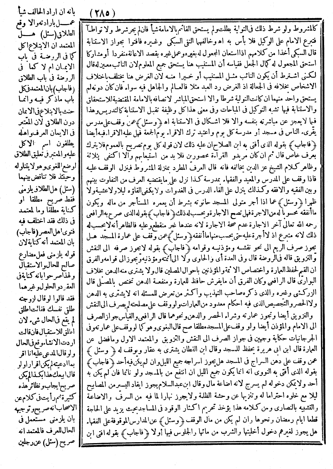 كَالْمَشْرُوطِ وَلَوْ شَرَطَ ذَلِكَ فِي التَّوْلِيَةِ بَطَلَتْ وَلَمْ يَسْتَحِقَّ الْقَائِمُ بِالْإِمَامَةِ شَيْئًا فَإِنْ لَمْ يَجْرِ شَرْطٌ وَلَا تَوَاطَآ فَتَبَرَّعَ الْإِمَامُ عَلَى الْوَكِيلِ فَلَا بَأْسَ بِهِ اهـ وَخَالَفَهُمَا التَّقِيُّ السُّبْكِيّ وَغَيْرُهُ فَأَفْتَوْا بِجَوَازِ الِاسْتِنَابَةِ قَالَ السُّبْكِيّ أَخْذًا مِنْ كَلَامِهِمْ إذَا اسْتَعَانَ الْمَجْعُولُ لَهُ بِغَيْرِهِ وَعَمِلَ غَيْرُهُ بِقَصْدِ الْإِعَانَةِ مُنْفَرِدًا أَوْ مُشَارِكًا اسْتَحَقَّ الْمَجْعُولُ لَهُ كَمَالَ الْجُعْلِ فَقِيَاسُهُ أَنَّ الْمُسْتَنِيبَ هُنَا يَسْتَحِقُّ جَمِيعَ الْمَعْلُومِ لِأَنَّ النَّائِبَ مُعَيِّنٌ لَهُ قَالَ لَكِنِّي أَشْتَرِطُ أَنْ يَكُونَ النَّائِبُ مِثْلَ الْمُسْتَنِيبِ أَوْ خَيْرًا مِنْهُ لِأَنَّ الْغَرَضِ هُنَا يَخْتَلِفُ بِاخْتِلَافِ الْأَشْخَاصِ بِخِلَافِهِ فِي الْجَعَالَةِ إذْ الْغَرَضُ رَدُّ الْعَبْدِ مَثَلًا فَالْعَالِمُ وَالْجَاهِلُ فِيهِ سَوَاءٌ فَإِنْ كَانَ دُونُهُ لَمْ يَسْتَحِقَّ وَاحِدٌ مِنْهُمَا إنْ كَانَتْ التَّوْلِيَةُ شَرْطًا وَإِلَّا اسْتَحَقَّ الْمُبَاشِرُ لِاتِّصَافِهِ بِالْإِمَامَةِ الْمُقْتَضِيَةِ لِلِاسْتِحْقَاقِ وَالِاسْتِنَابَةُ فِيهَا تُشْبِهُ التَّوْكِيلَ فِي الْمُبَاحَاتِ وَفِي مَعْنَى هَذَا كُلُّ وَظِيفَةٍ تَقْبَلُ الِاسْتِنَابَةَ كَالتَّدْرِيسِ وَهَذَا فِيمَا لَا يَعْجَزُ عَنْ مُبَاشَرَتِهِ بِنَفْسِهِ وَإِلَّا فَلَا إشْكَالَ فِي الِاسْتِنَابَةِ اهـ.