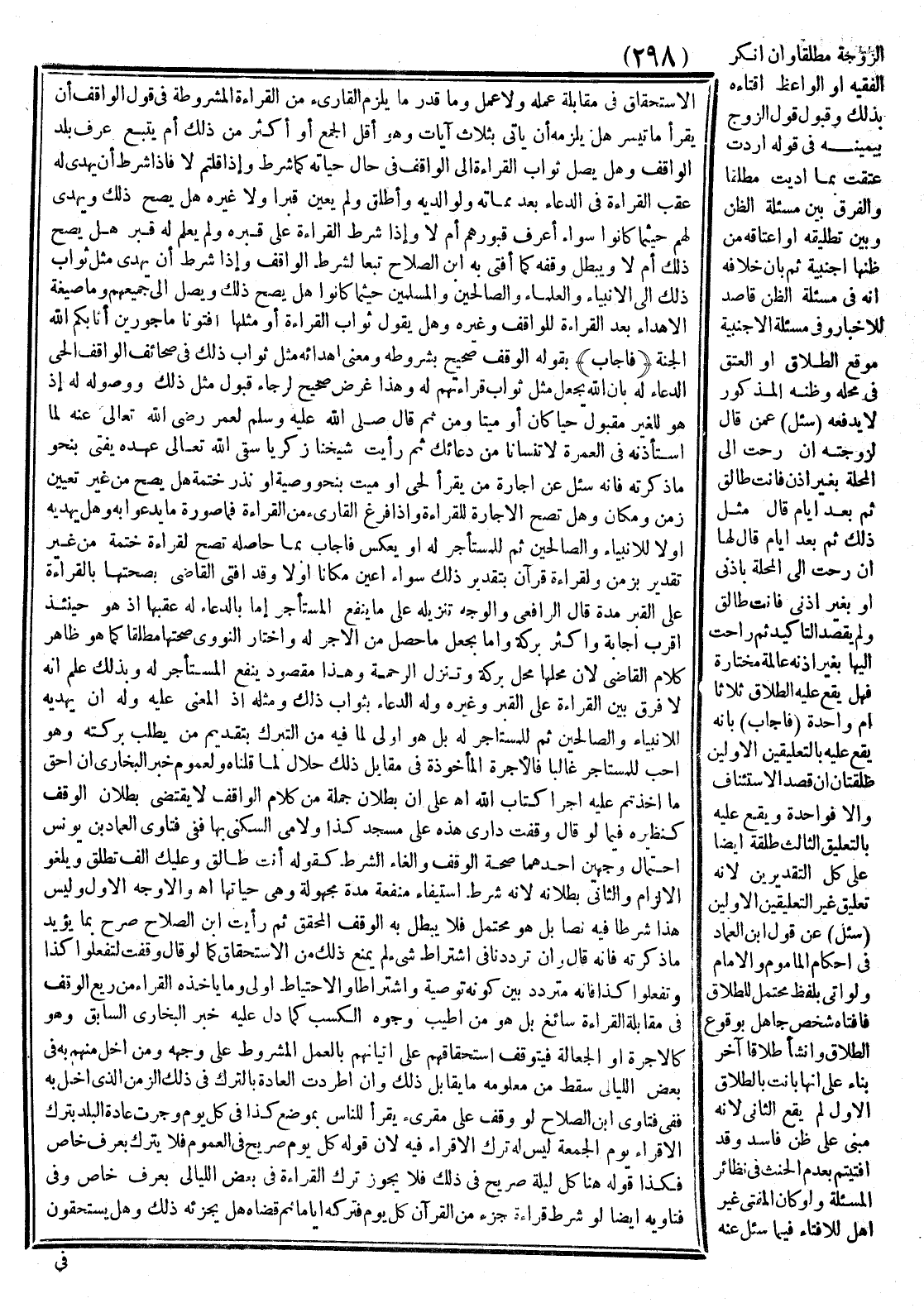 عَلَى أَنَّ بُطْلَانَ جُمْلَة مِنْ كَلَامِ الْوَاقِفِ لَا يَقْتَضِي بُطْلَانَ الْوَقْفِ كَنَظِيرِهِ فِيمَا لَوْ قَالَ وَقَفْت دَارِي هَذِهِ عَلَى مَسْجِدِ كَذَا وَلِأَمِّي السُّكْنَى بِهَا فَفِي فَتَاوَى الْعِمَادِ بْنِ يُونُسَ احْتِمَالُ وَجْهَيْنِ أَحَدُهُمَا صِحَّةُ الْوَقْفِ وَإِلْغَاءُ الشَّرْطِ كَقَوْلِهِ أَنْتِ طَالِقٌ وَعَلَيْك أَلْفٌ تَطْلُقُ، وَيَلْغُو الْإِلْزَامَ وَالثَّانِي بُطْلَانُهُ لِأَنَّهُ شَرَطَ اسْتِيفَاءَ مَنْفَعَةٍ مُدَّةً مَجْهُولَةً وَهِيَ حَيَاتُهَا اهـ وَالْأَوْجُه الْأَوَّلُ وَلَيْسَ هَذَا شَرْطًا فِيهِ نَصَّا بَلْ هُوَ مُحْتَمَلٌ فَلَا يَبْطُلُ بِهِ الْوَقْفُ الْمُحَقَّقُ ثُمَّ رَأَيْت ابْنَ الصَّلَاحِ صَرَّحَ بِمَا يُؤَيِّدُ مَا ذَكَرْته فَإِنَّهُ قَالَ وَإِنْ تَرَدَّدْنَا فِي اشْتِرَاطِ شَيْءٍ لَمْ يَمْنَعْ ذَلِكَ مِنْ الِاسْتِحْقَاقِ كَمَا لَوْ قَالَ وَقَفْت لِتَفْعَلُوا كَذَا وَتَفْعَلُوا كَذَا فَإِنَّهُ مُتَرَدِّدٌ بَيْن كَوْنِهِ تَوْصِيَةً وَاشْتِرَاطًا وَالِاحْتِيَاطُ أَوْلَى وَمَا يَأْخُذُهُ الْقُرَّاءُ مِنْ رَيْعِ الْوَقْفِ فِي مُقَابَلَةِ الْقِرَاءَةِ سَائِغ بَلْ هُوَ مِنْ أَطْيَبِ وُجُوهِ الْكَسْبِ كَمَا دَلَّ عَلَيْهِ خَبَرُ الْبُخَارِيِّ السَّابِقِ وَهُوَ كَالْأُجْرَةِ أَوْ الْجَعَالَةِ فَيَتَوَقَّفُ اسْتِحْقَاقُهُمْ عَلَى إتْيَانِهِمْ بِالْعَمَلِ الْمَشْرُوطِ عَلَى وَجْهِهِ وَمَنْ أَخَلَّ مِنْهُمْ بِهِ فِي بَعْضِ اللَّيَالِي سَقَطَ مِنْ مَعْلُومِهِ مَا يُقَابِلُ ذَلِكَ وَإِنْ أَطَرَدَتْ الْعَادَةُ بِالتَّرْكِ فِي ذَلِكَ الزَّمَنِ الَّذِي أَخَلَّ بِهِ فَفِي فَتَاوَى ابْنِ الصَّلَاحِ لَوْ وَقَفَ عَلَى مُقْرِئٍ يَقْرَأَ لِلنَّاسِ بِمَوْضِعِ كَذَا فِي كُلِّ يَوْمٍ وَجَرَتْ عَادَةُ الْبَلَدِ بِتَرْكِ الْإِقْرَاءِ يَوْمَ الْجُمُعَةِ لَيْسَ لَهُ تَرْكُ الْإِقْرَاءِ فِيهِ لِأَنَّ قَوْلَهُ كُلُّ يَوْمٍ صَرِيحٍ فِي الْعُمُومِ فَلَا يُتْرَكُ بِعُرْفٍ خَاصٍّ فَكَذَا قَوْلُهُ هُنَا كُلُّ لَيْلَةٍ صَرِيح فِي ذَلِكَ فَلَا يَجُوزُ تَرْكُ الْقِرَاءَةِ فِي بَعْضِ اللَّيَالِي بِعُرْفٍ خَاصٍّ وَفِي فَتَاوِيهِ أَيْضًا لَوْ شَرَطَ قِرَاءَةَ جُزْءٍ مِنْ الْقُرْآنِ كُلَّ يَوْمٍ فَتَرَكَهُ أَيَّامًا ثُمَّ قَضَاهُ هَلْ يُجْزِئُهُ ذَلِكَ وَهَلْ يَسْتَحِقُّونَ