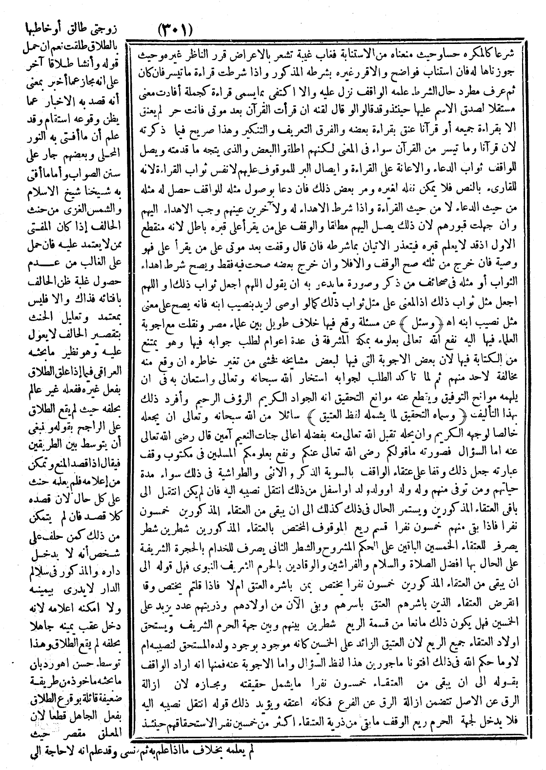 (وَسُئِلَ) عَنْ مَسْأَلَةٍ وَقَعَ فِيهَا خِلَافٌ طَوِيلٌ بَيْن عُلَمَاءِ مِصْرَ وَنُقِلَتْ مَعَ أَجْوِبَةِ الْعُلَمَاءِ فِيهَا إلَيْهِ نَفَعَ اللَّهُ تَعَالَى بِعُلُومِهِ بِمَكَّةَ الْمُشَرَّفَةِ فِي عِدَّةِ أَعْوَامٍ لِطَلَبِ جَوَابِهِ فِيهَا وَهُوَ يَمْتَنِعُ مِنْ الْكِتَابَةِ فِيهَا؛ لِأَنَّ بَعْضَ الْأَجْوِبَةِ الَّتِي فِيهَا لِبَعْضِ مَشَايِخِهِ فَخَشِيَ مِنْ تَغَيُّرِ خَاطِرِهِ إنْ وَقَعَ مِنْهُ مُخَالَفَةٌ لِأَحَدٍ مِنْهُمْ، ثُمَّ لَمَّا تَأَكَّدَ الطَّلَبُ لِجَوَابِهِ اسْتَخَارَ اللَّهَ سُبْحَانَهُ وَتَعَالَى وَاسْتَعَانَ بِهِ فِي أَنْ يُلْهِمَهُ مَوَانِحَ التَّوْفِيقِ وَيَقْطَعَ عَنْهُ مَوَانِعَ التَّحْقِيقِ إنَّهُ الْجَوَّادُ الْكَرِيمُ الرَّءُوفُ الرَّحِيمُ وَأَفْرَدَ ذَلِكَ بِهَذَا التَّأْلِيفِ، وَسَمَّاهُ التَّحْقِيقُ لِمَا يَشْمَلُهُ لَفْظُ الْعَتِيقِ) سَائِلًا مِنْ اللَّهِ سُبْحَانَهُ وَتَعَالَى أَنْ يَجْعَلَهُ خَالِصًا لِوَجْهِهِ الْكَرِيمِ وَأَنْ يَحِلَّهُ، تَقَبَّلَ اللَّهُ تَعَالَى مِنْهُ بِفَضْلِهِ أَعَالِي جَنَّاتِ النَّعِيمِ آمِينَ قَالَ - رَضِيَ اللَّهُ تَعَالَى عَنْهُ - عَنْهُ: أَمَّا السُّؤَالُ فَصُورَتُهُ مَا قَوْلُكُمْ - رَضِيَ اللَّهُ تَعَالَى عَنْكُمْ - وَنَفَعَ بِعُلُومِكُمْ الْمُسْلِمِينَ فِي مَكْتُوبِ وَقْفٍ عِبَارَتُهُ: جُعِلَ ذَلِكَ وَقْفًا عَلَى عُتَقَاءِ الْوَاقِفِ بِالسَّوِيَّةِ الذَّكَر وَالْأُنْثَى وَالطَّوَاشِيَّةِ فِي ذَلِكَ، سَوَاءٌ مُدَّةَ حَيَّاتِهِمْ وَمَنْ تُوُفِّيَ مِنْهُمْ وَلَهُ وَلَدٌ أَوْ وَلَدُ وَلَدٍ أَوْ أَسْفَلَ مِنْ ذَلِكَ، انْتَقَلَ نَصِيبُهُ إلَيْهِ، فَإِنْ لَمْ يَكُنْ انْتَقَلَ إلَى بَاقِي الْعُتَقَاءِ الْمَذْكُورِينَ، وَيَسْتَمِرُّ الْحَالُ فِي ذَلِكَ كَذَلِكَ إلَى أَنْ يَبْقَى مِنْ الْعُتَقَاءِ الْمَذْكُورِينَ خَمْسُونَ نَفَرًا، فَإِذَا بَقِيَ مِنْهُمْ خَمْسُونَ نَفَرًا قُسِّمَ رَيْعُ الْمَوْقُوفِ الْمُخْتَصِّ بِالْعُتَقَاءِ الْمَذْكُورِينَ شَطْرَيْنِ شَطْرٍ: يُصْرَفُ لِلْعُتَقَاءِ الْخَمْسِينَ الْبَاقِينَ عَلَى الْحُكْمِ الْمَشْرُوحِ وَالشَّطْرِ الثَّانِي: يُصْرَفُ لِلْخُدَّامِ بِالْحُجْرَةِ الشَّرِيفَةِ عَلَى الْحَالِّ بِهَا أَفْضَلُ الصَّلَاةِ وَالسَّلَامِ وَالْفَرَّاشِينَ وَالْوَقَّادِينَ بِالْحَرَمِ الشَّرِيفِ النَّبَوِيِّ، فَهَلْ قَوْلُهُ إلَى أَنْ يَبْقَى مِنْ الْعُتَقَاءِ الْمَذْكُورِينَ خَمْسُونَ نَفَرًا يَخْتَصُّ بِمَنْ بَاشَرَهُ الْعِتْقُ أَمْ لَا فَإِذَا قُلْتُمْ يَخْتَصُّ وَقَدْ انْقَرَضَ الَّذِينَ بَاشَرَهُمْ الْعِتْقُ بِأَسْرِهِمْ وَبَقِيَ الْآنَ مِنْ أَوْلَادِهِمْ وَذُرِّيَّتِهِمْ عَدَدٌ يَزِيدُ عَلَى الْخَمْسِينَ، فَهَلْ يَكُون ذَلِكَ مَانِعًا مِنْ قِسْمَةِ الرَّيْعِ شَطْرَيْنِ بَيْنهمْ وَبَيْن جِهَةِ الْحَرَمِ الشَّرِيفِ، وَيَسْتَحِقُّ أَوْلَادُ الْعُتَقَاءِ جَمِيعُ الرَّيْعِ؛ لِأَنَّ الْعَتِيقَ الزَّائِدَ عَلَى الْخَمْسِينَ كَأَنَّهُ مَوْجُودٌ بِوُجُودِ وَلَدِهِ الْمُسْتَحَقِّ لِنَصِيبِهِ أَمْ لَا؟ وَمَا حُكْمُ اللَّهِ فِي ذَلِكَ أَفْتُونَا مَأْجُورِينَ؟