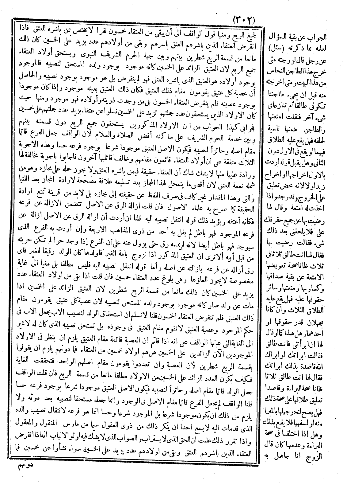 لِجَمِيعِ الرَّيْعِ، وَمِنْهَا قَوْلُ الْوَاقِفِ إلَى أَنْ يَبْقَى مِنْ الْعُتَقَاءِ خَمْسُونَ نَفَرًا لَا يَخْتَصُّ بِمَنْ بَاشَرَهُ الْعِتْقُ، فَإِذَا انْقَرَضَ الْعُتَقَاءُ الَّذِينَ بَاشَرَهُمْ الْعِتْقُ بِأَسْرِهِمْ وَبَقِيَ مِنْ أَوْلَادِهِمْ عَدَدٌ يَزِيد عَلَى الْخَمْسِينَ كَانَ ذَلِكَ مَانِعًا مِنْ قِسْمَةِ الرَّيْعِ شَطْرَيْنِ بَيْنهمْ وَبَيْنَ جِهَةِ الْحَرَمِ الشَّرِيفِ النَّبَوِيِّ، وَيَسْتَحِقُّ أَوْلَادُ الْعُتَقَاءِ جَمِيعَ الرَّيْعِ؛ لِأَنَّ الْعَتِيقَ الزَّائِدَ عَلَى الْخَمْسِينَ كَأَنَّهُ مَوْجُودٌ بِوُجُودِ وَلَدِهِ الْمُسْتَحِقِّ لِنَصِيبِهِ، فَالْمَوْجُودُ بِوُجُودِ أَوْلَادِهِ هُوَ الْعَتِيقُ الَّذِي بَاشَرَهُ الْعِتْقُ فَهُوَ لَمْ يَنْقَرِضْ، بَلْ هُوَ مَوْجُودٌ بِوُجُودِ نَصِيبِهِ، وَالْحَاصِلُ أَنَّ عَصَبَةَ كُلِّ عَتِيقٍ يَقُومُونَ مَقَامَ ذَلِكَ الْعَتِيقِ فَكَأَنَّ ذَلِكَ الْعَتِيقَ بِعَيْنِهِ مَوْجُودٌ وَإِذَا كَانَ مَوْجُودًا بِوُجُودِ عَصَبَتِهِ فَلَمْ يَنْقَرِضْ الْعُتَقَاءُ الْخَمْسُونَ، بَلْ مَنْ وُجِدَتْ ذُرِّيَّتُهُ وَأَوْلَادُهُ، فَهُوَ مَوْجُودٌ وَمِنْهَا حَيْثُ كَانَ الْأَوْلَادُ الَّذِينَ يَسْتَحِقُّونَ عَدَدُ جُمْلَتِهِمْ تَزِيدُ عَلَى الْخَمْسِينَ نَسَلُوا عَنْ الْعُتَقَاءِ يَزِيدُ عَدَدُ جُمْلَتِهِمْ عَلَى خَمْسِينَ، فَجَوَابِي كَهَذَا الْجَوَابِ مِنْ أَنَّ الْأَوْلَادَ الْمَذْكُورِينَ يَسْتَحِقُّونَ جَمِيعَ الرَّيْعِ دُونَ قِسْمَتِهِ بَيْنَهُمْ وَبَيْن خِدْمَةِ الْحَرَمِ الشَّرِيفِ عَلَى سَاكِنِهِ أَفْضَلُ الصَّلَاةِ وَالسَّلَامِ لِأَنَّ الْوَاقِفَ جَعَلَ الْفَرْعَ قَائِمًا مَقَامَ أَصْلِهِ وَحَائِزًا لِنَصِيبِهِ فَيَكُونُ الْأَصْلُ الْعَتِيقُ مَوْجُودًا شَرْعًا بِوُجُودِ فَرْعِهِ حِسًّا.