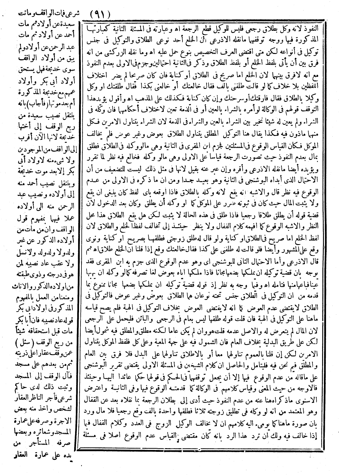 وَالْحَاصِلُ أَنَّ كَلَامَ الشَّيْخَيْنِ فِي الْمَسْأَلَةِ الْأُولَى يَقْتَضِي تَقْرِيرَ الْبُوشَنْجِيِّ عَلَى مَا قَالَهُ مِنْ عَدَم الْوُقُوعِ فِيهَا إلَّا أَنْ يُجْعَلَ تَوَقُّفُهُمَا فِي الْحُكْمِ فِي قَوْلِهِمَا حُكْمًا عَائِدًا إلَيْهَا وَحِينَئِذٍ فَالْأَوْجَهُ مِنْ حَيْثُ الْمَعْنَى وَقِيَاس كَلَامِهِمْ فِي الْوَكَالَة كَمَا قَدَّمْته الْوُقُوعَ فِيهَا وَفِي الثَّانِيَة وَاعْتَرَضَ الْإِسْنَوِيُّ مَا ذَكَرَاهُ هُنَا عَنْهُ مِنْ عَدَمِ النُّفُوذِ حَيْثُ أَدَّى إلَى بُطْلَانِ الرَّجْعَةِ بِمَا نَقَلَاهُ بَعْدُ عَنْ الْقَفَّال وَهُوَ الْمُعْتَمَدُ مِنْ أَنَّهُ لَوْ وَكَّلَهُ فِي تَطْلِيقِ زَوْجَتِهِ ثَلَاثًا فَطَلَّقَهَا وَاحِدَةً بِأَلْفِ وَقَعَ رَجْعِيًّا فَلَا مَال وَرُدَّ بِأَنَّ صُورَةَ مَا هُنَا كَمَا يُومِئُ إلَيْهِ كَلَامُهُمْ أَنْ لَا يُخَالِفَ الْوَكِيلُ الزَّوْجَ فِي الْعَدَدِ وَكَلَامُ الْقَفَّالِ فِيمَا إذَا خَالَفَ فِيهِ وَلَك أَنْ تَرُدَّ هَذَا الرَّدَّ بِأَنَّهُ كَانَ مُقْتَضَى الْقِيَاسِ عَدَمُ الْوُقُوعِ أَصْلًا فِي مَسْأَلَةِ