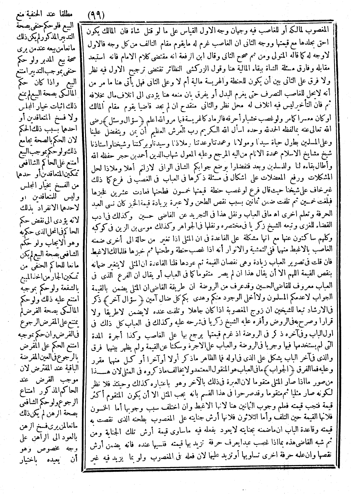 (سُؤَال) وَسُئِلَ - رَضِيَ اللَّهُ تَعَالَى عَنْهُ - بِمَا لَفْظُهُ الْحَمْد لِلَّهِ وَحْدَهُ أَسْأَل اللَّه الْكَرِيم رَبَّ الْعَرْشِ الْعَظِيمِ أَنْ يَمُنَّ وَيَتَفَضَّلَ عَلَيْنَا وَعَلَى الْمُسْلِمِينَ بِطُولِ حَيَاة سَيِّدنَا وَمَوْلَانَا وَعُمْدَتِنَا وَعُدَّتِنَا وَمَلَاذِنَا وَسَيِّدِنَا وَبَرَكَتِنَا وَشَيْخِنَا وَأُسْتَاذِنَا شَيْخِ مَشَايِخِ الْإِسْلَامِ عُمْدَةِ الْأَنَامِ مَنْ إلَيْهِ الْمَرْجِعُ وَعَلَيْهِ الْمُعَوَّلُ شِهَابِ الدَّيْنِ أَحْمَدَ بْنِ حَجَرٍ حَفِظَهُ اللَّهُ وَأَطَالَ بَقَاءَهُ لَنَا وَلِلْمُسْلِمِينَ وَبَعْدُ فَتَفَضَّلُوا بِوَضْعِ جَوَابِكُمْ الشَّافِي الْوَافِي لَا زِلْتُمْ أَهْلًا وَمَلَاذًا لِحَلِّ الْمُشْكِلَاتِ وَرَفْعِ الْمُعْضِلَاتِ عَلَى إشْكَالٍ فِي مَسْأَلَةٍ ذَكَرَهَا فِي الْعُبَابِ فِي الْغَصْبِ فِي فَرْعٍ.