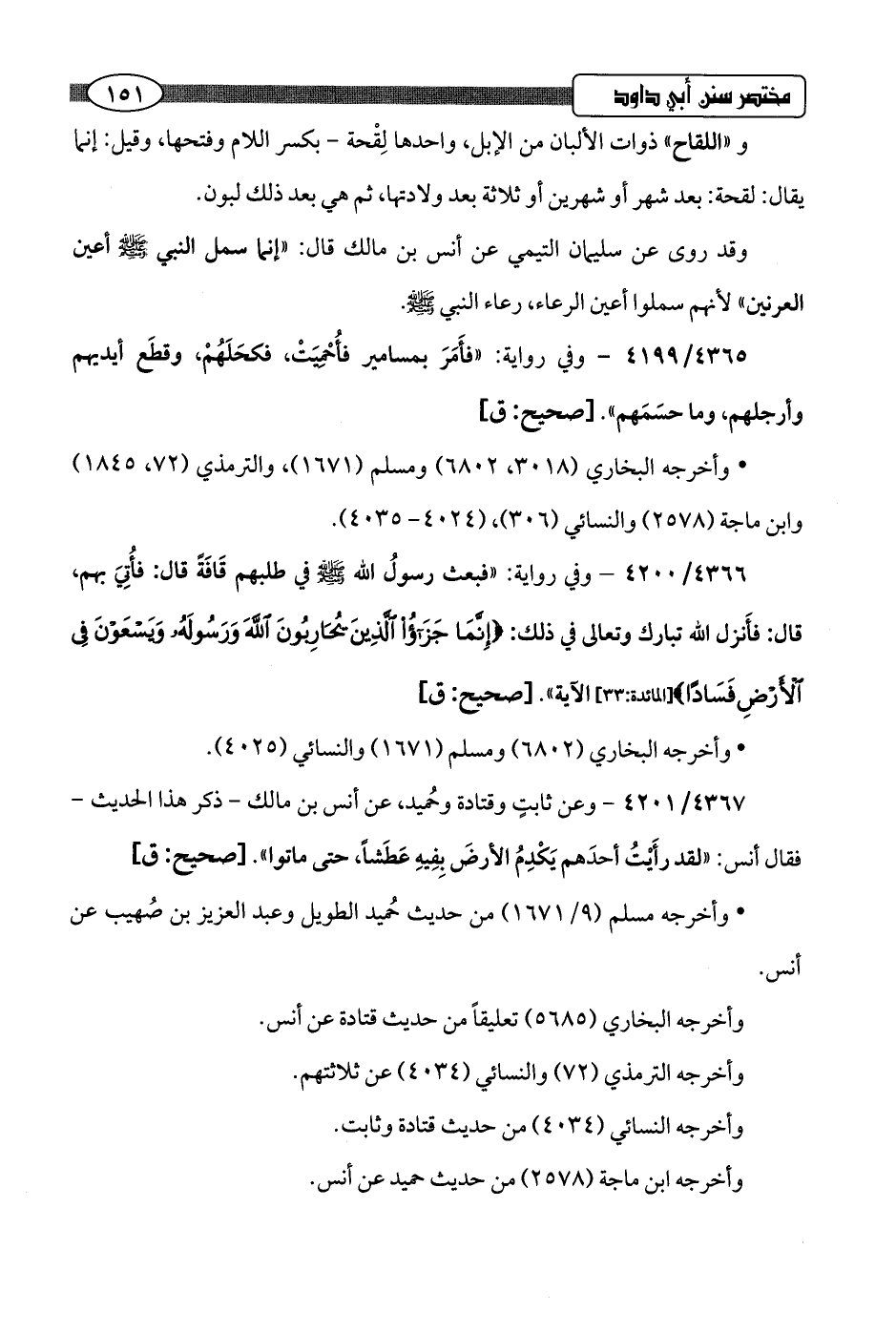 4366/ 4200 - وفي رواية: "فبعث رسولُ اللَّه -صلى اللَّه عليه وسلم- في طلبهم قَافَةً قال: فأُتِيَ بهم، قال: فاَنزل اللَّه تبارك وتعالى في ذلك: {إِنَّمَا جَزَاءُ الَّذِينَ يُحَارِبُونَ اللَّهَ وَرَسُولَهُ وَيَسْعَوْنَ فِي الْأَرْضِ فَسَادًا} [المائدة: 33] الآية".hصحيح: ق]