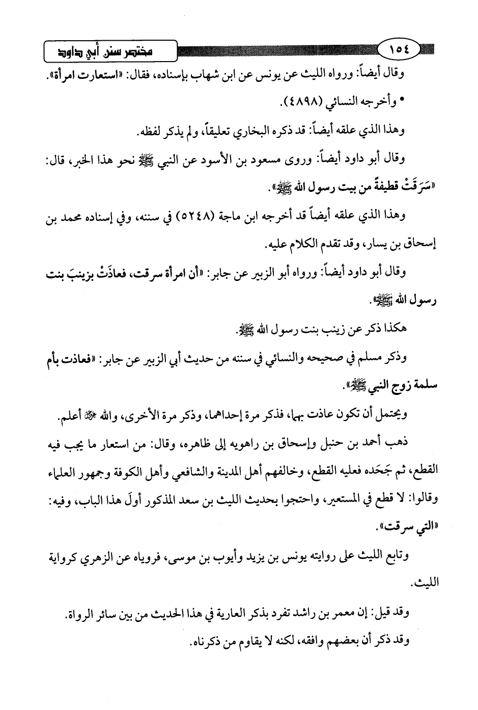 وقال أبو داود أيضًا: ورواه أبو الزبير عن جابر: "أن امرأة سرقت، فعاذَتْ بزينبَ بنت رسول اللَّه -صلى اللَّه عليه وسلم-".