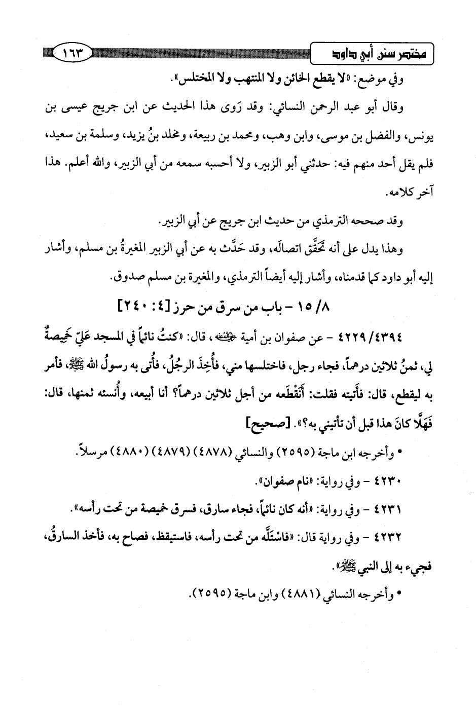 4394/ 4229 - عن صفوان بن أمية -رضي اللَّه عنه-، قال: "كنتُ نائمًا في المسجد عَليّ خَميصةٌ لي، ثمنُ ثلاثين درهمًا، فجاء رجل، فاختلسها مني، فأُخِذَ الرجُلُ، فأُتى به رسولُ اللَّه -صلى اللَّه عليه وسلم-، فأمر به ليقطع، قال: فأَتيته فقلت: أَنَقْطَعه من أجل ثلاثين درهمًا؟ أنا أبيعه، وأُنسئه ثمنها، قال: فَهَلَّا كانَ هذا قبل أن تأتيني به؟ ".hصحيح]