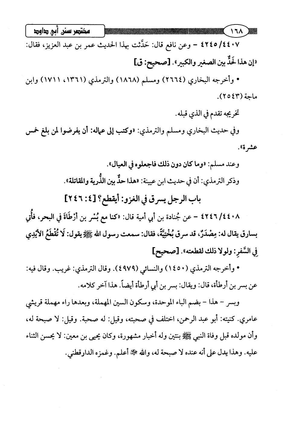 4408/ 4246 - عن جُنادة بن أبي أمية قال: "كنا مع بُسْر بن أرْطَاةَ في البحر، فأُتي بسارق يقال له: مِصْدَرٌ، قد سرق بُخْتِيَّةً، فقال: سمعت رسول اللَّه -صلى اللَّه عليه وسلم- يقول: لَا تُقْطَعُ الأيْدِي فِي السَّفرِ: ولولا ذلك لقطعته".hصحيح]