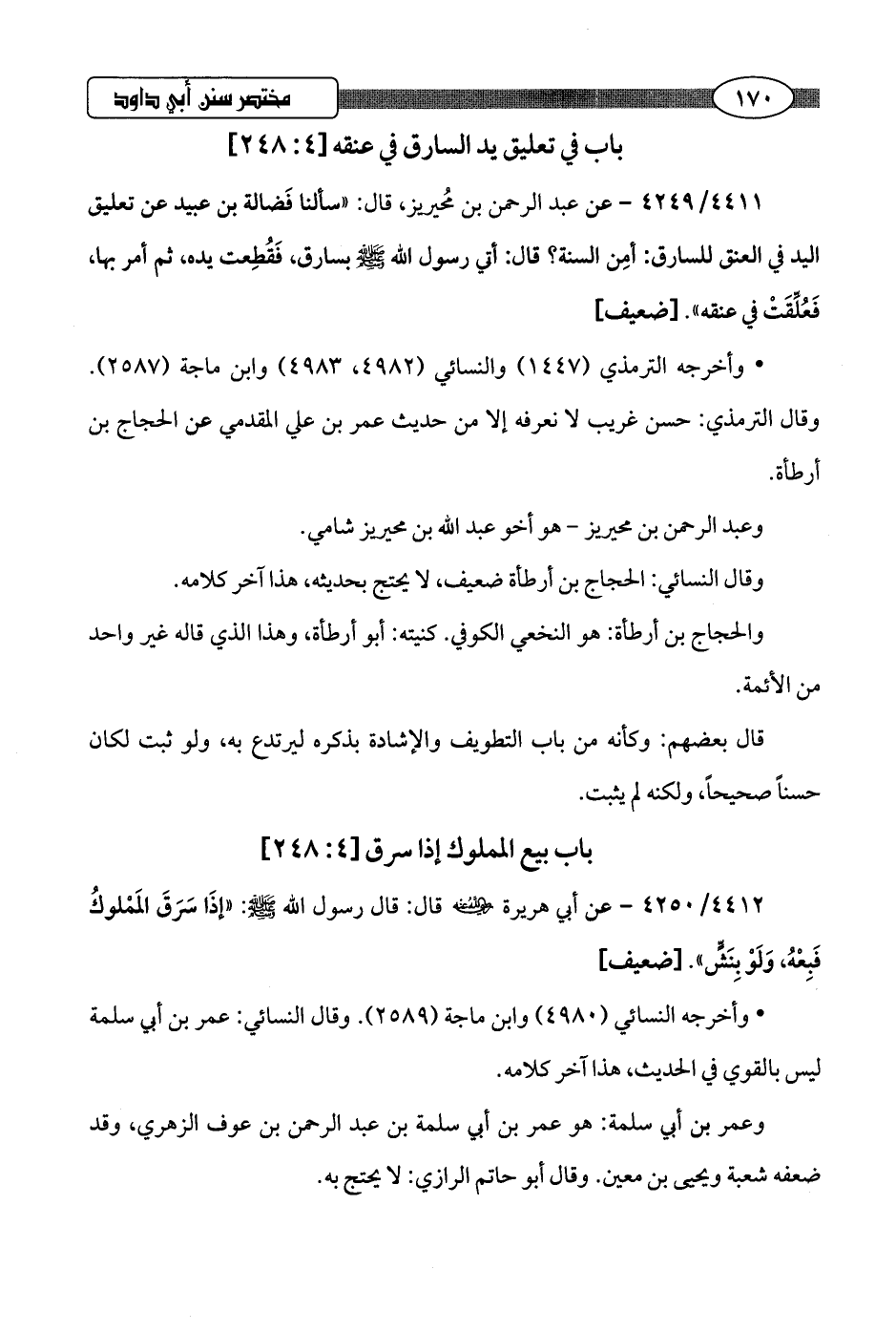 4412/ 4250 - عن أبي هريرة -رضي اللَّه عنه - قال: قال رسول اللَّه -صلى اللَّه عليه وسلم-: "إذًا سَرَقَ المَمْلوكُ فَبِعْهُ، وَلَوْ بِنَشٍّ".hضعيف]