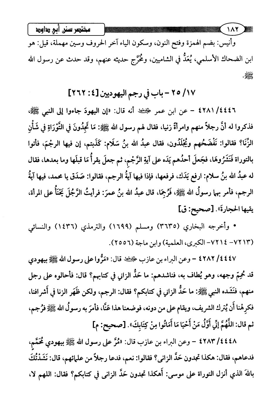 4446/ 4281 - عن ابن عمر -رضي اللَّه عنهما- أنه قال: "إن اليهودَ جاءوا إلى النبي -صلى اللَّه عليه وسلم-، فذكروا له أنَّ رجلًا منهم وامرأةً زنيا، فقال لهم رسول اللَّه -صلى اللَّه عليه وسلم-: مَا تَجِدُونَ في التَّوْرَاةِ في شَأْنِ الزِّنَا؟ فقالوا: نَفْضَحُهم ويُجْلَدُون، فقال عبدُ اللَّه بنُ سَلَام: كَذَبتم، إن فيها الرجْمَ، فأتوا بالتوراة فَنَشَرُوها، فجَعلَ أحدُهم يَدَه على آيةِ الرَّجْمِ، ثم جعلَ يقرأُ مَا قبلَها وما بعدها، فقال له عبدُ اللَّه بنُ سلام: ارفع يَدَك، فرفعها، فإذا فيها آيةُ الرجم، فقالوا: صَدَق يا محمد، فيها آيةُ الرجم، فأمر بهما رسولُ اللَّه -صلى اللَّه عليه وسلم-، فَرُجِمَا، قال عبدُ اللَّه بنُ عمرَ: فرأيتُ الرَّجُلَ يَحْنَأُ على المرأة، يقيها الحجارةَ".hصحيح: ق]