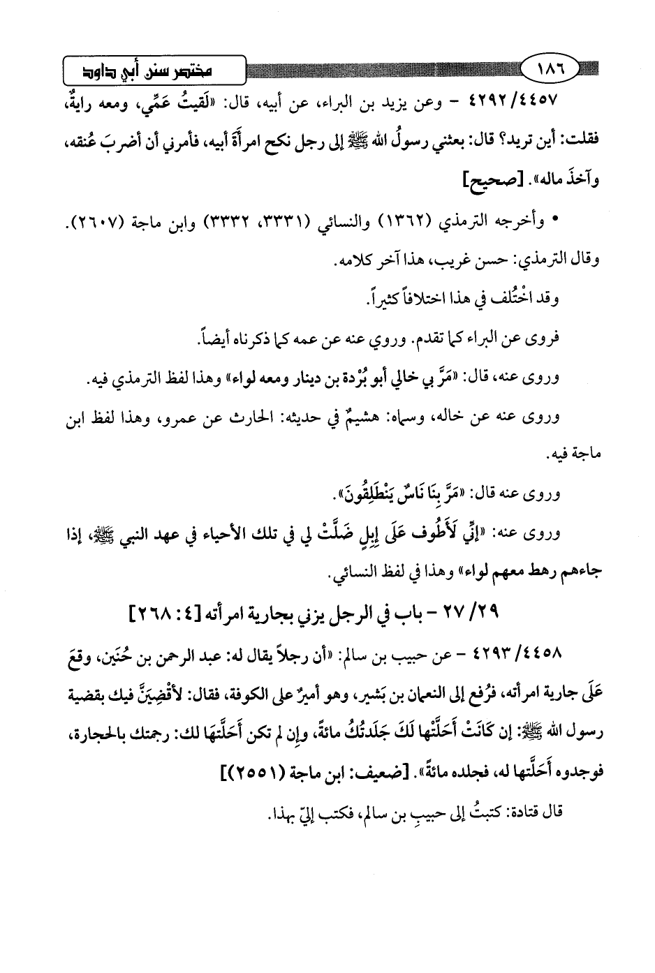 4457/ 4292 - وعن يزيد بن البراء، عن أبيه، قال: "لَقيتُ عَمِّي، ومعه رايةٌ، فقلت: أين تريد؟ قال: بعثني رسولُ اللَّه -صلى اللَّه عليه وسلم- إلى رجل نكح امرأَةَ أبيه، فأمرني أن أضربَ عُنقه، وآخذَ ماله".hصحيح]