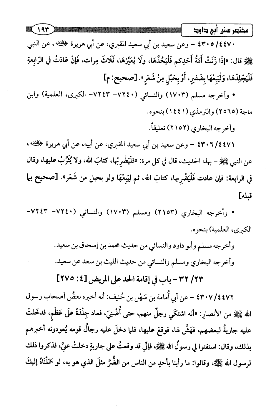 4471/ 4306 - وعن سعيد بن أبي سعيد المقبري، عن أبيه، عن أبي هريرة -رضي اللَّه عنه-، عن النبي -صلى اللَّه عليه وسلم- بهذا الحديث، قال في كل مرة: "فلَيَضْرِبها، كتابَ اللَّه، ولا يُثَرِّبْ عليها، وقال في الرابعة: فإن عادت فَلْيَضْرِبها، كتابَ اللَّه، ثم لِيَبعها ولو بحبل من شَعَر".hصحيح بما قبله]